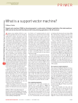 © 2006 Nature Publishing Group http://www.nature.com/naturebiotechnology PRIMER What is a support vector machine? William S Noble Support vector machines (SVMs) are becoming popular in a wide variety of biological applications. But, what exactly are SVMs and how do they work? And what are their most promising applications in the life sciences? A support vector machine (SVM) is a computer algorithm that learns by example to assign labels to objects1. For instance, an SVM can learn to recognize fraudulent credit card activity by examining hundreds or thousands of fraudulent and nonfraudulent credit card activity reports. Alternatively, an SVM can learn to recognize handwritten digits by examining a large collection of scanned images of handwritten zeroes, ones and so forth. SVMs have also been successfully applied to an increasingly wide variety of biological applications. A common biomedical application of support vector machines is the automatic classification of microarray gene expression profiles. Theoretically, an SVM can examine the gene expression profile derived from a tumor sample or from peripheral fluid and arrive at a diagnosis or prognosis. Throughout this primer, I will use as a motivating example a seminal study of acute leukemia expression profiles2. Other biological applications of SVMs involve classifying objects as diverse as protein and DNA sequences, microarray expression profiles and mass spectra3. In essence, an SVM is a mathematical entity, an algorithm (or recipe) for maximizing a particular mathematical function with respect to a given collection of data. The basic ideas behind the SVM algorithm, however, can be explained without ever reading an equation. Indeed, I claim that, to understand the essence of SVM classification, one needs only to grasp four basic concepts: (i) the separating hyperplane, (ii) the maximum-margin hyperplane, (iii) the soft margin and (iv) the kernel function. Before describing an SVM, let’s return to the problem of classifying cancer gene expression profiles. The Affymetrix microarrays employed William S. Noble is in the Departments of Genome Sciences and of Computer Science and Engineering, University of Washington, 1705 NE Pacific Street, Seattle, Washington 98195, USA. e-mail: noble@gs.washington.edu by Golub et al.2 contained probes for 6,817 human genes. For a given bone marrow sample, the microarray assay returns 6,817 values, each of which represents the mRNA levels corresponding to a given gene. Golub et al. performed this assay on 38 bone marrow samples, 27 from individuals with acute lymphoblastic leukemia (ALL) and 11 from individuals with acute myeloid leukemia (AML). These data represent a good start to ‘train’ an SVM to tell the difference between ALL and AML expression profiles. If the learning is successful, then the SVM will be able to successfully diagnose a new patient as AML or ALL based upon its bone marrow expression profile. For now, to allow an easy, geometric interpretation of the data, imagine that the microarrays contained probes for only two genes. In this case, our gene expression profiles consist of two numbers, which can be easily plotted (Fig. 1a). Based upon results from a previous study4, I have selected the genes ZYX and MARCKSL1. In the figure, values are proportional to the intensity of the fluorescence on the microarray, so on either axis, a large value indicates that the gene is highly expressed and vice versa. The expression levels are indicated by a red or green dot, depending upon whether the sample is from a patient with ALL or AML. The SVM must learn to tell the difference between the two groups and, given an unlabeled expression vector, such as the one labeled ‘Unknown’ in the figure, predict whether it corresponds to a patient with ALL or AML. The separating hyperplane The human eye is very good at pattern recognition. Even a quick glance at Figure 1a shows that the AML profiles form a cluster in the upper left region of the plot, and the ALL profiles cluster in the lower right. A simple rule might state that a patient has AML if the expression level of MARCKSL1 is twice as high as the expression level of ZYX, and vice versa for ALL. Geometrically, this rule corresponds NATURE BIOTECHNOLOGY VOLUME 24 NUMBER 12 DECEMBER 2006 to drawing a line between the two clusters (Fig. 1b). Subsequently, predicting the label of an unknown expression profile is easy: one simply needs to ask whether the new profile falls on the ALL or the AML side of this separating line. Now, to define the notion of a separating hyperplane, consider a situation in which the microarray does not contain just two genes. For example, if the microarray contains a single gene, then the ‘space’ in which the corresponding one-dimensional expression profiles reside is a one-dimensional line. We can divide this line in half by using a single point (Fig. 1c). In two dimensions (Fig. 1b), a straight line divides the space in half, and in three dimensions, we need a plane to divide the space (Fig. 1d). We can extrapolate this procedure mathematically to higher dimensions. The general term for a straight line in a high-dimensional space is a hyperplane, and so the separating hyperplane is, essentially, the line that separates the ALL and AML samples. The maximum-margin hyperplane The concept of treating the objects to be classified as points in a high-dimensional space and finding a line that separates them is not unique to the SVM. The SVM, however, is different from other hyperplane-based classifiers by virtue of how the hyperplane is selected. Consider again the classification problem portrayed in Figure 1a. We have now established that the goal of the SVM is to identify a line that separates the ALL from the AML expression profiles in this two-dimensional space. However, many such lines exist (Fig. 1e). Which one provides the best classifier? With some thought, one may come up with the simple idea of selecting the line