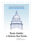 Term Limits: A Reform that Works by Patrick Basham edited by MacMillin Slobodien, Exeutive Director of Our Generation ★ ★ ★ ★ Reform that ★Term Limits: ★ A★ ★Works★ ★ ★ ★ ★ Introduction Term limits are the most significant institutional change in American politics since the reform era of the 1960s and 1970s.1 Passage of Term Limits legislation over the past 15 years continue to have a positive impact in state legislatures around the country. The first states to vote on implementing term limits were California, Colorado and Oklahoma in 1990, and the most recent state was Nebraska in 2000. In all, voters in 21 states have approved legislative term limits. However, the limits were either repealed by fearful legislatures (Idaho and Utah) or thrown out by state courts (Massachusetts, Oregon, Washington and Wyoming) in six states, leaving 15 states with term limits currently on the books, while others are debating their adoption. By 2010, term limits were in operation in all 15 affected states. Consequently, 2,244 state legislators have termed out since 1996. Furthermore, 17,000 local politicians in 2,900 cities, counties and towns throughout 40 states are now subject to term limits. At the national level, between 1990 and 1994, 22 states amended their constitutions by imposing term limits on Members of Congress. Many legal scholars consider this to be the largest grassroots movement in modern American history. In 1995, a slim five-to-four majority in the U.S. Supreme Court derailed the movement at the federal level, ruling that state-initiated congressional term limits are unconstitutional. Nonetheless, the movement resurfaced in 2010, as the populist Tea Party seized upon term limits as one instrument through which America’s political system could be restored to its founding principles. As a consequence of the publicity, the Tea Party revitalized public support for a proposed term limits amendment to the U.S. Constitution. We are now able to move beyond mere speculation and assess the available sample of term-limited states. Although largely positive, the effects of term limits vary with the length and severity of the legislative service restriction. Predictably, term limits have had the largest impact in states in which there was the greatest potential for change. The balance of the available research evidence supports the following four conclusions: 1. term limits stimulate electoral competition in state legislative elections; 2. term limits enable nontraditional candidates to run for seats in state legislatures; 3. term limits weaken the leadership of state legislatures because they weaken seniority systems in those bodies; and, 4. term limits promote/advance public policies compatible with limited government. Overall, term limits foster more energetic, more ideological, and more effective deliberative legislative bodies. 1 See, for example, the Joint Project on Term Limits, quoted in Matthew C. Moen, et al., Changing Members: The Maine Legislature in the Era of Term Limits (Lanham, MD: Lexington Books, 2005) 2. 1. ★ ★ ★ ★ Reform that ★Term Limits: ★ A★ ★Works★ ★ ★ ★ ★ History of Term Limits Term limits are not a new concept.2 The historical roots of term limits go as far back as Athenian democracy in the fifth century B.C. 3 and are grounded in traditional republican and classical liberal models of limited, democratic government.4 In Colonial America, term limits were referred to as the “rotary system,” or the principle of “rotation in office.”5 The New England Colony’s charter provided for the rotation of public officials and a limit on years of office-holding. By 1777, seven (of the 10) new state constitutions provided for rotation in office.6 Convened in 1777, the Continental Congress approved the Articles of Confederation that became the nation’s first constitution in 1781. The articles included rotation of offices and limited federal legislators to a maximum of three years in Congress.7 In 1787, the Constitutional Convention in Philadelphia revised the Articles of Confederation, thereby producing the nation’s second constitution. Clearly, the Framers intended the country to be governed by successive citizen congresses. After all, as Gale Norton, a former U.S. Interior Secretary and a former Colorado Attorney General, reminds us: “The Framers… lived in a different time. Congress as they envisioned it did not need term limits, because Congressional service as they envisioned it was always going to be a part-time job.... That assumption, understandable in its day, allowed the Framers to believe that Congress would just naturally remain a citizen legislature, without any Constitutional requirement that those serving in Congress not spend their entire lives there.”8 The Framers debated the idea of mandatory rotation but, confident that sufficient safeguards (such as short terms in office and voluntary retirements) were in place to forestall careerism and concerned that its inclusion meant “entering into too much detail” for a short document,9 they set aside the arguments of the anti-Federalists and chose not to include a term limits provision in the new Constitution. Moreover, President George Washington’s voluntary retirement after his second term in office established a precedent that held among occupants of the White House until the mid-20th century administration of Franklin D. Roosevelt.10 As Mark P. Petracca establishes, “A general aversion to making a career of legislative service also characterized state and local politicians.”11 At the state level, gubernatorial term limits have been commonplace throughout our nation’s history.12 2 Steven Millman, “Term Limitations: Throwing Out the Bums—Or the Baby with the Bathwater?” http://web.mit/edu/ millman/www/WPSA.html. 3 See, for example, A.H.M. Jones, Athenian Democracy (Baltimore: Johns Hopkins University Press, 1986) 105. 4 See, for example, 