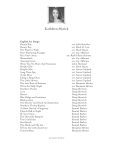 Kathleen Myrick English Art Songs: Danny Boy! ! ! ! ! ! Danny Boy! ! ! ! ! ! The Water is Wide! ! ! ! ! Poor Wayfaring Stranger!! ! ! He’s Gone Away ! ! ! ! ! Shenandoah! ! ! ! ! ! Amazing Grace!! ! ! ! ! Weep You No More, Sad Fountains!! Simple Gifts! ! ! ! ! ! Simple Gifts! ! ! ! ! ! Long Time Ago! ! ! ! ! At the River! ! ! ! ! ! Ching-a-Ring Chaw!! ! ! ! The Little Horses! ! ! ! ! The Last Rose of Summer! ! ! Oft in the Stilly Night! ! ! ! Southern Fiction! ! ! ! ! Love!! ! ! ! ! ! ! Sisters! ! ! ! ! ! ! Blue Ridge and Louisiana!! ! ! Blackwoman! ! ! ! ! ! The Electric Acid Kool-Aid Immersion Southern Fiction Reprise!! ! ! At Saint Patrick's Purgatory! ! ! Church Bell at Night! ! ! ! St. Ita's Vision!! ! ! ! ! The Heavenly Banquet! ! ! ! The Crucifixion! ! ! ! ! Sea-Snatch! ! ! ! ! ! The Monk and His Cat! ! ! ! Tell me the truth about love ! ! ! Funeral Blues! ! ! ! ! ! ! ! ! ! ! ! ! ! ! ! ! ! ! ! ! ! ! ! ! ! ! ! ! ! ! ! ! ! ! ! ! ! KATHLEEN MYRICK ! arr. Julie Knowles ! arr. Mark D. Lew ! arr. Mark Hayes ! arr. Jay Althouse arr. Ruth Elaine Schram ! arr. Jay Althouse ! arr. Jay Althouse ! John Dowland ! arr. Mark Hayes ! arr. Aaron Copland ! arr. Aaron Copland ! arr. Aaron Copland ! arr. Aaron Copland ! arr. Aaron Copland ! arr. Benjamin Britten ! arr. Benjamin Britten ! Doug Borwick ! Doug Borwick ! Doug Borwick ! Doug Borwick ! Doug Borwick ! Doug Borwick ! Doug Borwick ! Samuel Barber ! Samuel Barber ! Samuel Barber ! Samuel Barber ! Samuel Barber ! Samuel Barber ! Samuel Barber ! Benjamin Britten ! Benjamin Britten Johnny! ! ! ! ! ! ! Calypso! ! ! ! ! ! ! Lord Jesus Christ!! ! ! ! ! Cabin ! ! ! ! ! ! ! The Leprechaun! ! ! ! ! Johnny, I hardly knew ye!! ! ! Beautiful Dreamer ! ! ! ! ! Drink To Me Only With Thine Eyes! Entreat Me Not to Leave Thee!! ! Where E’re You Walk! ! ! ! Sure on This Shining Night! ! ! The Call! ! ! ! ! ! ! Bendemeer’s Stream!! ! ! ! Pretty Polly Oliver! ! ! ! ! The Mermaid’s Song! ! ! ! The Prophecy! ! ! ! ! ! The Lamb and the Dove! ! ! ! Vedic Hymns! ! ! ! ! ! The Rose!! ! ! ! ! ! Twilight Fancies! ! ! ! ! Cherish the Treasure! ! ! ! ! ! Benjamin Britten ! ! Benjamin Britten ! ! Samuel Barber ! ! Paul Bowles ! Patrick Weston Joyce ! ! Traditional ! Stephen Collins Foster ! Old English Folk-Song ! ! Charles Gounod ! ! G. F. Händel ! ! Samuel Barber ! ! R. Vaughan Williams ! ! arr. Van A. Christy Seventeenth Century Tune ! ! Joseph Haydn ! ! Alec Rowley ! ! Rossetti & Gibbs ! ! Gustav Holst ! ! Joseph W. Clokey ! ! Frederick Delius ! ! Jon Mohr Italian Art Song: Vergin, tutto amor! ! ! ! Sento nel Core!! ! ! ! Vado ben spesso cangiando loco! Amarilli, mia bella! ! ! ! Nel cor più non mi sento! ! ! Lasciatemi morire!! ! ! ! Pietà, Signore!!! ! ! ! Pur dicesti, o bocca bella!! ! Caro mio ben! ! ! ! ! Vergin, tutto amor! ! ! ! Sebben, crudele! ! ! ! Vaghissima sembianza! ! ! O del mio amato ben! ! ! Madonna Renzuola!! ! ! ! ! ! ! ! ! ! ! ! ! ! ! ! ! ! ! ! ! ! ! ! ! ! ! ! ! ! ! KATHLEEN MYRICK ! ! ! ! ! ! ! ! ! ! ! ! ! ! PAGE 2 Francesco Durante Alessandro Scarlatti Salvatore Rosa Giulio Caccini Giovanni Paisiello Claudio Monteverdi Alessandro Stradella Antonio Lotti Giuseppe Giordani Francesco Durante Antonio Caldara Stefano Donaudy Stephano Donaudy Stephano Donaudy French Art Songs: Que ne suis-je la fougère!! Bergère légère!! ! ! Philis, plus avare que tender! Violin! ! ! ! ! Chanson d'Amour! ! ! Notre Amour! ! ! ! Les Rose d’Ispahan! ! ! L’Invitation au Voyage! ! Extase! ! ! ! ! Chanson Triste!! ! ! La Vie Antérieure! ! ! Beau Soir!! ! ! ! The Palms! ! ! ! Crucifixus! ! ! ! Accompagnement! ! ! Adieu! ! ! ! ! Après un Reve!! ! ! Le Secret!! ! ! ! Mandoline! ! ! ! Claire de Lune!! ! ! Claire de Lune!! ! ! ! ! ! ! ! ! ! ! ! ! ! ! ! ! ! ! ! ! ! ! ! ! ! ! ! ! ! ! ! ! ! ! ! ! ! ! ! ! ! ! ! ! ! ! ! ! ! ! ! ! ! ! ! ! ! ! ! ! ! ! ! ! ! ! ! ! ! ! ! ! ! ! ! ! ! ! ! ! ! ! ! ! ! ! arr. J. B. Weckerlin arr. J. B. Weckerlin J. B. Weckerlin Frances Poulenc Gabriel Fauré Gabriel Fauré Gabriel Fauré Henri Duparc Henri Duparc Henri Duparc Henri Duparc Claude Debussy Jean-Baptiste Faure Jean-Baptiste Faure Gabriel Fauré Gabriel Fauré Gabriel Fauré Gabriel Fauré Gabriel Fauré Gabriel Fauré Claude Debussy German Art Songs: Ruhe, meine Seele! ! ! Cäcilie! ! ! ! ! Heimliche Aufforderung! ! Morgen!! ! ! ! ! Gretchen am Spinnrade! ! An Die Musik!! ! ! Schwanengesang! ! ! Leiden der Trennung! ! Harfenspieler! ! ! ! Lied der Mignon! ! ! Der Musensohn! ! ! Frohsinn! ! ! ! ! Minnelied!! ! ! ! Lilla an die Morgenröthe!! ! ! ! ! ! ! ! ! ! ! ! ! ! ! ! ! ! ! ! ! ! ! ! ! ! ! ! ! ! ! ! ! ! ! ! ! ! ! ! ! ! ! ! ! ! ! ! ! ! ! ! ! ! ! ! ! Richard Strauss Richard Strauss Richard Strauss Richard Strauss Franz Schubert Franz Schubert Franz Schubert Franz Schubert Franz Schubert Franz Schubert Franz Schubert Franz Schubert Franz Schubert Franz Schubert KATHLEEN MYRICK PAGE 3 Der Nussbaum!! ! ! ! ! ! ! Die Lotosblume! ! ! ! ! ! ! Widmung!! ! ! ! ! ! ! ! Nun seh’ ich wohl, warum so dunkle Flammen!! Oft denk’ ich, sie sind nur ausgegangen!! ! ! In diesem Wetter!! ! ! ! ! ! ! Ich Liebe dich!! ! ! ! ! ! ! Du Ring an meinem Finger! ! ! ! ! Bist du bei Mir!! ! ! ! ! ! ! Nacht ! ! ! ! ! ! ! ! ! Schilflied!! ! ! ! ! ! ! ! Die Nachtigall!! ! ! ! ! ! ! Traumgekrönt! ! ! ! ! ! ! ! Im Zimmer! ! ! ! ! ! ! ! Liebesode!! ! ! ! ! ! ! ! Sommertage! ! ! ! ! ! ! ! Dank sei Dir, Herr! ! ! ! ! ! ! Still wie die nacht ! ! ! ! ! ! ! Abendempfindung! ! ! ! ! ! ! An Chloë!! ! ! ! ! ! ! ! Als Luise die Briefe ihres ungetreuen ! ! ! Gesegnet sei! ! ! ! ! ! ! ! Robert Schumann Robert Schumann Robert Schumann Gustav Mahler Gustav Mahler Gustav Mahler Edvard Grieg Robert Schumann G.H. Stölzel Alban Berg Alban Berg Alban Berg Alban Berg Alban Berg Alban Berg Alban Berg Siegfried Ochs Carl Bohm W. A. Mozart W. A. Mozart W. A. Mozart Hugo Wolf Latin Art Songs: Agnus Dei! ! Ave Maria! ! Ave Maria! ! Laudate Dominum! Panis Angelicus! Alleluia! ! ! Laudamus te! ! Exsultate Jubilate! ! ! ! ! ! ! ! ! 