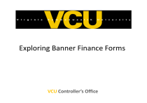 Exploring Banner Finance Forms VCU Controller’s Office What are Banner Forms? Financial information for Banner funds, orgs and transactions are returned in Internet Native Banner (INB) on Banner Forms. Each form allows the user to view specific information and perform specific tasks. In this training module we will explore some of the most commonly used Banner forms, discuss their purpose and how to interpret the information retrieved. Let’s begin with some information you’ll need to know in order to navigate and understand the information presented on Banner Finance Forms. What’s in a Name? Banner uses a 7 character name for all forms, tables and processes. This naming convention helps organize hundreds of forms and processes in logical order determined by character position. At first, the names can seem odd or hard to remember, but once you understand the naming conventions, the Banner form acronyms will become second nature. Each position (character) of the Banner Form name represents a system, module or identifies the purpose of the form. Let’s look at an example. Banner Finance form FGIDOCR = Finance, General Ledger, Inquiry, Document Retrieval form. Position 1, F for Finance, identifies the primary Banner system. Other system identifiers include: G=General N=Position Control P=HR/Payroll Personnel R=Financial Aid S=Student T=Accounts Receivable What’s in a Name? Banner form FGIDOCR: Position 2, G for General Ledger, identifies the module within the system. Other Finance modules include: A=Accounts Payable O=Operations B=Budget Development P=Purchasing C=Cost Accounting R=Research Accounting Position 3, I for Inquiry, identifies the type of form, report, job or table. Other types of forms include: A=Application Q=Query B=Base Table R=Rule Table M=Maintenance V=Validation Positions 4-7, DOCR for Document Retrieval, are an abbreviation of the form’s description name. Other examples of form names include: IDEN=Identification ENCB=Encumbrance DOCH=Document History BDSR=Budget Summary GITD=Grant Inception to date BDST=Budget Status DOCR=Document Retrieval CHKH=Check History GLAC=General Ledger Activity Document Types Document types are used to identify the various transactions found in Banner Finance. Using document types help the user perform queries and interpret the information returned on document history forms. The most common types of documents found in Banner Finance: CHK=Check Disbursement CM=Credit Memo ENC=Encumbrance INV=Invoice JV=Journal Document (used for journal entries, budget entries and cash receipts) PO=Purchase Order Rule Classes Rule classes further define document types. They are used to ensure that Banner transactions post to the appropriate Banner ledger or module. Most Banner forms automatically invoke specific rule classes and therefore the user is never prompted to provide them. Rule class codes can also be used for query purposes on certain banner forms such as FGITRND(Detail Transaction Activity) and FGIGLAC(General Ledger Activity). Knowledge of rule class codes is vital for entering Banner journal entries, budget entries and cash receipts. These rule classes are known as Types and must be entered by the user. On the following page is a list of rule classes (rule types). Those listed in green are entered by departmental staff who have Banner security access to enter transactions. The others listed are entered by various noted administrative departments. Rule Classes CODE Who enters CODE Who enters BPE Permanent Budget Adjustment Expense Departments BD01 Permanent Adopted Budget Budget office only BPR Permanent Budget Adjustment Revenue Departments BD02 Permanent Budget Adjustments Budget office only BTE Temporary Budget Expense Transfer Departments BD03 Temporary Adopted Budget Budget office only BTR Temporary Budget Revenue Transfer Departments BD04 Temporary Budget Adjustment Budget office only CCC Departmental Combined Card Deposit Departments MCH Manual cash deposit Cash operations only CCH Departmental Cash Only Deposit Departments MCK Manual check Cash operations only CCK Departmental Check Only Deposit Departments MCC Manual combined credit card Cash operations only CDS Departmental Deposit Discover Card Departments ACH Outgoing ACH Cash operations only CMC Departmental MC Visa Deposit Departments WIR Outgoing Wire Transfer Cash operations only CMX Departmental Deposit Amex Card Departments JE16 General Journal Entry (InterFund) Interfaces & Controller's office X01 JV for Revenue Transfer Departments X16 Journal entry for SIS Student accounting only XEX JV for Expense Transfer Departments XIC JV for Internal Charge Departments XLF JV for Local Non Mandatory Transfer Departments Banner Index Codes Many Banner forms use the Banner Index field to retrieve and post information. Index codes were developed to save time and ensure that data is accurately entered into Banner. An Index code defaults to a unique combination of Fund, Org (organization), and Program codes that represent part of the FOAPAL in Banner. Think of it as a routing number. The Banner FOAPAL is covered in greater depth in the FOAPAL training module. Navigating Banner Forms There are several ways to navigate to Banner Forms. You can type the form name into the Go To box on the Banner general menu page. After entering the form name, press the enter key on your keyboard. Press the Enter Key. Navigating Banner Forms You can also browse to the form by navigating through the menu folders on the General Menu. Navigating Banner Forms You can also access the Go To box from any Banner form. Select File>Direct Access from the Banner main toolbar. Enter the form name in the Go To box in the left upper corner and press the Enter key on your keyboard. File>Direct Access opens a small Go To box in the left corner. Navigating Banner Forms You can also use the Options Menu on the Toolbar to access a more detailed view of a related form. Select Options from the toolbar to see which detail for