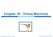 Chapter 16: Virtual Machines Operating System Concepts – 9th Edition Silberschatz, Galvin and Gagne ©2013 Chapter 16: Virtual Machines Overview History Benefits and Features Building Blocks Types of Virtual Machines and Their Implementations Virtualization and Operating-System Components Examples Operating System Concepts – 9th Edition 16.2 Silberschatz, Galvin and Gagne ©2013 Chapter Objectives To explore the history and benefits of virtual machines To discuss the various virtual machine technologies To describe the methods used to implement virtualization To show the most common hardware features that support virtualization and explain how they are used by operatingsystem modules Operating System Concepts – 9th Edition 16.3 Silberschatz, Galvin and Gagne ©2013 Overview Fundamental idea – abstract hardware of a single computer into several different execution environments Similar to layered approach But layer creates virtual system (virtual machine, or VM) on which operation systems or applications can run Several components Host – underlying hardware system Virtual machine manager (VMM) or hypervisor – creates and runs virtual machines by providing interface that is identical to the host (Except in the case of paravirtualization) Guest – process provided with virtual copy of the host Usually an operating system Single physical machine can run multiple operating systems concurrently, each in its own virtual machine Operating System Concepts – 9th Edition 16.4 Silberschatz, Galvin and Gagne ©2013 System Models Virtual machine Non-virtual machine Operating System Concepts – 9th Edition 16.5 Silberschatz, Galvin and Gagne ©2013 Implementation of VMMs Vary greatly, with options including: Type 0 hypervisors - Hardware-based solutions that provide support for virtual machine creation and management via firmware Type 1 hypervisors - Operating-system-like software built to provide virtualization Including VMware ESX, Joyent SmartOS, and Citrix XenServer Type 1 hypervisors – Also includes general-purpose operating systems that provide standard functions as well as VMM functions IBM LPARs and Oracle LDOMs are examples Including Microsoft Windows Server with HyperV and RedHat Linux with KVM Type 2 hypervisors - Applications that run on standard operating systems but provide VMM features to guest operating systems Includeing VMware Workstation and Fusion, Parallels Desktop, and Oracle VirtualBox Operating System Concepts – 9th Edition 16.6 Silberschatz, Galvin and Gagne ©2013 Implementation of VMMs (cont.) Other variations include: Paravirtualization - Technique in which the guest operating system is modified to work in cooperation with the VMM to optimize performance Programming-environment virtualization - VMMs do not virtualize real hardware but instead create an optimized virtual system Used by Oracle Java and Microsoft.Net Emulators – Allow applications written for one hardware environment to run on a very different hardware environment, such as a different type of CPU Application containment - Not virtualization at all but rather provides virtualization-like features by segregating applications from the operating system, making them more secure, manageable Including Oracle Solaris Zones, BSD Jails, and IBM AIX WPARs Much variation due to breadth, depth and importance of virtualization in modern computing Operating System Concepts – 9th Edition 16.7 Silberschatz, Galvin and Gagne ©2013 History First appeared in IBM mainframes in 1972 Allowed multiple users to share a batch-oriented system Formal definition of virtualization helped move it beyond IBM 1. A VMM provides an environment for programs that is essentially identical to the original machine 2. Programs running within that environment show only minor performance decreases 3. The VMM is in complete control of system resources In late 1990s Intel CPUs fast enough for researchers to try virtualizing on general purpose PCs Xen and VMware created technologies, still used today Virtualization has expanded to many OSes, CPUs, VMMs Operating System Concepts – 9th Edition 16.8 Silberschatz, Galvin and Gagne ©2013 Benefits and Features Host system protected from VMs, VMs protected from each other I.e. A virus less likely to spread Sharing is provided though via shared file system volume, network communication Freeze, suspend, running VM Then can move or copy somewhere else and resume Snapshot of a given state, able to restore back to that state Some VMMs allow multiple snapshots per VM Clone by creating copy and running both original and copy Great for OS research, better system development efficiency Run multiple, different OSes on a single machine Consolidation, app dev, … Operating System Concepts – 9th Edition 16.9 Silberschatz, Galvin and Gagne ©2013 Benefits and Features (cont.) Templating – create an OS + application VM, provide it to customers, use it to create multiple instances of that combination Live migration – move a running VM from one host to another! No interruption of user access All those features taken together -> cloud computing Using APIs, programs tell cloud infrastructure (servers, networking, storage) to create new guests, VMs, virtual desktops Operating System Concepts – 9th Edition 16.10 Silberschatz, Galvin and Gagne ©2013 Building Blocks Generally difficult to provide an exact duplicate of underlying machine Especially if only dual-mode operation available on CPU But getting easier over time as CPU features and support for VMM improves Most VMMs implement virtual CPU (VCPU) to represent state of CPU per guest as guest believes it to be When guest context switched onto CPU by VMM, information from VCPU loaded and stored Several techniques, as described in next slides Operating System Concepts – 9th Edition 16.11 Silberschatz, Galvin and Gagne ©2013 Building Block – Trap and Emulate Dual mode CPU means guest executes in user mode Kernel runs in kernel mode Not safe to