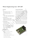 Weiss Engineering Ltd. OP1-BP General Description Noise √ 1 nV/ Hz voltage noise density at 1 kHz 30 nVPP voltage noise 0.1–10 Hz √ 0.7 pA/ Hz current noise density at 1 kHz 80 pAPP current noise 0.1–10 Hz The OP1-BP is a discrete operational amplifier particularly optimised for audio applications. Its wide output swing and superior load driving capability (27 VPP into 200 Ω), very low distortion (−152 dB) √ and very low noise (1 nV/ Hz) leads to signal paths with exceptionally wide dynamic range. The excellent AC characteristics (50 V/µs slew-rate and 95 MHz gain bandwidth) ensures exemplary performance at ultrasound frequencies. This is combined with low input offset voltage (±10 µV), low input bias and input offset current (±60 nA and ±10 nA), good CMRR and PSRR (130 dB) and wide power supply range (±5 V to ±18 V) to form a true high performance general purpose amplifier. Besides high-end audio the OP1-BP is useful for any critical application which requires very wide dynamic range and low distortion analogue signal processing; typical examples include spectrum analyzers, infrared detectors and low distortion oscillators. ar y Features im in THD+N −152 dB (+20 dBu, 1 kHz, 22 kHz BW, 600 Ω load) −148 dB (+20 dBu, 10 kHz, 80 kHz BW, 600 Ω load) AC characteristics 50 V/µs slew-rate, highly symmetrical 95 MHz gain bandwidth (G = 80 dB) 700 kHz full power bandwidth (20 VPP into 600 Ω) 300 kHz full power bandwidth (20 VPP into 200 Ω) DC characteristics ±10 µV input offset voltage ±60 nA input bias current ±2 nA input offset current Pr el Load driving capability 27 VPP (+21.8 dBu) into 200 Ω (±15 V supply) 20 VPP (+19.2 dBu) into 100 Ω (±15 V supply) 10 VPP (+13.2 dBu) into 50 Ω (±15 V supply) adjustable class A output current Applications • high performance audio • low noise, low distortion preamplifiers • high resolution ADC drivers • high resolution DAC IV converters • headphone amplifiers and high-power line driver • low distortion active filters • high resolution instrumentation 1 ar y Contents 1 Revision History 3 2 Specifications 4 im in 3 Absolute Maximum Ratings 5 4 Typical Performance Characteristics 6 5 Theory Of Operation 15 5.1 Discrete vs. IC Operational Amplifiers . . . . . . . . . . . . . . . 15 5.2 Amplifier Architecture and Implementation . . . . . . . . . . . . 16 5.3 Manufacturing Information . . . . . . . . . . . . . . . . . . . . . 18 Pr el 6 Applications Information 6.1 Noise and Source Impedance Considerations . . . . . 6.2 Low Distortion Implementation . . . . . . . . . . . . 6.3 Class A Output Current Adjustment . . . . . . . . . 6.4 DC Precision . . . . . . . . . . . . . . . . . . . . . . 6.5 Ground Pin Connection . . . . . . . . . . . . . . . . 6.6 Feedback Capacitor Selection . . . . . . . . . . . . . 6.7 Power Supply Bypassing and Layout Considerations 6.8 Driving Capacitive Loads . . . . . . . . . . . . . . . 6.9 Sockets and Handling . . . . . . . . . . . . . . . . . 7 Outline Dimensions and Pinout 2 . . . . . . . . . . . . . . . . . . . . . . . . . . . . . . . . . . . . . . . . . . . . . . . . . . . . . . . . . . . . . . . 19 19 21 21 22 23 23 24 25 25 27 Revision History ar y Chapter 1 im in 2011-10-27, Revision 2: Revision history section added; typical performance characteristics section extended; outline dimenstions section extended. Pr el 2011-01-21, Revision 1: Initial revision, preliminary. 3 ar y Chapter 2 Specifications im in The following specifications apply for TA = +25◦ C, VS = ±15 V and amplifier fully warmed up unless otherwise noted. Parameter Input Offset Voltage Input Offset Current Input Bias Current Open Loop Gain el Gain Bandwidth Product Unity Gain Frequency Slew Rate Power Supply Rejection Input Voltage Noise Density Pr Input Voltage Noise Input Voltage Noise Density 1/f Corner Input Current Noise Density Input Current Noise Input Current Noise Density 1/f Corner Output Voltage Swing Factory Preset Class A Output Current Recommended Power Supply Voltage Quiescent Current Ground Pin Current Condition Min RL = 600 Ω RL = 200 Ω G = 80 dB RL = 600 Ω f = 10 Hz f = 1 kHz f = 10 Hz 0.1–10 Hz f = 1 kHz f = 10 Hz 0.1–10 Hz RL RL RL RL = = = = 600 Ω 200 Ω 100 Ω 50 Ω Typ ±10 ±2 ±60 136 134 95 8 ±50 130 1 1 30 0.6 0.7 1.4 80 23 ±14 ±13.5 ±10 ±5 ±30 ±5 no load 4 Max ±50 ±150 ±18 42 6.5 Unit µV nA nA dB dB MHz MHz V/µs dB √ nV/ Hz √ nV/ Hz nVPP Hz √ pA/ Hz √ pA/ Hz pAPP Hz V V V V mA V mA µA ar y Chapter 3 Absolute Maximum Ratings Ratings ±22 V VCC + 0.7 V VEE − 0.7 V ±100 mA 3W Indefinite Within Maximum Power Dissipation −65◦ C to +125◦ C −40◦ C to +85◦ C 300◦ C im in Parameter Supply Voltage Input Voltage Differential Input Current Maximum Power Dissipation Output Short-Circuit Duration Storage Temperature Range Operating Temperature Range Lead Temperature (Soldering, 10 sec.) Pr el Stresses above those listed under Absolute Maximum Ratings may cause permanent damage to the device. This is a stress rating only and functional operation of the device at these or any other conditions above those indicated in the operational section of this specification is not implied. Exposure to absolute maximum rating conditions for extended periods may affect device reliability. 5 ar y Chapter 4 im in Typical Performance Characteristics Pr el The following typical performance characteristics apply for TA = +25◦ C, VS = ±15 V and the amplifier fully warmed up unless otherwise noted. 6 Distribution of Inverting Input Bias Current, 87 Units 20 18 18 16 16 14 14 12 10 8 12 10 8 6 6 4 4 2 2 0 −150 −50 0 50 noninverting input bias current [nA] 100 0 −150 150 −100 −50 0 50 inverting input bias current [nA] 100 150 im in −100 ar y percentage of untis [%] percentage of untis [%] Distribution of Noninverting Input Bias Current, 87 Units 20 Distribution of Input Offset Current, 87 Units 60 Offset Voltage Warm Up Drift, 10 Representative Units 20 10 50 0 