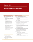 Chapter 15 Managing Global Systems LEARNING OBJECTIVES CHAPTER OUTLINE After reading this chapter, you will be able to: 15.1 THE GROWTH OF INTERNATIONAL INFORMATION SYSTEMS Developing an International Information Systems Architecture The Global Environment: Business Drivers and Challenges State of the Art 1. Identify the major factors driving the internationalization of business. 2. Compare strategies for developing global businesses. 3. Demonstrate how information systems can support different global business strategies. 4. Identify the challenges posed by global information systems and management solutions. 5. Evaluate the issues and technical alternatives to be considered when developing international information systems. Interactive Sessions: Avnet: Developing Systems to Support Global Strategy Offshore Outsourcing: Good, Bad, or Does Not Make a Difference? 15.2 ORGANIZING INTERNATIONAL INFORMATION SYSTEMS Global Strategies and Business Organization Global Systems to Fit the Strategy Reorganizing the Business 15.3 MANAGING GLOBAL SYSTEMS A Typical Scenario: Disorganization on a Global Scale Global Systems Strategy The Management Solution 15.4 TECHNOLOGY ISSUES AND OPPORTUNITIES FOR GLOBAL VALUE CHAINS Technology Challenges of Global Systems Managing Global Software Development 15.5 HANDS-ON MIS Achieving Operational Excellence: Expanding International Sales: Dirt Bikes USA Achieving Operational Excellence: Building a Job Database and Web Page for an International Consulting Firm Improving Decision Making: Conducting International Marketing and Pricing Research THINK GLOBAL, ACT LOCAL: DHL BUILDS A GLOBAL IT ORGANIZATION S ervicing over 140,000 destinations in over 220 countries with overnight and express package deliveries poses a unique problem: how do you work in very unique local environments, with different languages, cultures, and local knowledge, while at the same time deliver this service on a global, time-intense platform? This is the question facing DHL, a logistics and parcel delivery business with worldwide operations. Founded in 1969 by Adrian Dalsey, Larry Hillblom, and Robert Lynn (the source of D, H, and L), DHL began as a service shuttling bills of lading between San Francisco and Honolulu. Now owned by Deutsche Post World Net, DHL operates a global system of 4,400 local offices, 238 gateways, and more than 450 hubs, warehouses, and terminals. The company employs over 170,000 people. The company offers 4.2 million customers worldwide fast, reliable, and cost-efficient package delivery service around the world. More than 400 aircraft operate for or on behalf of DHL. Keeping track of its own operations, in addition to customer packages, is a major challenge for DHL. For DHL, acting locally means that customers and employees would see on their computer screens information on their packages in their local language, databases would contain important country regulations, and local information would be current. Acting globally means that DHL computer systems around the world can check on the status and location of any DHL package, and have that information be current, and accurate within minutes of an event happening. If the information is delayed even more than a few seconds, or wrong, scanners can’t operate, planes fly empty, and packages remain in warehouses. Originally, DHL solved this problem by building over 50 different data centers in each of the major countries where it operated and coordinating these loosely with a common set of core database applications that were installed in each of the countries. The core applications sat on top of a messaging and communications network so information could transfer from one country to another. The core applications included a master common shipment database that kept the tracking information, as well as e-mail programs, customer shipment, transit times, and billing details. The global databases allowed local countries’ units to see only the data needed locally, and required them to store only local data. This arrangement of common global core systems that could be customized to local needs was adequate until traffic volume expanded rapidly in the last decade as global trade pushed the existing system to the limits. With 50 decentralized data centers running supposedly common programs, the risks that any one center or several centers would fail might jeopardize shipments in several countries. Through painful experience, DHL learned that maintaining 50 different IS centers to a single global standard was 593 594 Part Four Building and Managing Systems difficult in many countries. The company also learned that “the information is more important than the package.” Customers might understand and be sympathetic when hurricanes or tsunamis lead to lost packages, but they are intolerant to the idea that the DHL system failed and cannot tell them where their package is—even if it’s at the bottom of the ocean. In addition, the highly decentralized IS structure raised costs and slowed down change. Upgrades to software programs would have to be deployed in 50 different countries, taking over 18 months. Costs rose because instead of maintaining the computers and programmers in one location, they had to be maintained in 50 locations. When Managing Director of IT services, Stephen McGuckin, took over the Asian and Middle Eastern operation beginning in the late 1990s, management was increasingly strained by the existing organization of IT. Country managers were flying far too often to regional meetings with one another trying to coordinate policies, and McGuckin estimated that managers lost 20 percent of their productivity. The IT coordinating centers were headquartered in four different, expensive locations: London, Singapore, Hong Kong, and Bahrain. The software was all being developed in the United States which also was very costly. A new set of management processes needed to be built. McGuckin started moving DHL toward a more 