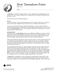 How Tornadoes Form Page 1 of 3 Name ________________________________________________________________________ A tornado is a violently rotating column of air, extending from a thunderstorm to the ground. The most violent tornadoes have rotating winds of 250 miles (402 kilometers) per hour or more. Tornadoes form in the following sequence: Fronts In the atmosphere, cool air pushes against warm air. The place where the two masses of air meet is called a front. A front can stretch over 100 miles (161 kilometers). As the cool air presses forward, it slides underneath the warm air. The warm air is pushed upward and water droplets form. Fast-growing clouds take shape. These clouds are called thunderheads. A line of thunderheads 100 miles (161 kilometers) or more in length may grow along a front. Thunderheads Thunderheads, or cumulonimbus (kyu-mya-lo-NIM-buhs) clouds, are the giant clouds that produce storms with lightning and thunder. When you see a thunderhead, you are looking at a place in the sky where warm, moist air is rising quickly through cool air. This can happen along and ahead of fronts as well as on hot, sunny days. When the sun heats the ground, the air near it grows warm, too. The warm air rises, but it sometimes becomes trapped by a layer of cooler air above it. As the day continues, the sun keeps shining and more heated air pushes its way skyward. Finally, it breaks through. The warm air blasts high into the sky, like water shooting up from a fountain, and a thunderhead grows. The thunderheads most likely to cause tornadoes are those that form along and ahead of fronts. This is because strong winds often blow high above fronts. The power of these winds, along with slower winds closer to the ground, can make the rising air in a thunderhead start rotating. This difference in wind direction and speed is called wind shear. At first the rotating winds spin around a horizontal axis parallel to the ground. However, as the warm air continues to rise, the updraft becomes strong enough to lift the rotating air into a vertical spin, roughly perpendicular to the ground. A supercell is a thunderstorm with a persistent rotating updraft. Supercells are rare, but they are responsible for a remarkably high percentage of severe weather events, especially tornadoes, extremely large hail and damaging straight-line winds. Supercells Visit the American Red Cross Web site at www.redcross.org/disaster/masters HOW TORNADOES FORM Masters of Disaster® Tornadoes, Level 3 Copyright 2007 The American National Red Cross How Tornadoes Form Page 2 of 3 frequently travel to the right of the main environmental winds; that is, they are “right movers.” Mesocyclones If the rising air in a thunderhead begins to rotate, the column of spinning winds is called a mesocyclone (mez-uh-SY-klon). As a mesocyclone rotates, it stretches toward warm air near the ground. The lower part of the mesocyclone narrows. The narrower it becomes, the faster it spins. The mesocyclone acts like a giant vacuum-cleaner hose. Warm air is drawn in through the lower end of the mesocyclone and pulled upward through the thunderhead. The air swirls higher and higher. The spinning air may soar all the way to the top of a thunderhead, 10 miles (16 kilometers) above the ground. Some mesocyclones spin like this for a few minutes and then just disappear. In others, however, a smaller column of faster-spinning air forms inside the bottom of the mesocyclone. This column is usually less than a half-mile (800 meters) wide. As it spins, it reaches toward the ground. Funnel Clouds When the column of tightly spinning winds dips down from the mesocyclone, it draws in warm, moist air. The air cools as it is pulled up into the column. Tiny droplets of water form and a whirling cloud appears. This cloud is called a funnel cloud. Funnel clouds are named for their shape. They are often shaped like funnels—tubes that are wide at the top and narrow at the bottom. Some funnel clouds hang straight down from the storm cloud. Others stretch sideways through the sky. A funnel cloud may dip down and then retract into the mesocyclone. Or, it may touch the ground. If it does, the funnel cloud is called a tornado. Sometimes when a tornado is forming, no funnel cloud can be seen. The air near the ground is so dry that, when it is sucked into the whirling column, no water droplets form. Then the fast-spinning air stays invisible until it becomes a tornado, stirring up dust and soil into a spinning debris cloud. Tornadoes If you see a funnel cloud dip down from a thunderhead, it is usually a sign that a tornado is on its way. But not all tornadoes look like funnels. They can be shaped more like jars— Visit the American Red Cross Web site at www.redcross.org/disaster/masters HOW TORNADOES FORM Masters of Disaster® Tornadoes, Level 3 Copyright 2007 The American National Red Cross How Tornadoes Form Page 3 of 3 with the same width from top to bottom. Or, they may have more than one funnel. Large tornadoes may have several narrow, twisting funnels circling around. Some of the largest, most dangerous tornadoes do not look like funnels at all. These tornadoes appear to be big clouds moving along the ground. Tornadoes also change shape with time. Many funnels become thin, like pieces of rope, as they lose power. They look like giant elephant trunks snaking through the sky. The winds of a tornado can be so strong that they can blow large objects, such as parts of buildings, trees and cars, for miles. Tornado Types There are three types of tornadoes: weak, strong and violent. On the Enhanced Fukita Scale (EF Scale), these range in intensity from EF0 to EF5. Weak Tornadoes (EF0, EF1) If the winds of a tornado spin at 110 miles (177 kilometers) per hour or less, scientists consider the tornado weak. Weak tornadoes usually leave behind a path of damage less than 3 miles (5 kilometers) long and 50 yards (46 meters) wide. Weak tornadoes are the most common of the three tornado types