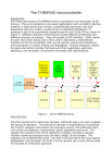 The TI MSP430 microcontroller Introduction The Texas Instruments (TI) MSP430 family of processors are low power 16 bit devices. They are marketed at low power applications such as battery devices, however in spite of this they contain a sophisticated processor core and depending upon the model, a useful array of integrated peripherals. TI produces a set of microcontrollers based around a core 16 bit CPU as shown in Figure 1. Different members of the family include different peripherals and different amounts of memory. They all include a JTAG interface. (JTAG stands for Joint Test Action Group and in this context represents a standardized interface to the microcontroller that can be used for control and monitoring during program or system testing and debugging). Product designers choose the particular family member that best suits their application, generally speaking, cost and power consumption increases with sophistication. Program memory (Flash/ (EP)ROM) Data memory (RAM) Parallel I/O Ports Serial I/O Devices (UART/ USART/ SPI) JTAG 16 Bit CPU Core Interface Timers ADC Comparators LCD Driver (44x only) Figure 1. The TI MSP430 family The CPU Core The CPU consists of an instruction decoder, arithmetic logic unit, and a register file (group of registers). The instruction decoder is responsible for translating the numeric program instructions into processor actions, the arithmetic logic unit carries out additions, subtractions, logical operations and so on. The register file consists of 16, 16 bit registers (a register is simply a storage location inside the processor that can hold a single 16 bit number). The registers are numbered R0 to R15. The first 4 of these (R0 to R3) have special designation, the remainder, R4 to R15 are for general user e and may be used for example as instruction operands. R0 – The program counter (PC) At any given time, the program counter contains the address of the next instruction to be executed. It always contains an address that is a multiple of 2, this is because memory is addressed in 2-byte (16 bit) chunks by this CPU. When executing a linear sequence of instructions, the PC is automatically moved on to the next instruction by the instruction decoding logic. Programs can also write to PC to effect a jump to a particular location. R1 – The Stack pointer (SP). Foreword: Stacks and microprocessors. Imagine you are an over-worked employee in the company who is continually being given new tasks to perform. Now, suppose you are in the middle of some complex job and your employer requires to temporarily divert you to some other job. Being used to disturbances like this, you decide to write in your notebook the current status of the job you are working on before you move on, thus allowing you to take up from where you left off when the other job is done. Now, suppose that while you are doing this new job, you are disturbed with yet another more urgent task. Again the notebook comes out… The function of the notebook in the above is to store the current status of each job for retrieval later on. In effect, the notebook is like a memory device used for storing state information. A microprocessor stack performs a very similar function. The stack in a microprocessor is an area of memory set aside for storing the microprocessor state (contents of registers and so on) in the event of a disturbance. Suppose the microprocessor is doing a job (1) below and is disturbed (the exact mechanism for this will be shown later). If it wishes to return to this job at a later time, it must store its current state in the stack as shown below (2). Th e St ack (1) Microprocessor performing Task 1 Working Registers Th e St a ck (2) Microprocessor performing Task 2 Working Registers Task 1 Working Registers Now, suppose Task2 is disturbed, again, the microprocessor state must be saved to the stack as shown below (3). (3) The Stack Microprocessor performing Task 3 Working Registers Task 2 Working Registers Task 1 Working Registers As you can see, the register contents for Task2 are stacked on top of Task1 (hence the term ‘Stack’). Now suppose Task3 is completed, and the microprocessor wished to return to its previous job. It simply pulls from the stack the register contents for the job that was interrupted last and carries on (back to (2)). When this job is complete, it again returns to the previous state by pulling from the stack the previous state of its registers. Some important points should be noted here: The stack is a Last in, First Out mechanism. The stack resides in memory, just like the program and the data so care must be taken not to upset its contents lest the microprocessor lose track of what it is doing. Implementation of the stack on the TIMSP430 The MSP430 uses R1 as a pointer to the stack in RAM (the stack must reside in RAM). At any given time, the stack pointer points to the last value pushed (placed) on the stack. Values are pushed as 16 bit words, and after each push, the stack pointer is decremented by 2. As values are taken (pulled) from the stack, the stack pointer is increased by 2. The stack therefore operates in an inverted fashion. This approach is common among processors, the reason being that it allows the stack to begin at the top of memory and programs to begin at the bottom of memory. The MSP430 instruction set includes 4 instructions which affect the stack. These are: PUSH operand – SP is decremented by 2 and the operand is copied to where SP points POP operand – The value that SP points to is placed in the operand, SP is incremented by 2 CALL subroutine(address) – SP is decremented by 2, PC is copied to where SP points, subroutine address is placed in PC. RET – The value that SP points to is placed in PC, SP is incremented by 2. R2 – The status register (SR) This register is used to flag significant calculation results such as overflows and to control the operation of the processor. (R2 also forms part of the constant generator syste