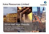 Iluka Resources Limited 2014 Half Year Results 2014 Half Year Results David Robb, Managing Director David Robb,Chief Managing Director Alan Tate, Financial Officer Alan Tate, Chief Financial Officer 22 August 2014 22 August 2014 Disclaimer – Forward Looking Statements Forward Looking Statements This presentation contains certain statements which constitute “forward-looking statements”. These statements include, without limitation, estimates of future production and production potential; estimates of future capital expenditure and cash costs; estimates of future product supply, demand and consumption; statements regarding future product prices; and statements regarding the expectation of future Mineral Resources and Ore Reserves. Where Iluka expresses or implies an expectation or belief as to future events or results, such expectation or belief is expressed in good faith and on a reasonable basis. No representation or warranty, express or implied, is made by Iluka that the matters stated in this presentation will in fact be achieved or prove to be correct. Forward-looking statements are only predictions and are subject to risks, uncertainties and other factors, which could cause actual results to differ materially from future results expressed, projected or implied by such forward-looking statements. Such risks and factors include, but are not limited to: • changes in exchange rate assumptions; • changes in product pricing assumptions; • major changes in mine plans and/or resources; • changes in equipment life or capability; • emergence of previously underestimated technical challenges; and • environmental or social factors which may affect a licence to operate. Except for statutory liability which cannot be excluded, Iluka, its officers, employees and advisers expressly disclaim any responsibility for the accuracy or completeness of the material contained in this presentation and exclude all liability whatsoever (including in negligence) for any loss or damage which may be suffered by any person as a consequence of any information in this presentation or any error or omission there from. Iluka does not undertake any obligation to release publicly any revisions to any forward-looking statement to reflect events or circumstances after the date of this presentation, or to reflect the occurrence of unanticipated events, except as may be required under applicable securities laws. Non-IFRS Financial Information This presentation uses non-IFRS financial information including mineral sands EBITDA, mineral sands EBIT, Group EBITDA and Group EBIT which are used to measure both group and operational performance. A reconciliation of non-IFRS financial information to profit before tax is included in the supplementary slides. Non-IFRS measures have not been subject to audit or review. Mineral Resources Estimates The information in this presentation that relates to Mineral Resources estimates on the Tapira and Puttalam Projects has been previously announced to ASX (see relevant slides for details). Iluka confirms that it is not aware of any new information or data that materially affects the information included in the original market announcement and that all material assumptions and technical parameters underpinning the estimates in those announcements continue to apply and have not materially changed. Iluka confirms that the form and context in which the Competent Person’s findings are presented have not been materially modified from the original market announcements. 2 Iluka Approach • Focus on shareholder returns through the cycle • Flex asset operation in line with market demand • Continue market development through the cycle • Maintain strong balance sheet • Preserve/advance mineral sands growth opportunities • Continue to evaluate/pursue corporate growth opportunities • Act counter-cyclically where appropriate 3 Iluka Executive Team DAVID ROBB Managing Director STEVE WICKHAM MATTHEW BLACKWELL DOUG WARDEN ALAN TATE CHRIS COBB Chief Operating Officer, Mineral Sands Head of Marketing, Mineral Sands Head of Resource Development, Mineral Sands Chief Financial Officer and Head of Strategy and Planning Head of Alliances, New Ventures and Royalties CAMERON WILSON Chief Legal Counsel and Head of Corporate Acquisitions 4 Structure Business Performance 1H Financials Market Conditions Industry Context and Industry Dynamics Iluka’s Focus Supplementary Slides 5 Business Performance 1H Financials 6 2014 Half Year – Key Features • Flexibility, unit costs, capex, FCF, balance sheet, sustainability • Earnings reflect low product pricing • Free cash flow $63.9 million • 6 cents dividend per share fully franked • Net debt / net debt + equity (gearing ratio) reduced to 9.2% • Cash costs of production $200.7 million – trending below FY guidance (~$430 million) – unit cash costs / tonne Z/R/SR produced $796 – Z/R/SR revenue / tonne $1,015 • SA Premier’s Award for Environmental Excellence 7 Main Features of 1H 2014 versus 1H 2013 Mineral Sands Sales Volumes Z/R/SR sales down 3.5% , higher rutile and SR sales offset by lower zircon sales Mineral Sands Revenue 10.1% - lower sales volumes and lower prices Cash Costs of Production 0.6% to $200.7 million - reduction in total cash costs sustained Cost of Goods Sold $897/tonne of Z/R/SR vs $864/tonne Unit Cash Costs of Production $796/tonne (Z/R/SR) compared to $848/tonne – reflecting 5.9% higher Z/R/SR production Unit Cash Costs (excl. by products) $718/tonne (Z/R/SR) compared to $798/tonne Revenue per Tonne 13.8% to $1,015/tonne (Z/R/SR) – lower pricing across products Mining Area C EBIT $38.0 million vs $45.4 million – lower sales volumes, lower capacity payments, lower iron ore prices Mineral Sands EBITDA 21.0% to $107.9 million Group EBITDA Margin 32.9% vs 37.5% Group EBITDA $125.6 million vs $160.2 million Reported Earnings (NPAT) $11.7 million vs $34.3 million Return on Capital (annualised) 3.1% vs 5.9%