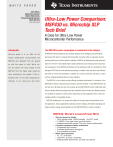 W H I T E PA P E R Zack Albus, Applications Engineer; Adrian Valenzuela, Product Marketing Engineer; Mark Buccini Texas Instruments Ultra-Low Power Comparison: MSP430 vs. Microchip XLP Tech Brief A Case for Ultra-Low Power Microcontroller Performance Introduction The MSP430’s power consumption is unmatched in the industry. Ultra-low power is in our DNA: As the All MSP430 internal peripherals are carefully designed to be intelligent and with features world’s lowest-power microcontroller, the that reduce CPU load. For example the internal ADC converters offer an automatic channel MSP430 was designed from the ground scanning feature and a direct transfer controller or DMA for off-loading basic data movement up with low power in mind. We’ve wo- tasks from the CPU. This enables higher system performance and reduces power consumed. ven low power into every aspect of the The transparency of the MSP430 architecture is first experienced with it’s revolutionary 16-bit MSP430 from the highly agile instant-on orthogonal CPU that has more effective processing, is smaller-sized, and more code-efficient clock architecture, the modern 16-bit or- than other 8-/16-bit microcontrollers. In addition to a common instruction set there is a strict thogonal CPU, to the smart integrated pe- memory-mapped peripheral library for easy migration. ripherals, to our easy-to-use tool chain. The MSP430 is a true family concept offering consistent performance. For example, in the MSP430F2xx family of general-purpose devices, both the simplest 14-pin MSP430F2001 device with only 1kB Flash and the most complex 80-pin MSP430F2619 with 128kB Flash offer ultra-low power performance figures that are extremely close for these very different devices. This enables an engineer to select just the right device for their application from a wide and scalable portfolio of compatible devices. MSP430 development is in-system and subject to the exact same characteristics of the final application. Today’s applications operating at lower voltages, with tighter packaging and higher-precision analog, benefit greatly from the MSP430 MCU’s in-system emulation MSP430: World’s Lowest-Power MCU • • • Ultra-low power by design – 100nA storage mode, <500nA standby, <1µA RTC mode – 0–16MIPS <1µs, agile instant-on clock system – Intelligent peripherals reduce CPU load, improve performance A modern transparent family architecture – Compatibility top-to-bottom – Consistent performance throughout – True embedded emulation Mixed signal processor – 10-, 12-, 16-bit ADC – 12-bit DAC, op-amps, comparator – Enabling higher performance, low total cost systems 2 Texas Instruments approach. The MSP430 MCU’s dedicated embedded emulation logic resides on the actual device itself and is accessed via JTAG or Spy-Bi-Wire using no additional system resources. From the first day of development, firmware engineers can now unobtrusively develop and debug their embedded code with full-speed execution, breakpoints, and single stepping in an application. The MSP430 offers a variety of high-performance mixed-signal peripherals that enable high-performance system solutions, at a lower total cost using few external components. Designing with an MSP430 in many cases allows a single-chip solution for a specific application. For example the MSP430FW42x is designed specifically to implement a single-chip water/flow meter. The MSP430FG4xx integrated peripheral set, including ADC, op-amps, and DACs, is ideal for portable medical devices or glucose meters. The MSP430F2xx MCUs on the other hand are designed for more general-purpose ultra-low power applications with the same system-on-chip capabilities. The MSP430 is designed specifically for batterypowered measurement applications. The average system power consumption is the absolute lowest, without compromise in performance. The system enters and remains in an ultra-low power standby mode for as long as possible, and is awakened only to service interrupts as fast as possible. Multiple oscillators are utilized to provide both an ultra-low power standby mode and “on demand” high-performance processing. The clock system is very flexible and allows the MSP430 to operate optimally from a single 32KHz crystal – with the internal digitally controlled oscillator (DCO) used for the CPU and high-speed peripherals. A low-frequency Auxiliary Clock (ACLK) is driven directly from a common 32KHz watch crystal with no additional external components. The ACLK enables the MSP430’s ultra-low power standby mode (LPM3) and an embedded real-time clock function. In LPM3, the MSP430 typically consumes current in the 1µA range. The integrated high-speed DCO can source the master clock (MCLK) used by the CPU and high-speed peripherals. By design, the DCO is active and fully stable in less than 6 µs with no intermediate steps. This enables “instant on” high-performance processing – no long start-up for a second crystal or 2-speed start-up required. Because the DCO is digitally adjustable with software and hardware, stability over time and temperature is assured. Ultra-Low Power Comparison: MSP430 vs. Microchip XLP Tech Brief October 2009 Texas Instruments 3 To service interrupt driven events, the software efficiently uses the 16-bit RISC CPU’s performance in very short “burst” intervals. Transition from standby to fully active is less than 6 µs. This results in a combination of ultra-low power consumption and very high performance immediately when needed. To support non-low power applications, a high-speed crystal up to 16MHz can also be used. The device can also operate with no external crystal at all using only the internal DCO. Microchip’s application report and video compares the PIC24F XLP specifically to the MSP430. The fundamental claim is that the PIC24F XLP is lower power compared to the MSP430F2xx – this is also demonstrated in a video using a special Microchip measurement board. 