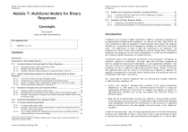 Module 7 (Concepts): Multilevel Models for Binary Responses Introduction Module 7: Multilevel Models for Binary Responses Module 7 (Concepts): Multilevel Models for Binary Responses Introduction C7.6 C7.7 Modul es 1-3, 5, 6 Contents Introduction .............................................................................................. 2 Introduction to the Example Dataset ............................................................... 3 C7.1 Two-level Random Intercept Model for Binary Responses............................. 4 C7.1.1 C7.1.2 C7.1.3 Generalised linear random intercept model .......................................... 4 Random intercept logit model .......................................................... 5 Example: Between-state variation in voting intentions in the US ................ 7 C7.2 Latent Variable Representation of a Random Intercept Model for Binary Responses............................................................................................... 11 C7.2.1 C7.2.2 C7.2.3 C7.2.4 C7.3 Introduction Two-level random intercept threshold model ....................................... 12 Comparison of a single-level and multilevel threshold model .................... 12 Impact of adding a level 1 explanatory variable to a two-level model ......... 15 Variance partition coefficient in terms of y* ........................................ 16 m ial A parti cul ar issue i n the anal ysiso f pr oporti ons is the pr esenceo f extrabi no vari ati on, caus ed by a vi ol ati ono f the assu m pti on that the bi nary respons es on whi ch a proporti on isb as ed ar ei ndependent. I t was s uggestedi n Modul e6 that one way to all ow for cl usteri ng (non-i ndependence) due to om itted gr oup-l evel pr edi ctors is to fit a m ultil evel m odel wi t hg r oup-l evel rando m effects. W e p urs ue thi s appr oach her e, but our focus is on showi ng ho w m ultil evel m odelsc a n be appli ed m o r e gener ally to t wo-l evel bi nary respons e dat a wi t h predi ctors that can be defi ned at bot h l evel 1 and l evel 2. So m eexam ples of res earch questi ons that can bee x pl or ed through mul til evel m odels for bi nary respons es are: x W hat is the ext ent o f bet ween-state vari ati on in US voting pr ef er ences ( Republi can vs. Dem ocrat)? C a n between-stated i f f er ences i n voting be expl ai ned by di fferences i n the et hni c or reli gi ous com positi on of states? D o i ndi vi dual-level vari abl es such as age and gender have di fferent eff ects i n di fferent stat es? x Does the use of dental heal th servi ces (e.g. whet her a person visited a denti st i n the l ast year) vary acr oss ar eas? To what e xt ent ar ea ny di fferences bet ween ar eas attribut abl e tob et ween-ar ea di fferences i n the pr ovi si on of subsidi sed m ic co m positi on of servi ces or di ff erences i n the dem ographi c and soci o-econo resi dents? Population-Averaged and Cluster-Specific Effects .................................... 17 C7.3.1 C7.3.2 C7.3.3 Marginal model for clustered binary data ............................................ 18 Interpretation of coefficients from random effects and marginal models ..... 19 Example: Comparison of marginal and random intercept models fitted to the US election data.......................................................................... 23 C7.4 Predicted Probabilities from a Multilevel Model ...................................... 24 C7.5 A Two-level Random Slope Model ........................................................ 27 C7.5.1 C7.5.2 C7.5.3 A random slope logit model ............................................................ 27 Example: Allowing the relationship between income and voting intentions in the US to vary across states ............................................................ 28 Two random coefficients: Allowing income and urban-rural differentials in voting intentions to vary across states ............................................... 32 1 With many thanks to Rebecca Pillinger, George Leckie, Kelvyn Jones and Harvey Goldstein for comments on earlier drafts. Centre for Multilevel Modelling, 2009 Comparison of estimation procedures ................................................ 39 Some practical guidelines on the choice between estimation procedures ..... 40 I n Modul e 6 we saw ho w m ultipl e regr essi on m odelsf or conti nuous res pons es can be gener alised to handl e bi nary respons es. At the end of them odul e ( C6. 8), we then consider ed m odel s for grouped or clustered bi nary dat a wher e the respons e vari abl e isa pr oporti on and the expl anatory vari abl es ar e defi ned at the gr oup l evel. T h e appli cation of these m odels was ill ustrat ed i n an anal ysiso f the pr oporti on of vot ers in each state i ntendi ng to vot e for George Bus h, i ncl udi ng as pr edi ctors the pr oporti on of non- whi te respondents i n a state and the proporti on who reported regul ar attendance at reli gi ous servi ces. Pre-requisites box x A random intercept model with a level 2 explanatory variable .................. 35 Cross-level interactions ................................................................. 36 Estimation of Binary Response Models .................................................. 39 C7.7.1 C7.7.2 Concepts Fiona Steele1 Centre for Mul til evel Modelli ng Adding Level 2 Explanatory Variables: Contextual Effects .......................... 35 C7.6.1 C7.6.2 1 I n bot h of the above exa m ples, the study popul ati ons have a t wo-l evel hi erarchi cal structur e wi t h i ndi vidual s at l evel 1 and ar eas at l evel 2, but struct ur es can have m ore than t wo l evel s and m ay be non- hi erarchi cal (see Modul e 4). I n thi s m odul e, Centre for Multilevel Modelling, 2009 2 Module 7 (Concepts): Multilevel Models for Binary Responses Introduction Module 7 (Concepts): Multilevel Models for Binary Responses Introduction as i n Modul e 5 for conti nuous res pons es, we consi der onl y model s for 