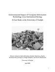Environmental Impact of Computer Information Technology in an Institutional Setting: A Case Study at the University of Guelph Melanie Adamson, Robert Hamilton, Kathryn Hutchison, Kaitlin Kazmierowski, Joming Lau, Deigh Madejski, and Nicole MacDonald University of Guelph April 2005 1 Abstract Computer use at the University of Guelph is an important aspect of campus life, however, its environmental impacts are often not realized or considered. These impacts are expressed throughout the manufacturing, use and disposal of on-campus computers, and thus require monitoring and an understanding of each stage of a computer’s lifecycle. The computers located in the various laboratories, libraries and faculty/graduate student offices at the University of Guelph consume various quantities of energy, but as a whole are not operating at optimal efficiency. In addition, the disposal of on-campus computers does not occur in the most environmentally sound manner possible, thus resulting in various departments either diverting unwanted units to landfills or storing them for extended periods of time. Both the inefficient use of energy and the manufacturing and disposal of computer systems leads to the generation and release of toxic compounds into the environment. This report identifies the need for the implementation of campus-wide green procurement strategies with respect to computer acquisition, use and disposal, and offers recommendations regarding improvements of the University of Guelph’s current systems. The implementation of these recommendations will aid the University in serving as an example for other institutions, saving money in the long run, and decreasing its overall environmental impacts. 2 Acknowledgements We would like to thank the following people for their support and aid during the completion of this project: Dr. Joseph Ackerman, Avin Duggal, Gillian Maurice, David Fallow, Leon Loo, Shelley Dano and the IT managers that responded to our survey. We would also like to thank the Faculty of Environmental Science at the University of Guelph for their financial support. 3 Table of Contents Abstract 2 Acknowledgements 3 1.0 Introduction 7 2.0 Background 2.1 Computers and Associated Environmental Problems 2.1.1 Energy Consumption 2.1.2 Physical Components and Toxins 2.1.3 Computer Manufacturing 2.1.4 Social and Political Implications 2.2 Green Procurement 2.2.1 The Acquisition of Green Computers 2.2.2 Power saving Techniques and Ecolabeling 2.2.3 End of Life Management 2.3 Case Study: Green Procurement Guidelines for the University of Manitoba 13 13 14 14 17 20 21 23 24 26 31 3.0 Materials and Methods 3.1 Survey Design 3.1.1 Quantifying Computer Energy Use in Libraries and Laboratories 3.1.2 Quantifying Computer Energy Use by Faculty and Graduate Students 3.2 Statistical Analysis 3.2.1 z-Test Analysis 3.2.2 S-Plus Analysis 3.3 Environmental Impacts and Green Procurement Strategies 33 33 33 4.0 Results 4.1 Statistical Results 4.1.1 z-Test Statistical Results 4.1.2 S-Plus Statistical Results 4.2 Energy Consumption 4.2.1 Faculty and Graduate Students 4.2.2 Computer Laboratories 4.2.3 Libraries 39 39 39 41 43 44 44 45 5.0 Discussion 5.1 Statistical Analysis 5.1.1 Discussion for z-Test 48 48 49 34 37 37 37 38 4 5.1.2 Discussion for S-Plus 5.2 Energy Consumption 5.2.1 Faculty and Graduate Students 5.2.2 Computer Laboratories 5.2.3 Libraries 5.3 Computer Equipment Purchasing Guidelines 5.4 Computer Equipment Disposal Guidelines 50 50 50 50 51 51 53 6.0 Recommendations 6.1 Purchasing Computer Equipment 6.2 Energy Saving Strategies 6.2.1 Computer Laboratories and Libraries 6.2.2 Faculty and Graduate Students 6.3 Computer Equipment Disposal Methods 56 56 57 58 59 60 7.0 Conclusion 64 References 67 Appendix 1: Composition of a Personal Desktop Computer 71 Appendix 2: Ecolabeling Comparison 73 Appendix 3: Electronics Recyclers Pledge of True Stewardship 76 Appendix 4: Computer and Electronics Recycling 78 Appendix 5: Sampling Sites 80 Appendix 6: S-Plus Statistical Summaries for all Monitoring Times in Richards Building 81 Appendix 7: Energy Consumption Raw Data 82 5 List of Figures Figure 1: ENERGY STAR Symbol 24 Figure 2: Popular ecolabels under the Global Ecolabeling Network 25 Figure 3: Current Energy Consumption 46 Figure 4: Current Energy Consumption per Computer 47 Figure 5: Energy Savings for Conservation plans and New Computer Equipment 47 List of Tables Table 1: Components of CRT panel and funnel glass 15 Table 2: Basic steps in computer chip fabrication 19 Table 3: Resource Use in production of various computer components 20 Table 4: University of Guelph's Current Energy Consumption in Comparison with the Worst-Case and Best-Case Scenarios 45 Table 5: Energy Consumption in University of Guelph Buildings 45 Table 6: Energy Consumption per Computer in University of Guelph Buildings 46 6 1.0 Introduction Recently, topics such as global warming and climate change have drawn a lot of attention in the media and general public. The production and use of various forms of energy is a large contributor to greenhouse gas (GHG) emissions and climate change (BSD Global, 2002). Institutions and organizations worldwide have begun to take measures to reduce energy consumption and increase energy efficiency in an attempt to lessen their environmental impact. Computers and office equipment play an increasingly large role in energy consumption. Desktop computers, scanners and other electronic technology account for the fastest growing source of energy consumption in Canada (NRCan, 2002). Although energy consumption is rising, there are various methods that can be employed to increase energy efficiency. Many organizations and institutions have implemented green procurement policies that promote the purchasing of energy efficient products and the adoption of energy saving practices. These energy saving practices do not reduce the performance of the computers, they simply reduce their power consumption when not 