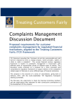 “Customers do not face unreasonable post-sale barriers imposed by firms to change product, switch providers, submit a claim or make a complaint”. FSB DISCUSSION DOCUMENT PROPOSED TCF ALIGNED COMPLAINTS MANAGEMENT (TCF DD – October 2014) DISCUSSION DOCUMENT Document Ref: TCF DD – October 2014 PROPOSED REQUIREMENTS FOR CUSTOMER COMPLAINTS MANAGEMENT BY REGULATED FINANCIAL INSTITUTIONS, ALIGNED TO THE TREATING CUSTOMERS FAIRLY FRAMEWORK 1. BACKGROUND The Financial Services Board (FSB) has adopted a Treating Customers Fairly (TCF) framework as the basis for its supervision of the conduct of business of regulated financial institutions1. The TCF framework will also be a key component of the future market conduct regulatory authority’s mandate to promote fair treatment of financial customers under the “Twin Peaks” model of financial sector regulation2. The TCF approach seeks to ensure that specific, clearly articulated fairness outcomes for financial services customers are demonstrably delivered by regulated financial institutions, at all stages of the relationship between the institution and its customers. Effective management of customer complaints by financial institutions is a vital component of financial consumer protection. TCF Outcome 6 provides that “Customers do not face unreasonable post-sale barriers imposed by firms3 to change product, switch providers, submit a claim or make a complaint”. The current financial services regulatory framework in relation to complaints management is inconsistent, with different levels of responsibility placed on different types of entities. This document proposes a more consistent and comprehensive regulatory framework to support delivery of the complaints related aspect of Outcome 6, across different types of financial institutions. This proposal is the outcome of a series of consultations, going back to February 2013, with the TCF Regulatory Framework Steering Committee (the “TCF Steering Committee”)4. After consideration of all inputs provided by the TCF Steering 1 For further detail regarding the TCF framework, please see the “TCF Roadmap” (March, 2011) and subsequent TCF related communications, available on the FSB’s website: www.fsb.co.za. 2 Please refer to the policy publications “A safer financial sector to serve South Africa better” (February 2011) and “Implementing a twin peaks model of financial regulation in South Africa” (February, 2013), available on the National Treasury website: www.treasury.gov.za. 3 The term “firm” is used in the phrasing of the TCF Outcomes and elsewhere in this document, to refer generally to any financial institution currently regulated by the FSB and, under the Twin Peaks regime, to be regulated by the market conduct authority. Terminology used in subordinate legislation will however align to the terms used in applicable primary legislation. 4 The Steering Committee is a multi-stakeholder consultation forum, comprising representatives of the FSB, the National Treasury, the SA Reserve Bank, various industry and professional associations and Ombud schemes. 1|Page FSB DISCUSSION DOCUMENT PROPOSED TCF ALIGNED COMPLAINTS MANAGEMENT (TCF DD – October 2014) Committee, the proposal is now published as a Discussion Document, inviting broader stakeholder comment. As input into the development of this proposal, the Insurance Department of the FSB carriedout a thematic review of complaints handling practices in a sample of longterm and short-term insurers during April to June 2014. The findings of this review, which we believe support the need for consistent and comprehensive regulation of complaints management, are summarised in Annexure D. 2. Annexure A sets out the six TCF Outcomes, for ease of reference. Annexure B is a list of international standards and other information sources considered in developing this proposal. Annexure C summarises some of the most significant comments made by TCF Steering Committee members in the course of earlier rounds of consultation with them, as well as the FSB’s previous responses to such comments. The FSB takes this opportunity to thank the TCF Steering Committee and its workstream members for their constructive input to date. Annexure D summarises the findings of a thematic review of insurers’ complaints handling practices, carried out by the FSB’s Insurance Department during April to June 2014. COMPONENTS OF A FRAMEWORK FOR TCF MANAGEMENT ALIGNED COMPLAINTS The overall regulatory framework for complaints management should comprise the following prescribed5 components, each of which is discussed in more detail in paragraphs 2.1 to 2.6: Consistent regulatory definitions of “complaint” and related terms. Standards and requirements for firms to implement internal complaints management processes, including record keeping, monitoring and analysis. Requirements for TCF aligned categorisation of complaints. Requirements in relation to the engagement between firms and Ombud schemes. Requirements for reporting complaints information to the regulator. Requirements for public reporting of complaints information. 5 Section 3 discusses how these components may be embedded into the current regulatory framework, pending the development of a more overarching market conduct regulatory framework under Twin Peaks. 2|Page FSB DISCUSSION DOCUMENT PROPOSED TCF ALIGNED COMPLAINTS MANAGEMENT (TCF DD – October 2014) 2.1. Definitions6 To ensure that regulated firms consistently manage complaints in accordance with TCF standards, and to ensure meaningful and comparable complaints related management information and data, consistent definitions of certain key terms are required. The following definitions are proposed: “Complaint” means an expression of dissatisfaction by a complainant, relating to a product or service provided or offered by a financial institution, or to an agreement with the financial institution in respect of its products or services and 