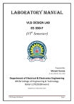 LABORATORY MANUAL VLSI DESIGN LAB EE-330-F (VIth Semester) Prepared By: Vikrant Verma B. Tech. (ECE), M. Tech. (ECE) Department of Electrical & Electronics Engineering BRCM College of Engineering & Technology Bahal-127028 (Bhiwani) Modified on 14 November 2014 VLSI Design Lab Manual Page 1 SYLLABUS VLSI Design Lab (EE-330-F) F - Scheme (w.e.f. August 2009) L T P - - 2 Sessional : Practical : Total : Duration of Exam : 25 Marks 25 Marks 50 Marks 3 hrs. 1) Design of Half-Adder, Full Adder, Half Subtractor, Full Subtractor 2) Design a parity generator 3) Design a 4 Bit comparator 4) Design a RS & JK Flip flop 5) Design a 4: 1 Multiplexer 6) Design a 4 Bit Up / Down Counter with Loadable Count 7) Design a 3:8 decoder 8) Design a 8 bit shift register 9) Design a arithmetic unit 10) Implement ADC & DAC interface with FPGA 11) Implement a serial communication interface with FPGA 12) Implement a Telephone keypad interface with FPGA 13) Implement a VGA interface with FPGA 14) Implement a PS2 keypad interface with FPGA 15) Implement a 4 digit seven segment display Notes : At least 10 experiments are to performed by students in the semester. At least 7 experiments should be performed from the above list; remaining three experiments may either be performed from the above list or designed and set by the concerned institution as per the scope of the syllabus. VLSI Design Lab Manual Page 2 Index S.No. Name of Experiment 1 Page No. Date Signature Write the VHDL Code & Simulate it for the following gates. Two I/P AND Gates. Two I/P OR Gates. Two I/P NAND Gates Two I/P NOR Gates. Two I/P Ex-OR Gates. NOT Gates. 2 Write behavior model of 1- bit Comparator. 3 Write a program for behavior model of 4- bit Comparator. 4 Write the VHDL code & simulate it for 4:1 Multiplexer & 4:1 Demultiplexer. 5 Write a program for behavior model of BCD-toSeven Segment Decoder. 6 Write a VHDL program for behavior model of Parallel-Input-Parallel-Output. 7 Write VHDL programs for the following circuits, check the wave forms and hardware generated. a) Half Adder. b) Full Adder. 8 Write VHDL programs for ALU. 9 Write a VHDL program for behavior model of D Flip - Flop. 10 Write a VHDL program for behavior model of 3Bit UP Counter. VLSI Design Lab Manual Page 3 EXPERIMENT – 1 Aim: Write the VHDL Code & Simulate it for the following gates. Two I/P AND Gates. Two I/P OR Gates. Two I/P NAND Gates Two I/P NOR Gates. Two I/P Ex-OR Gates. NOT Gates. Apparatus used: XILINX 8.1 Software installed in a PC. Theory: VLSI Design Lab Manual Page 4 Program: i) Behavior Model if two I/P AND Gates. Library IEEE; Use IEEE.std_logic_1164_all; Use IEEE.std_logic_arith_all; Entity and_2 is Port (a, b: in bit; z: out bit); End and_2; Architecture and_2_beh of and_2 is Begin process (a, b) Begin If (a=’0’ and b=’0’) then Z<=’0’; ElsIf (a=’0’ and b=’1’) then Z<=’0’; ElsIf (a=’1’ and b=’0’) then Z<=’0’; ElsIf (a=’1’ and b=’1’) then Z<=’1’; End if; End process; End and_2_beh; ii) Behavior Model if two I/P OR Gates Library IEEE; Use IEEE.std_logic_1164_all; Use IEEE.std_logic_arith_all; Entity OR_2 is Port (a, b: in bit; z: out bit); End OR_2; VLSI Design Lab Manual Page 5 Architecture OR_2_beh of OR_2 is Begin process (a,b) Begin If (a=’0’ and b=’0’) then Z<=’0’; Elsif (a=’0’ and b=’1’) then Z<=’1’; Elsif (a=’1’ and b=’0’) then Z<=’1’; Elsif (a=’1’ and b=’1’) then Z<=’1’; End if; End process; End OR_2_beh; iii) Behavior Model if two I/P NAND Gates Library IEEE; Use IEEE.std_logic_1164_all; Use IEEE.std_logic_arith_all; Entity NAND_2 is Port (a, b: in bit; z: out bit); End NAND_2; Architecture NAND_2_beh of NAND_2 is Begin process (a, b) Begin If (a=’0’ and b=’0’) then Z<=’1’; Elsif (a=’0’ and b=’1’) then Z<=’1’; Elsif (a=’1’ and b=’0’) then Z<=’1’; Elsif (a=’1’ and b=’1’) then VLSI Design Lab Manual Page 6 Z<=’0’; End if; End process; End NAND_2_beh; iv) Behavior Model if two I/P NOR Gates Library IEEE; Use IEEE.std_logic_1164_all; Use IEEE.std_logic_arith_all; Entity NOR_2 is Port (a, b: in bit; z: out bit); End NOR_2; Architecture NOR_2_beh of NOR_2 is Begin process (a, b) Begin If (a=’0’ and b=’0’) then Z<=’1’; Elsif (a=’0’ and b=’1’) then Z<=’0’; Elsif (a=’1’ and b=’0’) then Z<=’0’; Elsif (a=’1’ and b=’1’) then Z<=’0’; End if; End process; End NOR_2_beh; v) Behavior Model if two I/P EX-OR Gates Library IEEE; Use IEEE.std_logic_1164_all; Use IEEE.std_logic_arith_all; VLSI Design Lab Manual Page 7 Entity EXOR_2 is Port (a, b: in bit; z: out bit); End EX-OR_2; Architecture EXOR_2_beh of EXOR_2 is Begin Process (a, b) Begin If (a=’0’ and b=’0’) then Z<=’0’; Elsif (a=’0’ and b=’1’) then Z<=’1’; Elsif (a=’1’ and b=’0’) then Z<=’1’; Elsif (a=’1’ and b=’1’) then Z<=’0’; End if; End process; End EXOR_2_beh; vi) Behavior Model if two I/P NOT Gates Library IEEE; Use IEEE.std_logic_1164_all; Use IEEE.std_logic_arith_all; Entity NOT_2 is Port (a: in bit; z: out bit); End NOT_2; Architecture EXOR_2_beh of EXOR_2 is Begin Process (a) Begin If (a=’0’) then Z<=’1’; VLSI Design Lab Manual Page 8 Elsif (a=’1’) then Z<=’0’; End if; End process; End NOT_2_beh; Precautions: Make sure that there is no syntax and semantic error. Result: All the VHDL codes of AND, OR, NAND, NOR, EX-OR and NOT gates are simulated & found correct. Typical viva-voce questions for reference: Q1: The output will be a LOW for any case when one or more inputs are zero in a(n): A. OR gate B. NOT gate C. AND gate D. NAND gate Ans: AND gate Q.2: If a signal passing through a gate is inhibited by sending a low into one of the inputs, and the output is HIGH, the gate is a(n): A. OR gate B. NOT gate C. AND gate D. NAND gate Ans: NAND gate Q.3: A single transistor can be used to build which of the following digital logic gates? A. OR gate B. NOT gate C. 