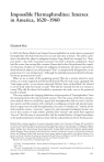 Impossible Hermaphrodites: Intersex in America, 1620–1960 Elizabeth Reis In 1840 the Boston Medical and Surgical Journal published an article about a purported hermaphrodite who had lived some years as male and some as female. The author, a physician, described the subject’s ambiguous features: long, black hair arranged in a “feminine mode,” a face with “masculine coarseness” but with “a feminine complexion,” facial hair like a man, but earrings like a woman. Rumor had it that s/he performed the copulative functions of either sex. Despite the ambiguity of indicators, the doctor expressed no doubt about his subject’s sex and portrayed “him” as unequivocally disingenuous, as the perpetrator of a “case of imposture.” Although the individual presented herself as female, the doctor pronounced her male.1 What are we to make of this perplexing person? Was she a woman attired in men’s clothes, as so many supposed and she herself insisted? Was she truly a man, equipped with “male organs entire,” as two doctors observed? Did the “piece of dead flesh” she referred to on her body make her female or male?2 Why did she variously live life as a woman or a man? Why did the doctor feel entitled to pronounce her male, even as she presented herself as female? This essay explores the changing definitions and perceptions of “hermaphrodites” from the colonial period to the early twentieth century.3 Over the course of the three centuries, most medical observers would have agreed that hermaphrodites did not exist in the human species and that patients with confused or ambiguous external and internal reproductive organs were not really hermaphrodites, but cases of “mistaken sex.” Indeed, by the mid-twentieth century, “corrective” surgery for such anatomical ambiguity became routine in this country, to make infants’ genitalia look “normal” and match their supposed “true sex.” But this essay is concerned less with the medical history of surgical procedures or the professional history of doctors than with the cultural history of how American docElizabeth Reis is assistant professor of women’s and gender studies at the University of Oregon. She is grateful to the Center for the Study of Women in Society and the Humanities Center at the University of Oregon for supporting this project. She would like to thank Catherine Kudlick, Alice Dreger, Christina Matta, Lynn Nyhart, Arlene Shaner, Jennifer Terry, Susan Stryker, Joanne Meyerowitz, Cynthia Eller, David Cecil, Catherine Johnson-Roehr, Andrew Burstein, Nancy Isenberg, David Nord, Susan Armeny, anonymous reviewers at the Journal of American History, the Willamette Valley Early American History group, audiences and panelists at the Kinsey Institute Conference on Female Sexuality, the American Association for the History of Medicine, and the Western Association of Women Historians, and, especially, Matthew Dennis and Pamela Tamarkin Reis. Readers may contact Reis at <lzreis@uoregon.edu>. A. F[lint], “Hermaphroditism,” Boston Medical and Surgical Journal, Oct. 7, 1840, pp. 145–47. Ibid., 146. 3 The term “hermaphrodite” has been replaced by “intersexed” among laypeople and medical practitioners. In this essay I use the historical term to avoid presentism. 1 2 September 2005 The Journal of American History 411 412 The Journal of American History September 2005 tors and laypeople regarded bodies and identities that fell outside their conceptual boundaries of normal female and male categories. What did it mean to be male or female? Who had authority to answer that question, and what were the criteria? The essay is organized chronologically as well as thematically, for the classification of hermaphrodites, impossible though the status was thought to be, changed over time. Each section explores the evolving determination of the biological and social foundations of sexual identity and the anxiety, expressed differently in different eras, over those cases that did not fit the ideal bipolarity. Alice Domurat Dreger, in her pathbreaking book, Hermaphrodites and the Medical Invention of Sex, has termed the years 1871–1915 the “age of gonads” in France and England. By the late nineteenth century, European doctors argued that “true hermaphrodites” were those whose bodies (examined during autopsies) contained both ovarian and testicular tissue. All others, despite unusual conformations of external genitalia, were labeled as mostly female or mostly male (male pseudohermaphrodites or female pseudohermaphrodites), and hence the two-sex system could remain largely intact. I argue that in the United States the impetus to maintain a two-sex system increased in the late nineteenth century, though it began earlier.4 Before the technology required to analyze ovarian and testicular tissue developed, doctors focused on visual markers, particularly the penis and clitoris, though sometimes the vagina, uterus, and menstruation were offered as proof of womanhood. When biological cues proved inconclusive, medical men turned to social indicators—such as a person’s mannerisms, clothing, or tastes—to make their determination of sex definitive. Physicians’ decisions involved factors, some medical, some social, that were linked to larger cultural anxieties. American doctors discussed their European colleagues’ case histories, read European medical textbooks, and used them to formulate their own conclusions about the impossibility of hermaphrodites. In what is now the United States the tendency to proclaim hermaphrodites “impossible” began long before the age of gonads, though it became more pronounced when the observation of gonads became important, here as in Europe. Embedded in both European and American doctors’ judgments, which labeled ambiguous bodies male or female, were traditional notions of femininity, masculinity, and, indeed, personhood as opposed to monstrosity. Distinctive themes characterize 