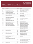 TM ICD-9 and ICD-10 Common Codes ICD-9 Code Long Description 034.0 041.86 042 054.9 070.32 070.51 070.54 070.70 079.4 Helicobacter Pylori (H. Pylori) Infection ICD-10 Code Description J02.0 Streptococcal Pharyngitis Helicobacter Pylori (H. Pylori) As The Cause Of Diseases B96.81 B20 B00.9 Herpes Simplex Without Mention Of Complication Viral Hepatitis B Without Mention Of Hepatic Coma, Chronic, Without Mention Of Hepatitis Delta Acute Hepatitis C Without Mention Of Hepatic Coma Chronic Hepatitis C Without Mention Of Hepatic Coma B18.1 Chronic Viral Hepatitis B Without Delta-Agent B17.10 B18.2 B19.20 Acute Hepatitis C Without Hepatic Coma Chronic Viral Hepatitis C B97.7 A63.8 153.9 154.1 162.9 174.4 174.8 Lyme Disease A69.20 A64 B35.1 B37.3 B89 B99.9 C18.9 C20 Dermatophytosis Of Nail Candidiasis Of Vulva And Vagina Malignant Neoplasm Of Rectum Malignant Neoplasm Of Bronchus And Lung, C50.419 203.00 203.00 204.10 Malignant Neoplasm Of Corpus Uteri, Except Isthmus Malignant Neoplasm Of Ovary Malignant Neoplasm Of Prostate Malignant Neoplasm Of Thyroid Gland Secondary Malignant Neoplasm Of Bone And Bone Marrow Extranodal And Solid Organ Sites Multiple Myeloma, Without Mention Of Having Achieved Remission Multiple Myeloma Without Mention Of Remission Chronic Lymphoid Leukemia, Without Mention Of Having Achieved Remission C54.9 C56.9 C56.1 C56.2 C61 C67.9 C73 – C79.51 C79.52 Right Female Breast Left Female Breast Malignant Neoplasm Of Thyroid Gland Secondary Malignant Neoplasm Of Bone Secondary Malignant Neoplasm Of Bone Marrow C90.00 Multiple Myeloma Not Having Achieved Remission C90.00 Multiple Myeloma Not Having Achieved Remission - C91.11 Benign Neoplasm Of Colon Malignant Neoplasm Of Right Ovary Malignant Neoplasm Of Left Ovary Malignant Neoplasm Of Prostate C85.80 C91.10 211.3 Malignant Neoplasm Of Upper-Outer Quadrant Of C50.919 174.9 202.80 Malignant Neoplasm Of Rectum C50.919 Female Breast C50.912 185 188.9 193 198.5 Tinea Unguium Candidiasis Of Vulva And Vagina C34.90 Malignant Neoplasm Of Upper-Outer Quadrant Of Female Breast C50.911 182.0 183.0 Sexually Transmitted Diseases B34.9 079.99 088.81 099.9 110.1 112.1 136.9 Papillomavirus As The Cause Of Diseases C91.12 D12.6 Page 1 of 12 Chronic Lymphocytic Leukemia Of B-Cell Type Not Having Achieved Remission Chronic Lymphocytic Leukemia Of B-Cell Type In Remission Chronic Lymphocytic Leukemia Of B-Cell Type In Relapse TM ICD-9 and ICD-10 Common Codes ICD-9 Code 218.9 238.2 239.2 240.9 241.0 241.1 242.00 242.90 244.0 244.1 244.8 244.9 245.2 246.9 250.00 250.01 250.02 250.03 250.40 Long Description ICD-10 Code Description Polyp Of Colon Neoplasm Of Uncertain Behavior Of Skin K63.5 D25.9 D48.5 D49.2 And Skin E04.9 E04.1 E04.2 E05.00 Nontoxic Uninodular Goiter Nontoxic Multinodular Goiter Toxic Diffuse Goiter Without Mention Of Thyrotoxic Crisis Or Storm Thyrotoxicosis Without Mention Of Goiter Or Other Cause, Without Mention Of Thyrotoxic Crisis Or Storm Postsurgical Hypothyroidism Other Postablative Hypothyroidism E05.90 E89.0 E89.0 E03.8 E03.9 E06.3 E07.9 Chronic Lymphocytic Thyroiditis Diabetes Mellitus Without Mention Of Complication, Type 2 Diabetes Mellitus Without Mention Of Complication, Type 1 (Juvenile Type), Not Stated As Uncontrolled Diabetes Mellitus Without Mention Of Complication, Type 2 Diabetes Mellitus Without Mention Of Complication, Type 1 (Juvenile Type), Uncontrolled Type, Not Stated As Uncontrolled Diabetes With Renal Manifestations, Type 2 Or Type 1 Diabetes Mellitus Without Complications Type 2 Diabetes Mellitus Without Complications E10.9 Type 1 Diabetes Mellitus Without Complications E11.29 Type 2 Diabetes Mellitus With Other Diabetic Kidney Complication Type 2 Diabetes Mellitus With Diabetic Nephropathy Type 2 Diabetes Mellitus With Diabetic Chronic Kidney Disease Type 2 Diabetes Mellitus With Other Diabetic Kidney Complication Type 2 Diabetes Mellitus With Diabetic Nephropathy Type 2 Diabetes Mellitus With Diabetic Chronic Kidney Disease Type 2 Diabetes Mellitus With Other Diabetic Neurological E11.29 E11.49 E11.42 E11.43 Diabetes With Neurological Manifestations, Type 2 Or Autoimmune Thyroiditis E11.9 E11.40 E11.41 250.62 Or Storm Postprocedural Hypothyroidism Postprocedural Hypothyroidism E10.9 E11.22 Diabetes With Neurological Manifestations, Type 2 Or Nontoxic Single Thyroid Nodule Nontoxic Multinodular Goiter Thyrotoxicosis With Diffuse Goiter Without Thyrotoxic Crisis Or Storm Type 2 Diabetes Mellitus Without Complications E11.21 250.60 And Skin E11.9 E11.21 E11.22 250.42 Neoplasm Of Uncertain Behavior Of Skin E11.44 E11.49 E11.40 E11.41 E11.42 E11.43 250.90 E11.44 E11.8 251.2 E16.2 Page 2 of 12 Type 2 Diabetes Mellitus With Other Diabetic Type 2 Diabetes Mellitus With Other Diabetic Mononeuropathy Type 2 Diabetes Mellitus With Other Diabetic Polyneuropathy Type 2 Diabetes Mellitus With Other Diabetic Autonomic (Poly) Neuropathy Type 2 Diabetes Mellitus With Other Diabetic Amyotrophy Type 2 Diabetes Mellitus With Other Diabetic Neurological Complication Type 2 Diabetes Mellitus With Other Diabetic Type 2 Diabetes Mellitus With Other Diabetic Mononeuropathy Type 2 Diabetes Mellitus With Other Diabetic Polyneuropathy Type 2 Diabetes Mellitus With Other Diabetic Autonomic (Polyneuropathy) Neuropathy Type 2 Diabetes Mellitus With Other Diabetic Amyotrophy TM ICD-9 and ICD-10 Common Codes ICD-9 Code 252.00 256.4 257.2 259.9 266.2 268.9 269.2 271.3 272.0 272.1 272.2 272.4 272.9 273.1 274.00 274.9 275.09 275.2 275.41 275.42 276.1 276.51 276.7 276.8 276.9 277.7 278.00 278.01 278.02 280.0 280.1 280.9 281.0 Long Description Polycystic Ovaries Other Testicular Hypofunction Disaccharide Malabsorption Pure Hypercholesterolemia Pure Hyperglyceridemia Mixed Hyperlipidemia Monoclonal Paraproteinemia Disorders Of Iron Metabolism Disorders Of Magnesium Metabolism Hypocalcemia Hypercalcemia Hyposmolality And/Or Hyponatremia Dehydration Hyperpotassemia Hypopotassemia Dysmetabolic Syndrome Morbid Obesity Overweight Iron Int