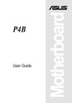 P4B User Guide Motherboard ® E888 Checklist Revised Edition 1.05 (October 2001) Copyright © 2001 ASUSTeK COMPUTER INC. All Rights Reserved. No part of this manual, including the products and software described in it, may be reproduced, transmitted, transcribed, stored in a retrieval system, or translated into any language in any form or by any means, except documentation kept by the purchaser for backup purposes, without the express written permission of ASUSTeK COMPUTER INC. (“ASUS”). Product warranty or service will not be extended if: (1) the product is repaired, modified or altered, unless such repair, modification of alteration is authorized in writing by ASUS; or (2) the serial number of the product is defaced or missing. ASUS PROVIDES THIS MANUAL “AS IS” WITHOUT WARRANTY OF ANY KIND, EITHER EXPRESS OR IMPLIED, INCLUDING BUT NOT LIMITED TO THE IMPLIED WARRANTIES OR CONDITIONS OF MERCHANTABILITY OR FITNESS FOR A PARTICULAR PURPOSE. IN NO EVENT SHALL ASUS, ITS DIRECTORS, OFFICERS, EMPLOYEES OR AGENTS BE LIABLE FOR ANY INDIRECT, SPECIAL, INCIDENTAL, OR CONSEQUENTIAL DAMAGES (INCLUDING DAMAGES FOR LOSS OF PROFITS, LOSS OF BUSINESS, LOSS OF USE OR DATA, INTERRUPTION OF BUSINESS AND THE LIKE), EVEN IF ASUS HAS BEEN ADVISED OF THE POSSIBILITY OF SUCH DAMAGES ARISING FROM ANY DEFECT OR ERROR IN THIS MANUAL OR PRODUCT. SPECIFICATIONS AND INFORMATION CONTAINED IN THIS MANUAL ARE FURNISHED FOR INFORMATIONAL USE ONLY, AND ARE SUBJECT TO CHANGE AT ANY TIME WITHOUT NOTICE, AND SHOULD NOT BE CONSTRUED AS A COMMITMENT BY ASUS. ASUS ASSUMES NO RESPONSIBILITY OR LIABILITY FOR ANY ERRORS OR INACCURACIES THAT MAY APPEAR IN THIS MANUAL, INCLUDING THE PRODUCTS AND SOFTWARE DESCRIBED IN IT. Products and corporate names appearing in this manual may or may not be registered trademarks or copyrights of their respective companies, and are used only for identification or explanation and to the owners’ benefit, without intent to infringe. ii Contents Features FCC/CDC statements ..................................................................... vi Safety information .......................................................................... vii About this guide ............................................................................ viii How this guide is organized .................................................. viii Conventions used in this guide ............................................... ix Where to find more information .............................................. ix ASUS contact information ................................................................ x Chapter 1: Product introduction .......................................... 1-1 1.1 1.2 1.3 1.4 Welcome! ............................................................................ Package contents ............................................................... Overview ............................................................................. 1.3.1 Identifying the motherboard components ................ 1.3.2 Pre-installed accessory ........................................... Special features .................................................................. 1.4.1 Product highlights ................................................... 1.4.2 Value-added solutions ............................................ 1-1 1-1 1-2 1-2 1-5 1-6 1-6 1-7 Chapter 2: Hardware information .......................................... 2-1 2.1 2.2 2.3 2.4 2.5 Motherboard installation ...................................................... 2-1 2.1.1 Placement direction ................................................ 2-1 2.1.2 Screw holes ............................................................ 2-1 Motherboard layout ............................................................. 2-2 Before you proceed ............................................................. 2-3 Central Processing Unit (CPU) ............................................ 2-4 2.4.1 Overview ................................................................ 2-4 2.4.2 Installing the CPU ................................................... 2-5 2.4.3 Installing the heatsink and fan ................................. 2-7 2.4.4 Connecting the CPU fan cable ................................ 2-9 System memory ................................................................ 2-10 2.5.1 Overview .............................................................. 2-10 2.5.2 Memory configurations ......................................... 2-10 2.5.3 Installing a DIMM ................................................... 2-11 2.5.4 Removing a DIMM ................................................ 2-12 iii Contents Safeguards 2.6 2.7 2.8 Expansion slots ................................................................. 2.6.1 Installing an expansion card .................................. 2.6.2 Configuring an expansion card ............................. 2.6.3 PCI slots ............................................................... 2.6.4 AGP slot ............................................................... 2.6.5 CNR slot ............................................................... Switches and jumpers ....................................................... Connectors ....................................................................... 2-13 2-13 2-14 2-15 2-15 2-16 2-17 2-24 Chapter 3: Powering up ......................................................... 3-1 3.1 3.2 3.3 Starting up for the first time .................................................. 3-1 Vocal POST Messages ....................................................... 3-2 Powering off the computer ................................................... 3-4 Chapter 4: BIOS setup ........................................................... 4-1 4.1 4.2 4.3 4.4 4.5 4.6 4.7 iv Managing and updating your BIOS ...................................... 4-1 4.1.1 Using the computer system for the first time ........... 4-1 4.1.2 Updating BIOS procedures .....