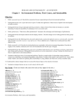 HUMANS AND SUSTAINABILITY: AN OVERVIEW Chapter 1 Environmental Problems, Their Causes, and Sustainability Objectives 1. Define exponential growth. Describe the connection between exponential growth and environmental problems. 2. Distinguish between solar capital and natural capital. Evaluate the significance of these forms of capital in the development of human societies. 3. Distinguish between living on principal and living on interest. Analyze which of these behaviors humans are currently illustrating. Evaluate the possibility of continuing to live in our current style. 4. Define globalization. What factors affect globalization? Summarize the advantages and disadvantages of globalization. 5. Distinguish between developed countries and developing countries. Describe changes in the wealth gap between these groups of countries. 6. Distinguish between the following terms: physically depleted and economically depleted resources; nonrenewable, renewable, and potentially renewable resources; reuse and recycle. Draw a depletion curve. Explain how recycling and reuse affect depletion time. 7. Define sustainable yield. Describe the relationship between sustainable yield and environmental degradation. Describe the tragedy of the commons. Summarize how most environmentalists alleviate this type of tragedy. 8. Distinguish between the following terms: point source of pollution and nonpoint source of pollution; persistent, nonpersistent, and nondegradable pollutants. Distinguish between pollution prevention and pollution cleanup. Evaluate the effectiveness of these two approaches in decreasing pollution. 9. Summarize underlying causes of environmental problems. Describe a simple model of relationships among population, resource use, technology, environmental degradation, and pollution. Evaluate which model is most useful to you. Assess which model would be most useful in explaining these relationships to young children and which more closely resembles reality. 10. Understand the cultural changes that have increased the human impact on the natural environment. 11. Summarize strategies humans can use to work closely with the earth. Key Terms (Terms are listed in the same font style as they appear in the text.) affluenza (p. 19) agricultural revolution (p. 20) biodiversity (p. 6) common-property (p. 112) developed countries (p. 10) developing countries (p. 10) early conservation era (p. 21) ecological footprint (p. 13) ecology (p. 7) economic development (p. 10) economic growth (p. 9) energy resources (p. 14) environment (p. 7) environmental career (p. 8) environmental degradation (p. 12) Environmental Problems, Their Causes, and Sustainability environmental ethics (p. 22) environmental pessimists (p. 22) environmental science (p. 7) environmental wisdom worldview (p. 23) environmental worldview (p. 22) environmentalism (p. 8) environmentally sustainable economic development (p. 10) environmentally sustainable society (p. 9) exponential growth (p. 6) free access resources (p. 12) frontier environmental worldview (p. 21) globalization (p. 10) gross domestic product (GDP) (p. 10) industrial-medicalrevolution (p. 20) 1 information-globalization revolution (p. 20) input pollution control (p. 16) law of progressive simplification (p. 19) living sustainably (p. 9) malnutrition (p. 18) metallic mineral resources (p. 14) natural capital (p. 8) stewardship worldview (p. 23) sustainability (durability) (p.8) sustainable yield (p. 12) solar capital (p. 8) sound science (p. 9) social sciences (p. 7) species (p.6) stewards (p. 23) technological optimists (p. 22) tragedy of the commons (p. 12) natural sciences (p. 7) natural sustainability (p. 23) nonmetallic mineral resources (p. 14) nonpoint sources (p. 15) nonrenewable resources (p. 14) output pollution control (p. 16) overconsume (p. 18) per capita ecological footprint (p. 13) per capita GDP (p. 10) perpetual resource (p. 12) planetary management worldview (p. 22) point sources (p. 15) pollution (p. 14) pollution cleanup (p. 16) pollution prevention (p. 16) poverty (p. 18) recycling (p. 14) renewable resource (p. 12) research frontier (p. 8) resource (p. 10) reuse (p. 14) social capital (p. 25) underconsume (p. 18) Outline Living more sustainably A. Environmental science studies how the earth works, our interaction with the earth, and the methods/procedures we use to deal with environmental problems. B. Environment considers everything that affects a living organism. C. Ecology studies relationships between living organisms and their environment. D. Environmentalism is a social movement dedicated to protecting life support systems for all species. E. A path toward sustainability includes five subthemes that are address throughout the text: 1. Natural capital—the natural resources and naturel services that keep us and other species alive and support our economies. 2. Natural capital degradation—occurs when human activities use renewable resources faster than they can be replenished. 3. Solutions—are sought to degradation of natural resources. 4. Trade-offs—or compromises are made to resolve conflicts. 5. Individuals matter—to search for solutions to environmental problems. F. Life and economies depend on solar capital (energy from the sun) and natural capital (earth’s resources and ecological services). G. Man must protect our solar and natural capital and live off the resources they provide. 1. For an environmentally sustainable society we must not compromise the needs of future generations. 2. One view is that man must live sustainably by eliminating waste; discontinue our depletion and degrading of resources. 3. A different view is that man can overcome these problems with ingenuity, economic growth, and technology. Population Growth, Economic Growth, and Economic Development A. Human population growth continues to be more rapid than the earth can support—about 220,000 people per day. B. Economic growth provides people with the goods and services 