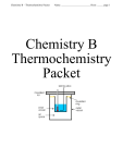 Chemistry B – Thermochemistry Packet Name: ________________________ Hour: _____ page 1 Chemistry B Thermochemistry Packet Chemistry B – Thermochemistry Packet Name: ________________________ Hour: _____ page 2 Desired Understandings Worksheet 1 P3.p2 Energy Transfer: Energy is transferred between nuclear, chemical, electrical, sound, and light. Worksheet 1 C3.3 Heating Impacts: Heating a substance increases its kinetic energy Worksheet 3 C3.4 Endothermic and Exothermic Reactions: Chemical interactions either release energy to the environment (exothermic) or absorb energy from the environment (endothermic). Worksheet 3 C3.1x Hess’s Law C3.1b Draw enthalpy diagrams for exothermic and endothermic reactions. Worksheet 4 C3.1x Hess’s Law C3.1a Calculate the ΔH for a given reaction using Hess’s Law. Worksheet 5 C3.1x Hess’s Law C3.1d Calculate the amount of heat produced for a given mass of reactant from a balanced chemical equation. Worksheet 6 C3.1x Hess’s Law C3.1c Calculate the ΔH for a chemical reaction using simple coffee cup calorimetry. Worksheet 7: Review of Worksheet 5 & 6 Worksheet 8 C3.4x Enthalpy and Entropy: There are two natural driving forces: (1) toward minimum energy (enthalpy) and (2) toward maximum disorder (entropy). Essential Questions Worksheet 2: If energy cannot be destroyed why do we worry about “saving” or “conserving” it? Worksheet 2: If energy doesn’t disappear why do people worry about an energy crisis? Worksheet 8: Why are some chemical reactions spontaneous while others are not? Chemistry B – Thermochemistry Packet Name: ________________________ Hour: _____ page 3 Worksheet 1: Types of Energy Thermochemistry is the study of heat (energy) changes during chemical and physical reactions. As chemists we define energy as anything that can cause a change in the position or properties of matter. We classify all forms of energy into two general categories – potential energy (stored energy) and kinetic energy (energy due to motion). Within each category, there are many different forms of energy. FORMS OF ENERGY POTENTIAL ENERGY KINETIC ENERGY Stored energy and energy of position The motion of waves, electrons, atoms, molecules and substances CHEMICAL ENERGY Stored in the bonds of atoms and molecules. Petroleum, natural gas, propane, and coal are examples. NUCLEAR ENERGY Stored in the nucleus of an atom – the energy that holds the nucleus together. The energy in the nucleus of a uranium atom is an example. STORED MECHANICAL ENERGY Stored in objects by the application of force. Compressed springs and stretched rubber bands are examples. GRAVITATIONAL ENERGY Energy of place or position. Water in a reservoir behind a hydropower dam is an example. RADIANT ENERGY (LIGHT) Electromagnetic energy that travels in waves. Solar energy is an example. THERMAL ENERGY (HEAT) Internal energy in substances – the vibration or movement of atoms and molecules in substances. Geothermal is an example. MOTION Movement of a substance from one place to another. Wind and hydropower are examples. SOUND Movement of energy through substances in waves. ELECTRICAL ENERGY Movement of electrons. Lightning and electricity are examples. The law of conservation of energy states that energy does not disappear, it just changes forms. This means that energy is neither created nor destroyed. There is an important relationship between the terms energy, heat, temperature and kinetic energy. In order to understand this relationship, consider the following scenario. There are two containers of sand, one filled about one-thirds of the way and the other filled to the top. Since they have been in the same environment, they should be the same temperature. Each student in class shakes both containers and the final temperatures are recorded. Predict how the temperatures will compare: _____________________________________________________ Shaking the container, we moved the grains of sand, causing them to collide with each other. They rubbed against each other, causing friction between the particles and producing thermal energy (heat). We transformed motion energy into thermal energy (heat). The increase in temperature was greater for the container that was only one-third full, because the partially full container has more space in it for the sand to move around. The grains of sand collide with each other with greater speed. More speed means more kinetic energy (motion). In the container filled with sand, the grains of sand have little space to move. Considering the previous example, explain in a few sentences how energy, heat, temperature and kinetic energy are related: ____________________________________________________________________ ____________________________________________________________________________________ ____________________________________________________________________________________ Chemistry B – Thermochemistry Packet Name: ________________________ Hour: _____ page 4 Whether we realize it or not, we experience energy transformations- conversions from one type of energy to another, on a regular basis. Consider the transformations in a cell phone. When the phone is charging electrical energy is transformed to chemical energy in order to be stored in a battery. This chemical energy can be transformed to light energy (screen), sound energy (ring tone), motion (vibration). In the original example the energy flow from shaking the containers of sand originated from our sun. Let’s start with the thermal energy, or heat, we produced as a result of the motion our bodies provided. Our bodies got the energy to shake the container from the food we ate. The energy was stored in the food as chemical energy in the bonds of the molecules. Chemical energy is stored in food through photosynthesis. Sunlight, or radiant energy, changes water and carbon dioxide into the glucose and oxygen in plants. Glucose is a sugar with lots of energy— chemical energy. Nuclear energy produced the