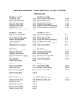 Alpha & Beta Trophies Meeting – Lee Valley Athletics Centre – Saturday 18th April, 2009 Alpha Senior Trophy 100 Metres ‘A’ (+1.7) 1.Tara Kafke (Rad) 2.Bunmi Awokoya (S&NH) 3.Michelle Watson (HHH) 4.Charlotte Cullen (HPX) 5.Angelika Brown (E&H) 6.Bex Redding (D&T) 7.Checkube Onwuke (Hav Mayes) 12.20 12.24 12.47 12.71 12.85 13.33 13.43 200 Metres ‘A’ (+1.9) 1.Rachel Telfer-James(E&H) 2.Tara Kafke (Radley) 3.Funto Fabiumi-Alade (HHH) 4.Bunmi Awokoya (S&NH) 5.Laura Jones (HPX) 6.Liz Gale (D&T) 7.Nina Brennan (Hav Mayes) 24.82 25.32 25.41 25.62 26.42 27.68 29.76 100 Metres ‘B’ (+1.8) 1.Funto Fabiumi-Alade (HHH) 2.Frances Slater (HPX) 3.Kay Reynolds (Rad) 4. Natasha Brunning (D&T) 5.Joylyn Saunders-Mullins (S&NH) 6.Hannah Gamester (Hav Mayes) 12.46 12.65 12.70 13.58 13.82 13.98 200 Metres ‘B’ (+2.7) 1.Michelle Watson (HHH) 2.Kay Reynolds (Rad) 3.Emily Stevens (HPX) 4.Chloe Van Wulven (Hav Mayes) 5.Angelika Brown (E&H) 6.Joylyn Saunders-Mullins (S&NH) 7.Elena Cherry (D&T) 25.7 26.2 26.4 27.3 27.6 28.5 29.5 400 Metres ‘B’ 1.Nikki Silva (E&H) 2.Stephanie Sattin (HPX) 3.Susan Keet (Rad) 4.Nina Brennan (Hav Mayes) 5.Lesley Hopkins (D&T) 6.Claire Ward (S&NH) 60.36 61.36 61.62 64.35 64.71 70.61 400 Metres ‘A’ 1.Michelle McNamara (E&H) 2.Deborah Willis (HPX) 3.Monique Davies (HHH) 4.Katie Richardson (Hav Mayes) 5.Chloe Vernon-Hamilton(S&NH) 6.Liz Gale (D&T) 7.Lauren Tolmie (Rad) 57.80 58.80 60.24 60.71 63.27 63.67 63.84 800 Metres ‘A’ 1.Emma Kemp (S&NH) 2.Nikki Silva (E&H) 3.Vicky Smith (Hav Mayes) 4.Vicky Samson (D&T) 5.Jemma Grace (Rad) 800 Metres ‘B’ 2-17.0 1.Katie Brown (E&H) 2-20.60 2.Charlotte Baird (S&NH) 2-27.25 3.Louise Oliver (Rad) 2-33.16 2-59.54 1500 Metres ‘A’ 1.Sara Luck (Hav Mayes) 2.Emma Kemp (S & NH) 3.Ella Fuller (HPX) 4.Julia Wedmore (HHH) 5.Vicky Samson (D&T) 6.Louise Somaroo (E&H) 7.Moira Thresher (Rad) 1500 Metres ‘B’ 4-40.69 1.Ingrid Dean (Hav Mayes) 4-55.59 2.Naomi Handley (Rad) 5-06.77 5-08.08 5-20.12 5-24.01 6-06.01 2-23.26 2-43.06 3-15.31 5-01.45 7-15.22 100 Metres Hurdles ‘A’ (+2.7) 1.Kay Reynolds (Rad) 2.Chloe Van Wulven (Hav Mayes) 3.Natalie Farman (HPX) 4.Jenny Honeyball (HHH) 5.Sandra Reed (S&NH) 6.Val Pritchard (D&T) 100 Metres Hurdles ‘B’ (+1.9) 14.49 1.Lauren Thompson (HPX) 14.82 2.Paula Woodland (Rad) 16.03 3.Jess Barber (S&NH) 17.26 19.15 22.59 400 Metres Hurdles ‘A’ 1.Emily Stevens (HPX) 2.Kristy Wilson (E&H) 3.Paula Woodland (Rad) 4.Claire Brennan (Hav Mayes) 5.Sophie Lee (D&T) 6.Jenny Honeyball (HHH) 7.Sandra Reed (S&NH) 66.42 68.37 68.93 70.07 70.42 70.67 71.38 15.57 17.68 20.81 400 Metres Hurdles ‘B’ 1.Laura Jones (HPX) 2.Lauren Tolmie (Rad) 3.Claire Ward (S&NH) 4.Elena Cherry (D&T) 66.72 69.31 73.62 74.48 High Jump ‘B’ 1.Gemma Armorgie (HPX) 2.Louise Brown (Rad) 3=Beth Grimsey (E&H) 3=Anne Rees (S&NH) 5.Natasha Brunning (D&T) 1.50m 1.50m 1.50m 1.50m 1.40m Long Jump ‘B 1.Dee Bakre (E&H) (+2.7) 2.Charlotte Cullen (HPX) (+1.6) 3.Solhie Lee (D&T)(+1.1) 4.Louise Brown(Rad)(+1.8) 5.Jennifer Longwell (+1.6) 6.Chloe Hamilton (S&NH)(+2.1) 7.Chekube Onwauka (Hav Mayes)(+1.6) 5.25m 4.61m 4.61m 4.57m 4.41m 4.21m 3.85m High Jump ‘A’ 1.Moe Sasegbon (S&NH) 2.Chloe Van Wulven (Hav Mayes) 3=Sam Molyneux (E&H) 3=Jenny Hutchings (HPX) 5.Kay Reynolds (Rad) 6.Sophie Lee (D&T) 1.65m 1.60m 1.50m 1.50m 1.50m 1.45m Long Jump ‘A’ 1.Davinia Houston(E&H)(+1.6) 2.Natalie Farman (HPX)(+1.6) 3.Natasha Brunning (D&T)(+3.4) 4.Charlotte Nkoomsom (HHH)(+2.1) 5.Moe Sasegbon (S&NH)(+1.4) 6.Susan Keet (Rad)(+1.1) 7.Zoe Young (Hav Mayes)(+3.0) 5.48m 5.20m 5.00m 4.95m 4.92m 4.75m 4.18m Shot ‘A’ 1.Brinoy Phillips (HHH) 2.Shelley McLellan (S&NH) 3.Melanie Harrison (Hav Mayes) 4.Laura Jones (HPX) 5.Evaun Williams (E&H) 6.Natasha Mighty (Rad) 7.Sarka Robinson (D&T) Shot ‘B’ 11.25m 1.Gabriella Roseje (HHH) 10.92m 2.Peta Lundgren (HPX) 10.86m 3.Anna Rees (S&NH) 10.35m 4.Louise Oliver (Rad) 8.93m 5.Felicia Rudolfo (E&H) 8.72m 6.Nina Brennan (Hav Mayes) 8.44m 7.Charlotte Brooks (D&T) 10.21m 9.77m 8.58m 8.41m 8.27m 7.43m 6.70m Discus ‘A’ 1.Melanie Harrison (Hav Mayes) 2.Briony Phillips (HHH) 3.Hannah Tartaglia (Rad) 4.Charlotte Brooks (D&T) 5.Evaun Williams (E&H) 6.Sarah Miller (HPX) 7.Frances Gross (S&NH) Discus ‘B’ 37.47m 1.Jacqui Cherry (Rad) 31.91m 2.Lauren Clark (Hav Mayes) 30.23m 3.Sarah Robinson (D&T) 28.50m 4.Gabriella Roseje (HHH) 27.53m 5.Izzy Krassismenou (E&H) 26.23m 6.Peta Lundgren (HPX) 22.57m 7.Becky Knapp (S&NH) 30.02m 29.55m 26.07m 26.00m 22.51m 22.43m 21.88m Javelin ‘A’ 1.Peta Lundgren (HPX) 2.Emma Christmas (Hav Mayes) 3.Charlotte Kauni Pariss(HHH) 4.Evaun Williams (E&H) 5.Aislinn Baird (Rad) 6.Liz Gale (D&T) 7.Chloe Hamilton (S&NH) Javelin ‘B’ 39.42m 1.Kate Grehan (HPX) 37.86m 2.Zoe Young (Hav Mayes) 33.24m 3.Brinoy Phillips (HHH) 29.48m 4.Felicia Rudolfo (E&H) 27.27m 5.Sarka Robinson (D&T) 26.81m 6.Anne Rees (S&NH) 24.86m 7.Louise Oliver (Rad) 34.80m 31.17m 29.35m 29.27m 25.38m 21.68m 20.65m 4x100 Metres Relay 1.Herts Phoenix 2.Enfield & Haringey 3.Radley 4.Herne Hill Harriers 5.Stevenage & North Herts 6.Havering Mayesbrook 7.Dacorum & Tring 50.69 50.77 51.07 51.94 51.95 52.83 53.64 Trophy Result 1.Herts Phoenix 2.Radley 3.Enfield & Haringey 4.Stevenage & North Herts 5.Havering Mayesbrook 6.Herne Hill Harriers 7.Dacorum & Tring 165.5 162 141 138.5 134 123 110 Alpha Under 15 Girls Trophy 100 Metres ‘A’ (+4.7) 1.Desiree Henry (E&H) 2.Jatila Reavil-Blake (D&T) 3.Kim Sutherland (Rad) 4.Isabella Cacciatore (HPX) 5.Bethany Chambers (Hav Mayes) 6.Alex Gates (S&NH) 7.Toshin Babajide (HHH) 200 Metres ‘A’ (+2.4) 1.Desiree Henry (E&H) 2.Jatih Reauil-Blake (D&T) 3.Kim Sutherland (Rad) 4.Isabella Cacciatore (HPX) 5.Lucy Allen (Hav Mayes) 6.Alex Gates (S&NH) 7.Lacerna Peterkin (HHH) 12.01 12.63 13.09 13.68 13.79 14.12 14.31 100 Metres ‘B’ (+3.6) 1.Leanne Spurway (Rad) 2.Pippa Mills (D&T) 3.Emma Slater (HPX) 4.Mary Fasipe (E&H) 5.Ayo Awokoya (S&NH) 6.Sophie Reynolds (Hav Mayes) 7.Victoria Sita
