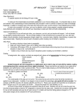 AP BIOLOGY Teacher: Joshua Baker Email: bakersci@gmail.com Phone: (510) 796-1776 x57608 I have not failed. I've just found 10,000 ways that won't work. -Thomas Edison Class Objective(s): To prepare students for the Biology AP exam in May AND … To build upon the fundamentals and principles established in your (honors) biology class. It is imperative that you have and maintain a firm understanding of those fundamentals and principles in order to continue to expand your base of knowledge. Essentially, in addition to revisiting many of the topics from that previous year, we will construct a more detailed picture of them. In order to be successful in this class, you must: be attentive, come to class prepared, complete assigned readings, study effectively and consistently, and work with your classmates to assist each other and build understanding. Classroom/Lab Behavior: I expect that all of you will treat each other, your classroom, your lab, and your teacher with respect. I will not tolerate any derogatory remarks about anyone. This can include insulting or crude comments due to someone’s sex, race, skin color, religion, sexual orientation, physical appearance (height, weight, etc.), economic status, disability, dress/clothing, or speech (the way someone talks). Breaking this rule will result in disciplinary action including, but not limited to, detention. Other Rules: 1. No eating or drinking in class (water is acceptable) 2. Raise your hand to speak in class, and no talking when others are talking 3. Cell phones, MP3 players, PSPs, etc. must be off or on silent/vibrate mode during class (if your device causes a disruption in class or lab, I will confiscate it) Violation of any of these rules may result in disciplinary action including, but not limited to, detention Grading: All assignments, labs, quizzes, and tests are assigned point values and will approximate the following percentages: Tests & Quizzes 55% Labs 30% Homework/Classwork 7.5% Semester Final 7.5% Graded homework will not be assigned on a nightly basis, but in order to stay on track with the material, reading and studying should be a common part of your nightly schoolwork. Please note that the vast majority of your grade will be dictated by your performance on tests, quizzes and labs. This is in order to better prepare you for the forthcoming AP exam. Quizzes will occur on both an announced and unannounced basis. The scale for grades is as follows: * An N.O.F. (Notice Of Failure) will be awarded to students who have less than 70% 100 – 90% B 69 – 60% A 79 – 70% D F 89 – 80% C 59% and below The overall grades in this class are not curved. The scores that you earn are the scores that will be recorded and applied to your class grade. In addition, if you happen to have a boarder-line percentage, your grade will not be rounded. For example, an 89.99% would be a B, whereas a 90.00% would be an A. Please, save yourself and myself time by not asking me later if I will give you an A if your grade is an 89.99% … because the answer will, most definitely, be “no.” AP Exam & Class Grade: All students are expected to take the AP exam. Students who opt not to take the exam may have their transcript edited so that the “AP” designation is removed from the class name. Students who’ve earned a failing grade for one (or both) semesters and pass the AP exam (score of 3 or better) will have their failing grade(s) changed to a “D.” No other grade changes will be considered for AP exam performance. AP BIOLOGY 2011 – 12 Tests & Quizzes: Each of the thirteen units of study is concluded with a unit exam that consists of forty, multiple-choice questions (25 minutes) and one essay question (22 minutes). The date for each of these exams is included on the AP Biology Syllabus. Students who are absent, regardless of the reason, will be given an alternate exam (only if the absence is excused). The alternate will consist of fill-in, short-answer, and essay questions (47 minutes total for all portions). Students will have as many days to make up the exam as they were absent. If a student was ONLY absent on the test date, he/she will make up the exam the date of their return. At the discretion of the teacher, in instances where a number of students are absent on an exam date, a mandatory, one-time-only after school make-up opportunity will be scheduled. If a student misses that make-up, a zero will be recorded for that test. If a quiz is missed due to an absence, regardless of the reason, an alternate quiz will be administered (only if the absence is excused). Although the overall grades in this class are not curved, the scores on the unit tests will be curved. The curve will be based on the highest score earned out of all students from any period of AP biology. Labs: For AP biology, the College Board has published a lab manual that includes twelve activities that compliment and enhance the coursework. The manual is not free of charge, and students are strongly recommended to purchase one. Each of the lab activities will be preceded by a PreLab assignment that must be completed in order to participate in the lab activity. Students who do not complete a PreLab assignment will not participate in that lab activity and will receive a zero for said lab. A lab quiz will follow each activity and will test the student’s knowledge and comprehension of the activity. Class Work & Homework: All of the classwork, homework, notes, etc. that you produce will be required to have the same heading at the top of your page. The format for the heading is at the right. You must also include the assignment title on the top line of your paper. If you fail to include this heading, it will be returned to you and you will receive a zero for the assignment. All assignments and labs (sketches, graphs, data tables, etc.) must be completed in blue or black INK (class notes may be done in pencil). Any work completed in pencil will not be accepted. Unless otherwis