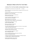 Allusions to Music in The New York Times A selection of New York Times headlines containing allusions to songs. (To identify the ones you don’t know, ask someone older — or younger. ) Play the Allusions Game with friends and family by singing at least the first line of the songs you recognize. A museum exhibit of jewelry once owned by a Russian dynasty: Diamonds Are a Czar’s Best Friend Brides-to-be slim down for their wedding dresses: Get Me to the Gym On Time A review of a concert of Jimmy Van Heusen songs: Up There, Where the Air is Rarefied Offbeat publications for Civil War buffs: Mine Eyes Have Seen the Coming of a Lot of Wacky Stuff Computer based slot machines in Las Vegas: Luck, Be a Microchip Tonight Reviews of six Queens, N.Y. restaurants: Over the River and to the Food A new minor league baseball team’s first game in its Newark, N.J. home stadium: A Home Team to Root, Root, Root For A review of singer KT Sullivan’s cabaret show of Jerome Kern songs: The Music is Sweet, the Words Are True A review of a film about rehearsing for “Hamlet”: There is Nothing Like a Dane A review of a television movie about Frank Sinatra’s Rat Pack: Extremes With Impossible Schemes A greenhouse manager and his family live in the New York Botanical Garden: A Cunning Cottage 3 Could Share (Public Invited) Caring for rooftop gardens in New York City: On City Roofs, It’s Not Easy Being Green The cleaning and restoration of the flag that inspired Francis Scott Key: New Dawn for Flag That Was Still There A New York Times reporter’s queasy experience on a trapeze: The Greatest of Unease Two New York fashion designers talk about the latest designs, their own and others: Everything’s Coming Up Froufrou Sidney Blumenthal, a White House adviser, is deposed before members of Congress: A Very Model of a Modern Gentleman A summer day camp specializing in rock music: Hello Fender, Hello Gibson A company that makes custom-made shoes: These $2,000 Boots Are Made for Walking The excavation of a 17th-century pleasure garden across the river from the Taj Mahal: What a Little Moonlight Can Do Foreigners spending a lot of money in New York City because of the value of their currency against the dollar: They’ll Take Manhattan, in Cash The Manhattan cocktail is seeing a resurgence of popularity (1998): I’ll Take Manhattan (Brooklyn, Too) Post offices are removing children’s names and addresses from Christmas letters to Santa, and replacing them with a control number, before they are given to people who will be their Secret Santas: He’s Making a List, Redacting It Twice Contrasting the Miss America contest and the environment of Atlantic City: Here She Comes, Amid the Tawdry It appeared to everyone watching the opening of the 2009 Beijing Olympics, that sevenyear-old Yang Peiyi was singing the national anthem. Actually, the voice was that of nine-year-old Lin Liaoke, who sang from backstage: I’m Singin’ In Beijing People trying to sleep on Coney Island’s beach during a heat wave, with crashing waves on one side of them and a roller coaster and go-carts on the other: By the Sea, by the Sea, By the Cool, Noisy Sea Upscale food is being served at some baseball stadiums: Buy Me Some Sushi and Baby back Ribs During the Christmas holiday season, lost, misdirected and misplaced baggage has piled up at New York airports: Here a Bag, There a Bag, Everywhere a Stranded Bag An interview with Billy Joel prior to two July 2008 concerts: Just the Way He Is Uncertainty in September over who will win a November Congressional election in Texas: A Leading Democrat’s Theme: It’s a Long, Long Time From Now Till November Frank Sinatra’s death, in May 1998, brought an outpouring of pride and a deep sense of loss among residents of his New Jersey home town: It’s All or Nothing at All for Frank Sinatra in His Hometown, Hoboken The swiftness with which United Airlines stock plummeted in value after an untrue bankruptcy report triggered computers to automatically devalue its stock before human intervention could correct the error: I Got the News Instantaneously, Oh Boy Andrea McCardle, the star of the original “Annie,” on Broadway, is reviewed at the age of 44 after appearing at a top Manhattan cabaret: Bet Your Bottom Dollar, She Survived “Tomorrow” Merv Griffin, TV talk show host, creator of “Jeopardy” and “Wheel of Fortune,” and owner of the Beverly Hilton Hotel, talks about his business interests: Lov-e-ly Bunch of Businesses Keep Merv Griffin Singing A review of George Gershwin CD’s: Life Is One Long Jubilee Growing, cooking and eating one of the less popular vegetables: Growing Beets: It’s Not Easy Being Crimson In Manhattan’s Battery Park City neighborhood, adults try out a trapeze swing: Would You Like to Swing on a Bar Canada top five banks control 93 percent of the banking industry’s assets: O Canada, land of Few Banks The demise of WQEW, a New York radio station devoted to popular standards, and of Rainbow and Stars, New York’s premier cabaret: The Memory of Love’s Refrain and a subheadline Standards Lose Two New York Outlets. But the Music? They can’t Take That Away. A review of a TV program about the acclaimed race horse Seabiscuit. They Had The Horse Right Here In 1938 Alzheimer’s disease has a major role in the novel “The Story of Forgetting,” reviewed in The Times: You Promised That You’d Forget Me Not, but You Forgot to Remember A review of a TV program about the lives of Richard Rodgers and Lorenz Hart: Thou Rodgers, Thou Hart, So Fizzy, So Smart The New York Yankees baseball team on a losing streak: Yankees: That’s Life, Shot Down in April Madonna signs her new book, “The English Roses,” at a Manhattan Barnes & Noble: Like a Children’s Author, For the Very First Times Freshening up Halifax, Nova Scotia’s appearance prior to an industrial nations’ summit meeting included temporarily hiding a parking lot under sod, shrubs and flowers: Hali