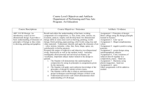 Course Level Objectives and Artifacts Department of Performing and Fine Arts Program: Art Education Course Descriptions Course Objectives / Outcomes Artifacts / Evidence ART 110 2D Design: An introductory course in twodimensional design. It provides a basic understanding of elements of principles of design as they relate to drawing, painting and graphics. Recall and utilize the understanding of the basic working components of a composition, i.e. line, form, color, texture, etc. Examine, analyze, employ and develop basic two-dimensional design skills in some areas such as drawing, painting, textile design, block printing, paper pasting, relief works using clay and other materials. Understand, identify and apply the elements of art – color, texture, intensity, value, line, form, shape, space, etc. satisfactorily in his/her projects. Research the nature of subjective and objective two-dimensional works, historically as well as the modern world. Articulate intelligently about personal and universal art themes, art vocabulary, important subject matter related to the design in general. 1. The Student will demonstrate the understanding of composition by using its principles in assignments given by the instructor. 2. The Student will apply and synthesize knowledge of the principles of design by taking written exams. 3. The Student will be able to analyze and demonstrate proper techniques used through critiques of their work. 4. Understand and create work which demonstrates their understanding of 2-D design. Assignment 1: Principles of design: Basic collage using the design principle learned in lectures. Assignment 2: Line/ op art Assignment 3: Shape/complimentary colors Assignment 4: negative positive using portraits. Assignment 5: create design using autobiographical subjects Assignment 6: Crete variations of subjects then fit together in a composition, music. Hand out. Assignment 7: Harmony using photos/magazines. hand out Assignment 8: open Other assignments will be added as needed Course Descriptions ART 121 Drawing: basic principles of freehand drawing emphasizing elements and principles of art through self expression utilizing a variety of drawing media. Course Objectives / Outcomes Upon completion of this course, students will be able to: Demonstrate the use of basic art principles and elements. Demonstrate fundamental rules of foreshortening and perspective. Demonstrate basic posture and drawing material handling techniques. Demonstrate the effective use of principles to manipulate compositional space. Demonstrate varied applications of line quality, tonal variation, textured and atmospheric qualities. Demonstrate a clear understanding of theories, mechanics and image transfer. Become familiar with compositional subjects related to gesture, landscape, still life and abstract subjects. Analyze and describe the compositional structure observed in works of art as well as their drawings. Research through observation the work of other artists, movements, materials, and media. Demonstrate through research and execution the emergence of a personal style as gesture, conceptual or perceptual drawing. Artifacts / Evidence Analyze varied forms of drawing Vocabulary, tools and methods. Draw still life arrangements in the classroom. Draw architectural forms found in the environment. Draw reflective forms and surfaces from still life in the classroom. Draw varied textured surfaces and materials in the still life. Perform limited and extended drawing studies. Course Descriptions Course Objectives / Outcomes ART 123 Digital Design: basic The learner will be able to introduction of computer-based 1. Demonstrate an understanding of the Macintosh user skills in visual design. Limited interface graphic skills will be introduced to 2. Demonstrate an understanding of relevant industry assist in self-marketing, advertising standard software techniques, layout, and computer 3. Demonstrate an understanding of the vocabulary of digital generated images art and computer graphics 4. Locate unknown information about landscaping in common landscape references. 5. Synthesize information about art and technology through the creation of artwork ART 212 Introduction to Painting: 1. Demonstrate individual creativity, inventive The study of theories, methods, visualization and continuity in style and painting and painting techniques for techniques vs. eclectic in totality or replication. landscapes, still-life and varied 2. Master the transfer and application of design compositions with special principles and drawing methods in the emphasis on the elements and experimentation and manipulation of the twoprinciples of art in painting. dimensional visual plane. Prerequisite: ART 121 3. Demonstrate knowledge of surface treatment, brush techniques, color theory, as well as a direct and indirect approach to painting. 4. Utilize and experiment with a variety of tools, pigments, media, and application techniques throughout the course. 5. Become familiar with compositional construction and translation of still-life studies to the canvas. 6. Gain a fundamental knowledge of the painter’s tools, mediums, canvas construction, and the maintenance thereof. 7. Constructed, stretched, and primed a minimum of two Artifacts / Evidence 1. Art projects produced according to a rubric 2. Exams and Critiques 3. Sketchbooks Complete a minimum of 5 assignments Research Projects Critique Sessions canvases for completion in the class. 8. Actively engage and participate in an exhibition, classroom/faculty critique, and field trip activities. 9. Successfully completed a minimum of five painted projects for evaluation in this course. Furthermore, three completed paintings must be framed and submitted ready to hang. 10. Maintain a written journal/sketchbook of entries, sketches and ideas related to all video, slides, web sites, lists, or other resources presented during this class. 11. Assembled the minimum tools, materials, pigment, brushes, mediums