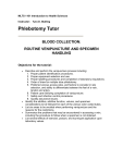 MLTS 1101 Introduction to Health Sciences Instructor: Tyra D. Stalling Phlebotomy Tutor BLOOD COLLECTION: ROUTINE VENIPUNCTURE AND SPECIMEN HANDLING Objectives for the tutorial: Describe and perform the venipuncture process including: 1. Proper patient identification procedures. 2. Proper equipment selection and use. 3. Proper labelling procedures and completion of laboratory requisitions. 4. Order of draw for multiple tube phlebotomy. 5. Preferred venous access sites, and factors to consider in site selection, and ability to differentiate between the feel of a vein, tendon and artery. 6. Patient care following completion of venipuncture. 7. Safety and infection control procedures. 8. Quality assurance issues. Identify the additive, additive function, volume, and specimen considerations to be followed for each of the various color coded tubes. List six areas to be avoided when performing venipuncture and the reasons for the restrictions. Summarize the problems that may be encountered in accessing a vein, including the procedure to follow when a specimen is not obtained. List several effects of exercise, posture, and tourniquet application upon laboratory values. VENIPUNCTURE PROCEDURE The venipuncture procedure is complex, requiring both knowledge and skill to perform. Each phlebotomist generally establishes a routine that is comfortable for her or him. Several essential steps are required for every successful collection procedure: 1. Identify the patient. 2. Assess the patient's physical disposition (i.e. diet, exercise, stress, basal state). 3. Check the requisition form for requested tests, patient information, and any special requirements. 4. Select a suitable site for venipuncture. 5. Prepare the equipment, the patient and the puncture site. 6. Perform the venipuncture. 7. Collect the sample in the appropriate container. 8. Recognize complications associated with the phlebotomy procedure. 9. Assess the need for sample recollection and/or rejection. 10. Label the collection tubes at the bedside or drawing area. 11. Promptly send the specimens with the requisition to the laboratory. ORDER FORM / REQUISITION A requisition form must accompany each sample submitted to the laboratory. This requisition form must contain the proper information in order to process the specimen. The essential elements of the requisition form are: Patient's surname, first name, and middle initial. Patient's ID number. Patient's date of birth and sex. Requesting physician's complete name. Source of specimen. This information must be given when requesting microbiology, cytology, fluid analysis, or other testing where analysis and reporting is site specific. Date and time of collection. Initials of phlebotomist. Indicating the test(s) requested. An example of a simple requisition form with the essential elements is shown below: LABELING THE SAMPLE A properly labelled sample is essential so that the results of the test match the patient. The key elements in labelling are: o o o o Patient's surname, first and middle. Patient's ID number. NOTE: Both of the above MUST match the same on the requisition form. Date, time and initials of the phlebotomist must be on the label of EACH tube. An example of a simple requisition form with the essential elements is shown below: EQUIPMENT: THE FOLLOWING ARE NEEDED FOR ROUTINE VENIPUNCTURE: o Evacuated Collection Tubes - The tubes are designed to fill with a predetermined volume of blood by vacuum. The rubber stoppers are color coded according to the additive that the tube contains. Various sizes are available. Blood should NEVER be poured from o o o o o o o o o o one tube to another since the tubes can have different additives or coatings (see illustrations at end). Needles - The gauge number indicates the bore size: the larger the gauge number, the smaller the needle bore. Needles are available for evacuated systems and for use with a syringe, single draw or butterfly system. Holder/Adapter - use with the evacuated collection system. Tourniquet - Wipe off with alcohol and replace frequently. Alcohol Wipes - 70% isopropyl alcohol. Povidone-iodine wipes/swabs - Used if blood culture is to be drawn. Gauze sponges - for application on the site from which the needle is withdrawn. Adhesive bandages / tape - protects the venipuncture site after collection. Needle disposal unit - needles should NEVER be broken, bent, or recapped. Needles should be placed in a proper disposal unit IMMEDIATELY after their use. Gloves - can be made of latex, rubber, vinyl, etc.; worn to protect the patient and the phlebotomist. Syringes - may be used in place of the evacuated collection tube for special circumstances. ORDER OF DRAW: Blood collection tubes must be drawn in a specific order to avoid crosscontamination of additives between tubes. The recommended order of draw is: 16. First - blood culture tube (yellow-black stopper) 17. Second - coagulation tube (light blue stopper). If just a routine coagulation assay is the only test ordered, then a single light blue stopper tube may be drawn. If there is a concern regarding contamination by tissue fluids or thromboplastins, then one may draw a non-additive tube first, and then the light blue stopper tube 18. Third - non-additive tube (red stopper or SST) 19. Last draw - additive tubes in this order: 1. Last draw - additive tubes in this order: 1. SST (red-gray, or gold, stopper). Contains a gel separator and clot activator. 2. Sodium heparin (dark green stopper) 3. PST (light green stopper). Contains lithium heparin anticoagulant and a gel separator. 4. EDTA (lavender stopper) 5. ACDA or ACDB (pale yellow stopper). Contains acid citrate dextrose. 6. Oxalate/fluoride (light gray stopper) NOTE:Tubes with additives must be thoroughly mixed. Erroneous test results may be obtained when the blood is not thoroughly mixed with the additive. NOTE:For plastic tubes, the order of draw for tubes 2 and 3 is reversed. PROCEDURAL ISSUES PATIENT RELATIONS AND IDENTIFICAT