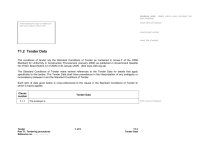 Guidance notes been compiled) (delete column when document has Insert name of employer Insert employer’s logo or delete box and move column over to left Insert project number Insert title of project T1.2 Tender Data The conditions of tender are the Standard Conditions of Tender as contained in Annex F of the CIDB Standard for Uniformity in Construction Procurement (January 2009) as published in Government Gazette No 31823, Board Notice 12 of 2009 of 30 January 2009. (See www.cidb.org.za). The Standard Conditions of Tender make several references to the Tender Data for details that apply specifically to this tender. The Tender Data shall have precedence in the interpretation of any ambiguity or inconsistency between it and the Standard Conditions of Tender. Each item of data given below is cross-referenced to the clause in the Standard Conditions of Tender to which it mainly applies. Clause number F.1.1 Tender Data Enter name of employer The employer is Tender Part T1: Tendering procedures Reference no . . . . . . . . . . . . . . 1 of 9 T1.2 Tender Data F.1.2 F.1.2 The Tender Documents issued by the Employer comprise the following documents: THE TENDER Part T1: Tendering procedures T1.1 - Tender notice and invitation to tender T1.2 - Tender data Part T2: Returnable documents T2.1 - List of returnable documents T2.2 - Returnable schedules THE CONTRACT Part C1: Agreements and Contract data C1.1 - Form of offer and acceptance C1.2 - Contract data C1.3 - Performance Bond C1.4 - Adjudicator’s contract Part C2: Pricing data C2.1 - Pricing instructions C2.2 - Bill of Quantities Part C3: Scope of work C3 - Scope of work Part C4: Site information C4 - Site information Use for single volume approach. Delete row if a three volume approach is adopted. The tender documents issued by the employer comprise: Volume 1: Tendering procedures T1.1 Tender notice and invitation to tender T1.2 Tender data Volume 2: Returnable documents T2.1 List of returnable documents T2.2 Returnable schedules C1.1 Form of offer and acceptance C1.2 Contract data (part 2) C2.2 Activity schedules / Bills of Quantities Volume 3: The contract Part C1: Agreements and contract data C1.2 Contract data (part 1) C1.3 Form of Guarantee C1.4 Adjudicator’s Contract Part C2: Pricing data C2.1 Pricing instructions Part C3: Scope of work C3 Scope of work Part C4: Site information C4 Site information Use for 3 Volume approach and delete row if single volume approach is adopted. Tender Part T1: Tendering procedures Reference no . . . . . . . . . . . . . . 2 of 9 Revise list of documents as necessary. Delete C1.4 Adjudicator’s Contract if contract is not concluded when a dispute arises. Revise list of documents as necessary. (Part 2 of the contract data contains the data which tenderers are to submit). T1.2 Tender Data F.1.4 The employer’s agent is : Enter data. (Name and contact particulars of employee or external agent) Name: …………………….. Address: ………………….. Tel: ………………….......... Fax: ……………………….. E-mail: ……………………. Select appropriate statement or delete row if the competitive negotiation procedure or proposal procedure using the two stage system is not to be used. Insert 1 or 2 after option where the two stage procedure is to be applied. F.1.6 The competitive negotiation procedure shall be applied. F.1.6 Option F.2.1 Only those tenderers who satisfy the following eligibility criteria are eligible to submit tenders: Modify statement, state eligibility criteria if other than that relating to contractor grading designation requirements or delete row. F.2.1 Only those tenderers who are registered with the CIDB, or are capable of being so prior to the evaluation of submissions, in a contractor grading designation equal to or higher than a contractor grading designation determined in accordance with the sum tendered, or a value determined in accordance with Regulation 25 (1B) or 25(7A) of the Construction Industry Development Regulations, for a or class of construction work, are eligible to have their tenders evaluated. Delete row where i) the contract involves supplies or services; ii) the employer has in place a targeted programme of development and there are supportive arrangements in place for potentially emerging contractors. Insert preferably a single class of construction works, but not more than two classes, that represents the works to be performed e.g. ……. for a GB or CE class of construction works). of the proposal procedure using the two stage-system shall be applied. Joint ventures are eligible to submit tenders provided that: 1. every member of the joint venture is registered with the CIDB; 2. the lead partner has a contractor grading designation in the and or class of construction work; 3. the combined contractor grading designation calculated in accordance with the Construction Industry Development Regulations is equal to or higher than a contractor grading designation determined in accordance with the sum tendered for a or class of construction work or a value determined in accordance with Regulation 25 (1B) or 25(7A) of the Construction Industry Development Regulations. Tender Part T1: Tendering procedures Reference no . . . . . . . . . . . . . . 3 of 9 T1.2 Tender Data F.2.1 The following tenderers who are registered with the CIDB, or are capable of being so registered prior to the Delete row where: i) the contract involves supplies or services; evaluation of submissions, are eligible to have their tenders evaluated: ii) an employer does not have in place a targeted programme of development or there are no supportive arrangements in place for potentially emerging contractors. Insert preferably a single class of construction works, but not more than two classes, that represent the works to be performed e.g. ……. for a GB or CE class of construction works). a) contractors who have a contractor grading designation equal to or higher than a co