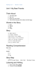Reading Cue 1 Teacher’s Guide Unit 1 My Best Friends Think Aloud 1. 2. 3. 4. I see three girls. Yes, I do. S/He is fun and smart. I like him/her because s/he makes me feel happy. Words in the Story 1. 2. 3. 4. kind friends play funny Story 내 이름은 팀입니다. 내 친구들을 소개할게요. 이쪽은 존입니다. 존은 친절해요. 이쪽은 주디입니다. 주디는 재미있어요. 그들은 나의 가장 좋은 친구들입니다. 이리 와서 우리와 함께 놀아요! 우리는 늘 재미있게 지내요. Reading Comprehension Main Idea 1. b Details 2. b 3. a 4. fun Story Map (왼쪽부터) Judy / funny John / kind Listening and Writing 1. This is Judy. She is funny. 2. They are my best friends. Soo-hyun / funny Reading Cue 1 Teacher’s Guide 3. Come and play with us! 4. We always have fun. Word Challenge Workbook Vocabulary Practice 1. kind 2. friends 3. funny 4. play Sentence Practice 1. This is John. 2. She is funny. 3. They are my best friends. 4. Come and play with us! 5. We always have fun. Reading Cue 1 Teacher’s Guide Unit 2 Fresh Fruit Think Aloud 1. 2. 3. 4. I see fruit. I like the strawberries the best. My favorite fruit is grapes. Grapes taste sweet. Words in the Story 1. 2. 3. 4. fruit sweet orange taste Story 오렌지는 맛이 좋아요. 복숭아도 맛이 좋아요. 둘 다 매우 부드럽고 달아요. 나는 오렌지 하나를 원해요. 나의 남동생들은 복숭아 두 개를 원해요. 우리는 정말 과일을 좋아해요. 당신은 어떤 과일을 좋아하나요? Reading Comprehension Main Idea 1. a Details 2. b 3. a 4. sweet Story Map (왼쪽부터) taste soft sweet Listening and Writing 1. Oranges taste good. 2. They are so soft and sweet. 3. My brothers want two peaches. Reading Cue 1 Teacher’s Guide 4. What fruit do you like? Word Challenge f r o u r i t a s t e n g s w e e t Workbook Vocabulary Practice 1. taste 2. fruit 3. sweet 4. orange Sentence Practice 1. Oranges taste good. 2. I want an orange. 3. My brothers want two peaches. 4. We really like fruit. 5. What fruit do you like? Reading Cue 1 Teacher’s Guide Unit 3 What Is It? Think Aloud 1. 2. 3. 4. I see a boy and his mom. He hurt his knee. I often hurt my hands. I hurt my hands because I fall off my bike. Words in the Story 1. 2. 3. 4. elephant nose eye ear Story 그것은 커다란 귀를 가졌니? 그래, 커다란 귀를 가졌어. 그것이 기다란 코를 가졌니? 그래, 기다란 코를 가졌어. 그것이 커다란 눈을 가졌니? 아니, 그렇지 않아. 그것은 코끼리지? 맞아, 코끼리야! Reading Comprehension Main Idea 1. a Details 2. a 3. a 4. nose Story Map (왼쪽부터) nose eyes ears Listening and Writing 1. Does it have big ears? Reading Cue 1 Teacher’s Guide 2. Does it have a long nose? 3. No, it doesn’t. 4. Is it an elephant? Word Challenge Students will draw a picture of their best friend. Workbook Vocabulary Practice 1. ear 2. eye 3. elephant 4. nose Sentence Practice 1. Does it have big ears? 2. Does it have a long nose? 3. Does it have big eyes? 4. No, it doesn’t. 5. Is it an elephant? Reading Cue 1 Teacher’s Guide Unit 4 In My Garden Think Aloud 1. 2. 3. 4. I see many kinds of plants. I can see plants in a garden. I like the yellow flowers. I like it because my favorite color is yellow. Words in the Story 1. 2. 3. 4. plant flower garden water Story 이게 뭘까요? (맞춰 보세요.) 이것은 노랗고 작아요. 이것은 내 정원에서 자라고 있어요. 이것은 아주 좋은 향기가 나요. 맞아요! 바로 꽃이예요! 꽃은 식물입니다. (꽃은 식물의 한 종류입니다) 식물은 해를 좋아해요. 식물은 물도 좋아해요. Reading Comprehension Main Idea 1. b Details 2. a 3. a 4. flower Story Map (왼쪽부터) sun water plant Listening and Writing 1. It is yellow and small. Reading Cue 1 Teacher’s Guide 2. It grows in my garden. 3. It smells great. 4. A plant likes water, too. Word Challenge Students will draw pictures as the sentences describe. Workbook Vocabulary Practice 1. plant 2. garden 3. water 4. flower Sentence Practice 1. It is yellow and small. 2. It grows in my garden. 3. Yes, it is a flower! 4. A flower is a plant. 5. A plant likes water, too. Reading Cue 1 Teacher’s Guide Unit 5 It’s My Birthday! Think Aloud 1. 2. 3. 4. I see a birthday party. It’s the grandmother’s birthday. My birthday is July 29. On my birthday, I eat cake and play with my friends. Words in the Story 1. 2. 3. 4. cake party birthday present Story 오늘은 나의 생일입니다. 나는 7살이 되었습니다. 나의 생일파티가 열리고 있어요. 이것은 나의 생일 케이크입니다. 이것들은 나의 생일선물들입니다. 여기 커다랗고 노란 상자가 하나 있어요. 안에 무엇이 들어있을까요? 나는 당장 상자를 열어보고 싶어요! Reading Comprehension Main Idea 1. a Details 2. a 3. b 4. presents Story Map (왼쪽부터) party cake present Listening and Writing 1. Today is my birthday. Reading Cue 1 Teacher’s Guide 2. I am seven years old. 3. What’s inside? 4. I want to open it now! Word Challenge PLEASE COME TO MY PARTY! Workbook Vocabulary Practice 1. cake 2. present 3. party 4. birthday Sentence Practice 1. I am seven years old. 2. This is my party. 3. These are my presents. 4. There is one big, yellow box. 5. I want to open it now! Reading Cue 1 Teacher’s Guide Unit 6 A Hotdog for Hotdog Think Aloud 1. 2. 3. 4. I see a spider, a puppy, and a lizard. I like the puppy the best. Yes, I have a dog. He likes to eat dog food. Words in the Story 1. 2. 3. 4. love hotdog sell call Story 핫도그! 너 어디 가니? 이리로 돌아와! 이런, 안되! Mr. Lee다. 그는 핫도그를 판다. 나는 그가 파는 핫도그를 좋아한다. 하지만 우리 개는 그가 파는 핫도그를 너무 너무 좋아한다. 그래서 우리는 그를 핫도그라고 부른다. Reading Comprehension Main Idea 1. a Details 2. b 3. b 4. loves St