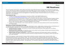 Share HIE Readiness This tool acquaints nursing homes with the efforts being made to form health information exchange (HIE) organizations throughout the country, and to determine readiness for participation in any formal HIE program in local communities. The concept of exchange of health information is an important one for nursing homes because of the considerable movement of individuals across care delivery organizations. This tool provides resources and suggestions for improving exchange of health information across the continuum of care, which aids in care coordination. Instructions for Use 1. Consider the business case for participating in some form of HIE. Use the HIMSS Dashboard tool (www.himss.org/StateDashboard/default.aspx) to obtain information about HIE activity in your state. 2. Use the Readiness Checklist that follows to determine your specific needs with respect to formal and informal exchange of health information across the continuum of care. Use the checklist as a trigger to develop policies and procedures for such exchange, paper-based forms that are more amenable to providing needed information, functional requirements for your HIT selection, and ideas for other technology supports for information management and exchange. 3. Complete the Technical Security Control Analysis table below to identify your current technical security controls and determine any needed changes. Definitions of Health Information Exchange The National Alliance for Health Information Technology, under federal contract, sought industry consensus on the use and definitions of specific information technology terms. The following terms and definitions were included in its May 20, 2008, report: Health information exchange: The electronic movement of health-related information among organizations according to nationally recognized standards. Health information organization: An organization that oversees and governs the exchange of health-related information among organizations according to nationally recognized standards. Regional health information organization: A health information organization that brings together health care stakeholders within a defined geographic area and governs health information exchange among them for the purpose of improving health and care in that community. Despite these definitions, health information exchange (HIE) has different meaning to different groups. In general, HIE is about exchanging health information across disparate settings. This may include providers exchanging information outside their integrated delivery network and among organizations that may compete with one another. Participants in an HIE may include all types of providers, including hospitals, physician offices, long term care facilities, pharmacies, medical device providers, and public health departments. Employers, payers, and the federal government—the largest payer—are interested in efficiencies and efficacy for the health care delivery Share – HIE Readiness - 1 system. Many of them participate in HIE organizations. Consumers directly or through their families and other caregivers also have become more engaged in their health and health care through personal health records (PHR) and HIE services. The goals of HIE are to provide seamless exchange of health information in support of: Improved care delivery Preventive and population health Efficiencies for health care delivery Consumer empowerment Terminology varies for HIE. Health information organizations are the various parties who have formally joined together to exchange health information in a private and secure manner. These groups also may be referred to as local health information organizations (LHIO), regional health information organizations (RHIO), subnetwork organizations (SNO), connected communities, etc. Vendors who formally support HIE with various technologies to exchange data and integrate systems might be referred to as HIE vendors, HIE service providers, network providers, etc. eHealth Exchange, http://healthewayinc.org/index.php/exchange, is a web-service based series of specifications, used by federal agencies and non-federal organizations, designed to securely exchange health care related data. Business Case for Nursing Home Participation in HIE This excerpt from the Report on Health Information Exchange in Post-Acute and Long-Term Care makes an excellent case for nursing home participation in HIE:i Clinicians require accurate and timely data to provide high quality patient care (Institute of Medicine, 2001). Nowhere is this more important than at times of care transition, when patients are transferred from one health setting to another. Transfers among care settings are common. Twenty-three percent of hospitalized patients over the age of 65 are discharged to another institution, and 12 percent are discharged from hospital with skilled home care services (Agency for Healthcare Research & Quality HCUPnet, 1999). An estimated 19 percent of patients discharged from a hospital to a skilled nursing facility (SNF) are re-admitted to the hospital within 30 days (Kramer, Eilertsen, Lin & Hutt, 2000). One study tracked post-hospital transitions for 30 days in a large, nationally representative sample of Medicare beneficiaries. Transitions in this study were defined as transfers to or from an acute hospital, emergency department, skilled nursing or rehabilitation facility, or home with or without home health care. Overall, 46 unique care patterns were identified during this relatively brief time period (Coleman, Min, Chomiak & Kramer, 2004b). As national awareness of medical errors and quality deficiencies that occur within particular care settings continues to rise (Institute of Medicine, 2000), expanding evidence points to similar problems that occur during care transitions. Significant lapses in information transfer threaten patient safety; each time a patient's medical record is re-created, it increases the chance for a medic