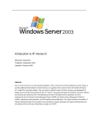 Introduction to IP Version 6 Microsoft Corporation Published: September 2003 Updated: February 2006 Abstract Due to recent concerns over the impending depletion of the current pool of Internet addresses and the desire to provide additional functionality for modern devices, an upgrade of the current version of the Internet Protocol (IP), called IPv4, has been defined. This new version, called IP version 6 (IPv6), resolves unanticipated IPv4 design issues and takes the Internet into the 21st Century. This paper describes the problems of the IPv4 Internet and how they are solved by IPv6, IPv6 addressing, the new IPv6 header and its extensions, the IPv6 replacements for the Internet Control Message Protocol (ICMP) and Internet Group Management Protocol (IGMP), neighboring node interaction, and IPv6 address autoconfiguration. This paper provides a foundation of Internet standards-based IPv6 concepts and is intended for network engineers and support professionals who are already familiar with basic networking concepts and TCP/IP. Microsoft® Windows Server™ 2003 White Paper The information contained in this document represents the current view of Microsoft Corporation on the issues discussed as of the date of publication. Because Microsoft must respond to changing market conditions, it should not be interpreted to be a commitment on the part of Microsoft, and Microsoft cannot guarantee the accuracy of any information presented after the date of publication. This document is for informational purposes only. MICROSOFT MAKES NO WARRANTIES, EXPRESS OR IMPLIED, AS TO THE INFORMATION IN THIS DOCUMENT. Complying with all applicable copyright laws is the responsibility of the user. Without limiting the rights under copyright, no part of this document may be reproduced, stored in or introduced into a retrieval system, or transmitted in any form or by any means (electronic, mechanical, photocopying, recording, or otherwise), or for any purpose, without the express written permission of Microsoft Corporation. Microsoft may have patents, patent applications, trademarks, copyrights, or other intellectual property rights covering subject matter in this document. Except as expressly provided in any written license agreement from Microsoft, the furnishing of this document does not give you any license to these patents, trademarks, copyrights, or other intellectual property. © 2003 Microsoft Corporation. All rights reserved. Microsoft, MSN, Vista, Windows, Windows NT, Windows Server, and the Windows logo are either registered trademarks or trademarks of Microsoft Corporation in the United States and/or other countries. The names of actual companies and products mentioned herein may be the trademarks of their respective owners. Microsoft® Windows Server™ 2003 White Paper Contents Introduction .................................................................................................................................... 1 IPv6 Features ............................................................................................................................... 2 New Header Format ................................................................................................................. 2 Large Address Space ............................................................................................................... 2 Efficient and Hierarchical Addressing and Routing Infrastructure ........................................... 2 Stateless and Stateful Address Configuration.......................................................................... 2 Built-in Security ........................................................................................................................ 3 Better Support for QoS ............................................................................................................. 3 New Protocol for Neighboring Node Interaction ....................................................................... 3 Extensibility............................................................................................................................... 3 Differences Between IPv4 and IPv6 ............................................................................................ 3 IPv6 Packets over LAN Media ..................................................................................................... 4 Ethernet II Encapsulation ......................................................................................................... 5 IEEE 802.3, IEEE 802.5, and FDDI Encapsulation .................................................................. 5 IPv6 Implementations from Microsoft........................................................................................... 5 The IPv6 Protocol for the Windows Server 2003 Family, Windows XP with SP1, Windows XP witrh SP2, and Windows CE .NET ........................................................................................... 6 The Next Generation TCP/IP Stack in Windows Vista and Windows Server "Longhorn" ....... 6 Non-production IPv6 Implementations from Microsoft ................................................................. 6 The IPv6 Protocol for Windows XP with no Service Packs Installed ....................................... 7 Microsoft IPv6 Technology Preview for Windows 2000 ........................................................... 7 Microsoft Research IPv6 Implementation ................................................................................ 7 IPv6 Addressing............................................................................................................................. 8 The IPv6 Address Space ............................................................................................................. 8 IPv6 Address Syntax .................................................................................................................... 8 Compressing Zeros ...................