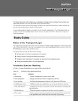 OSI Transport Layer The Study Guide portion of this chapter uses a combination of multiple-choice, matching, fill-in-the-blank, and open-ended questions to test your knowledge of the OSI transport layer. The Labs and Activities portion of this chapter includes all the online curriculum labs to further reinforce that you have mastered the practical, hands-on skills needed. As you work through this chapter, use Chapter 4 in the Network Fundamentals CCNA Exploration online curriculum or use the corresponding Chapter 4 in the Network Fundamentals CCNA 1 Exploration Companion Guide for assistance. Study Guide Roles of the Transport Layer The transport layer provides vital control over the network: It enables multiple applications to work at the same time over the same network. That way, one computer can use instant messaging, surf the web, use a Voice over IP (VoIP) phone, stream video, and check e-mail. The transport layer provides for data network needs by Dividing data received from an application into segments Adding a header to identify and manage each segment Using the header information to reassemble the segments back into application data Passing the assembled data to the correct application Vocabulary Exercise: Matching In Table 4-1, match the definitions on the right with the terms on the left. Table 4-1 Transport Layer Matching Exercise Term Definition a. Multiplexing __. Ensures the application is ready to receive data. b. Data segmentation __. Manages data delivery if there is congestion on the host. c. Error checking __. Facilitates data preparation for delivery by the lowest four OSI layers. d. Establishing a session __. Multiple network-aware applications can use the network at the same time. e. Same order delivery __. Performed on the data in the segment to check if the segment was changed during transmission. f. Reliable delivery __. Means lost segments are present so the data is received complete. g. Flow control __. Ensures segment sequencing so that data can be presented by the session layer to the application layer with all data intact and ready for processing. 92 Network Fundamentals: CCNA Exploration Companion Guide Concept Questions 1. How does the transport layer multiplex different applications’ communication? 2. How does the transport layer tell the difference between different data segments? Vocabulary Exercise: Completion Fill in the blanks for the following questions. 1. The pieces of communication in UDP are called d_________. 2. Additional functions specified by TCP are same______________, reliable delivery, and f____________. 3. A TCP segment has 20 bytes of overhead in the header encapsulating the application layer data, whereas each UDP segment only has 8 bytes of overhead. Port Type Ranges Exercise Table 4-2 lists port types. Fill in the port number ranges in the Numbers column. Table 4-2 Port Type Ranges Port Type Numbers Well-known ports 0 to 1023 Registered ports Dynamic or private ports 1024 to 49151 49152 to 65535 The TCP Protocol: Communicating with Reliability The key distinction between TCP and UDP is reliability. This reliability is achieved by having fields in the TCP segment, each with a specific function. A complete TCP conversation requires the establishment of a session between the source and the destination in both directions. As the source receives an acknowledgment from the destination, it knows that the data has been successfully delivered and can quit tracking that data. If the source does not receive an acknowledgment within a predetermined amount of time, it retransmits that data to the destination. Chapt er 4: OSI Trans port Layer 93 Concept Questions 1. When the host is using TCP, why does the transport layer initiate a process to create a connection with the destination? 2. A key feature of TCP is its reliability. Define reliability. Vocabulary Exercise: Matching In Table 4-3, match the definition on the right with a flag on the left. Table 4-3 Flag-Matching Exercise Flags Definition a. ACK __. Urgent pointer field significant b. PSH __. Acknowledgment field significant c. SYN __. Push function d. URG __. Reset the connection e. FIN __. Synchronize sequence numbers f. RST __. No more data from sender Managing TCP Sessions When services send data using TCP, segments may arrive at their destination out of order. For the original message to be understood by the recipient, the data in these segments is reassembled into the original order. Sequence numbers are assigned in the header of each packet to achieve this goal. Segment sequence numbers enable reliability by indicating how to reassemble and reorder received segments. Internet Research Exercise Using your favorite search engine, enter the keywords “TCP segment reassembly,” and find a website that explains it. Using this site, be prepared to share your findings with the class. Note to instructor: Answers will vary, but encourage students to find a website, provide the URL, and be prepared to explain or present the information found. This exercise works best if the students are required to present their website to the class or to teach each other in small groups. 94 Network Fundamentals: CCNA Exploration Companion Guide Concept Questions 1. What is expectational acknowledgment? 2. In what case would it be possible for the destination to acknowledge bytes in discontiguous segments and request that the host retransmit only the missing data? 3. What is flow control, and what does it do? The UDP Protocol: Communicating with Low Overhead User Datagram Protocol (UDP) is a simple protocol that provides the basic transport layer functions. It has much lower overhead than TCP because it is not connection oriented and does not provide the sophisticated retransmission, sequencing, and flow-control mechanisms. Some applications, such as online games and VoIP, can tolerate some loss of data. If these applications use TCP, they might experience large delays while TCP detects data loss and re