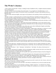 The Writer’s Journey -I came to believe that the Hero’s Journey is nothing less than a handbook for life, a complete instruction manual in the art of being human -the Hero’s Journey is not an invention, but an observation. It is a recognition of a beautiful design, a set of principles that govern the conduct of life and the world of storytelling the way physics and chemistry govern the physical world -from this model, infinite and highly varied copies can be produced, each resonating with the essential spirit of the form -the Hero’s Journey is a pattern that seems to extend in many dimensions, describing more than one reality. It accurately describes, among other things, the process of making a journey, the necessary working parts of a story, the joys and despairs of being a writer, and the passage of a soul through life -Joseph Campbell’s great accomplishment was to articulate clearly something that had been there all along - the life principles embedded in the structure of stories -the self-conscious, heavy-handed use of this model can be boring and predictable. But if writers absorb its ideas and re-create them with fresh insights and surprising combinations, they can make amazing new forms and original designs from the ancient, immutable parts -at the core of every artist is a sacred place where all the rules are set aside or deliberately forgotten, and nothing matters but the instinctive choices of the heart and soul of the artist -a certain amount of form is necessary to reach a wide audience. People expect it and enjoy it, so long as it’s varied by some innovative combination or arrangement and doesn’t fall into a completely predictable formula -taking this metaphorical system too literally, or arbitrarily imposing its forms on every story can be stultifying. It should be used as a form, not a formula, a reference point and a source of inspiration, not a dictatorial mandate -the Hero’s Journey has been criticized as an embodiment of a male-dominated warrior culture -the warrior is only one of the faces of the hero, who can also be pacifist, mother, pilgrim, fool, wanderer, hermit, inventor, nurse, savior, artist, lunatic, lover, clown, king, victim, slave, worker, rebel, adventurer, tragic failure, coward, saint, monster, etc. The many creative possibilities of the form far outweigh its potential for abuse -the thousands of variations on the paradigm, worked out over the centuries, offer endless branches from which infinite webs of story can be built -the Shadow archetype operates within the individual as a repository for unexpressed feelings and desires. It is a force that accumulates when you fail to honor your gifts, follow the call of your muses, or live up to your principles and ideals -it has great but subtle power, operating on deep levels to communicate with you, perhaps sabotaging your efforts, upsetting your balance until you realize the message these events bring - that you must express your creativity, your true nature, or die -in this system: Plot Point I = The 1st Threshold. The Mid-Point = The Ordeal. The climax of the Second Act = The Road Back -each act is like a movement of a symphony, with its own beginning, middle, and end, and with its own climax (the highest point of tension) coming just before the ending of the act -each act sends the hero on a certain track with a specific aim or goal, and that the climaxes of each act change the hero’s direction, assigning a new goal -straightening out the curves of the circle created sharp, 90 degree turns at the quarter points and revealed drastic changes that may occur in the hero’s objective. Each straight line represents the hero’s aim in that act -the journey to understand and articulate these ideas is truly endless. Although certain human conditions will never change, new situations are always arising, and the Hero’s Journey will adapt to reflect them Preparing for the Journey -all stories consist of a few common structural elements found universally in myths, fairy tales, dreams, and movies. They are know collectively as the Hero’s Journey -used wisely, these ancient tools of the storyteller’s craft still have tremendous power to heal our people and make the world a better place -good stories make you feel you’ve been through a satisfying, complete experience. You finish the story feeling you’ve learned something about life or about yourself. Perhaps you’ve picked up a new awareness, a new character trait or attitude to model your life on -Campbell has broken the secret code of the story -the guardians seem to pop up at the various thresholds of the journey, the narrow and dangerous passages from one stage of life to the next -instead of attacking these seemingly hostile powers head-on, journeyers learn to outwit them or join forces with them, absorbing their energy rather than being destroyed by it -challenge these ideas, test them in practice, adapt them to your needs, and make them yours. Use these concepts to challenge and inspire your own stories A Practical Guide -Joseph Campbell’s contribution to the tool kit was to gather the ideas together, recognize them, articulate them, name them, organize them. He exposed for the first time the pattern that lies behind every story ever told -the most persistent theme is the myth of the hero. Campbell discovered that they are all basically the same story, retold endlessly in infinite variations -the pattern of the Hero’s Journey is universal, occurring in every culture in every time -the archetypes: constantly repeating characters or energies which occur in the dreams of all people and the myths of all cultures. Jung suggested that these archetypes reflect different aspects of the human mind - that our personalities divide themselves into these characters to play out the drama of our lives -he suggested that both were coming from a deeper source, in the collective unconscious of the human race -the repeating characters of world myth