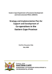 Eastern Cape Department of Economic Development and Environmental Affairs (DEDEA) Strategy and Implementation Plan for Support and Development of Co-operatives in the Eastern Cape Province Draft for Discussion Only May 2008 Province of the EASTERN CAPE 1|P a g e DEPARTMENT OF ECONOMIC DEVELOPMENT & ENVIRONMENTAL AFFAIRS Draft Strategy and Programme for Cooperative Development and Support Table of Contents Foreword by the MEC for Economic Development and Environmental Affairs, Mr Phumulo Masaulle. ........................................................................................................ 4 EXECUTIVE SUMMARY ................................................................................................... 5 1 INTRODUCTION AND BACKGROUND ..................................................................... 8 1.1 Introduction and Rationale ............................................................................. 8 1.2 Methodology and Approach to developing the Strategy ............................... 9 2 CO-OPERATIVE PROGRAMMES FOCUS ................................................................ 11 2.1 Vision for supporting co-operatives development in the Eastern Cape ....... 11 2.2 Objectives for supporting co-operatives in the Eastern Cape ...................... 11 2.3 Which forms of Co-operatives will be supported by the Strategy................ 11 2.4 Which Kinds of Co-operatives will be targeted Error! Bookmark not defined. 3 SOCIO-ECONOMIC AND POLICY CONTEXT OF THE EASTERN CAPE ..................... 13 3.1 Socio-Economic Profile of the Eastern Cape ................................................. 13 3.2 Provincial Policy Priorities ............................................................................. 15 3.2.1 Provincial Growth and Development Plan ............................................. 15 3.2.2 Jobs Summit and District Growth and Development Summits ............. 15 3.3 Industrial Strategy and Priority Economic Sectors ........................................ 16 4 SITUATIONAL ANALYSIS OF COOPERATIVES IN THE EASTERN CAPE .................. 18 4.1 Cooperatives in the Eastern Cape ................................................................. 18 4.2 Recommendations ........................................................................................ 19 5 CO-OPERATIVES IN CONTEXT ............................................................................... 20 5.1 General Definition of a Co-operative ............................................................ 20 5.2 Principles of Co-operatives ........................................................................... 20 5.3 Values of Co-operatives ................................................................................ 21 5.4 Advantages and Disadvantages of Co-operatives ......................................... 21 Table 4: Advantages and Disadvantages of Co-operatives ...................................... 21 5.5 Differences between co-operatives and other legal entities ....................... 22 Table 5: Differences between co-operatives and other legal entities .................... 22 5.6 Types of Co-operatives as per the Co-operatives Act No.14 of 2005 ........... 23 6 LEGISLATIVE FRAMEWORK OF CO-OPERATIVES IN SOUTH AFRICA .................... 24 6.1 Co-operatives Act No.91 of 1981 .................................................................. 24 6.2 Co-operatives Policy of 2004......................................................................... 24 6.3 Co-operatives Act No.14 of 2005 .................................................................. 25 6.4 Co-operatives Regulations 2007 ................................................................... 25 6.5 Co-operatives Banks Act, No.40 of 2007 ....................................................... 25 6.6 Registration of Co-operatives ....................................................................... 26 7 PILLARS OF THE STRATEGY................................................................................... 27 This strategy and programmes is made up of four pillars. The pillars are illustrated in Figure 1 below:........................................................ Error! Bookmark not defined. 7.1 Pillar 1: Institutional Capacity for supporting Cooperatives in the Eastern Cape 27 7.1.1 Establish a Directorate: Co-operatives Support Unit............................. 27 7.1.2 Consolidation of the Registration Process in the Province ................... 28 7.1.3 Establish a Provincial Institute for Co-operatives Economic Development........................................................................................................ 29 7.1.4 Establish a Provincial Co-operatives Advisory Board............................. 30 2|P a g e Draft Strategy and Programme for Cooperative Development and Support 7.1.5 7.1.6 Establish an Inter-Departmental Co-ordination Committee ................. 30 Establish Co-operatives Development Centres in District Municipalities 31 7.2 Pillar 2: Support Infrastructure for Co-operatives Development ................. 32 7.2.1 Alignment of District Municipalities Co-operatives Implementation Plans 32 7.2.2 Develop Co-operatives Funds and Financing Mechanisms ................... 32 7.2.3 Co-operatives Training and Capacity Building ....................................... 33 7.2.4 Co-operatives Enterprise Development, Support and Mentorship ...... 34 7.2.5 Procurement Opportunities for Co-operatives ..................................... 34 7.2.6 Youth and Women Participation in Co-operatives ................................ 35 7.3 Pillar 3: Building an Independent Co-operative Movement ......................... 35 7.3.1 Worker Co-operatives ............................................................................ 36 7.3.2 Agricultural Co-operatives ..................................................................... 36 7.3.3 Housing Co-operatives ..................................