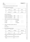 Name ................................................ Homework 1.1 Date due .......................................... 1. Approximately how many chemical elements are there? ............................................ 1 2. The grid below shows some elements. A D Lithium Mercury B E Oxygen Hydrogen C F Carbon Bromine Which two elements are: 3. 4. a) solids at room temperature. Boxes ............... and .............................. 1 b) liquids at room temperature Boxes ............... and .............................. 1 c) gases at room temperature. Boxes ............... and .............................. 1 What is the symbol for each of the following elements? a) calcium .................. b) potassium .................. c) silicon .................. d) argon. .................. e) sulphur .................. f) magnesium .................. 3 Which of the elements in question 3 above are a) metals? ............................................................................................................................. b) non-metals? ....................................................................................................................... 5. 3 The grid below shows some elements. A D Copper Silver B E Plutonium Gold C F Americium Curium a) Which three elements have been known for a very long time? Boxes .................. ......................... and ............................... b) Which three elements have been made by scientists? Boxes .................. ......................... and ............................... 2 Homework 1.1 6. What name is given to a substance which is formed when two or more different elements are joined together? ................................................................................................................................................ 1 7. Name the elements which were named after a) Marie Curie ................................................ b) Dimitri Mendeleev ................................................ 2 8. The grid shows some hazard symbols A B C D X Which box shows the symbol for a) a harmful substance? Box .................................. b) a radioactive substance? Box .................................. c) a corrosive substance? Box .................................. 3 9. Use the date of discovery table in the data booklet to answer the following. a) When was hydrogen discovered? date ................................. b) Which two elements were discovered in 1774? ............................. and ............................ 1 1 Name ................................................ Homework 1.2 Date due .......................................... 1. The air is a mixture of gases. Give the approximate percentage of each of the gases shown below in the air. Oxygen ................................ % of the air. Nitrogen .............................. % of the air. 2 2. The results of some chemical tests carried out on three gases, A, B and Cs, are shown in the table below. Effect of gas on Gas Glowing splint Limewater A splint goes out turns chalky B splint goes out no effect C splint relights no effect Which gas (A, B or C) is a) Oxygen Gas ........................... 1 b) Carbon dioxide Gas ........................... 1 3. Use you data book to complete the table below which gives some information about different metal elements. Metal Date of discovery Melting point (oC) Density (units) Aluminium Use 2.70 prehistoric water pipes 3 4. The grid shows the names of some commonly uses gases. A nitrogen B chlorine C oxygen D argon Which box shows the name of the gas used for a) filling lights bulbs. b) killing bacteria. 2 Homework 1.2 6. Use the tables of melting and boiling points on page 4 of the data book to answer the following a) At what temperature will lithium iodide become a liquid? .............................oC 1 b) What state (solid, liquid or gas) will phenol be in at a temperature of 100oC? .............................. 1 c) Which two molecular compounds will be gases at room temperature? ................................................... and ........................................................ 1 7. Use the table of solubilities on page 4 of the data booklet to give the solubility of the compounds below. a) iron nitrate ............................................................ b) calcium sulphate ............................................................ c) magnesium phosphate ............................................................ 3 8. The table below gives the melting points of four different elements. Use this information to construct a bar chart. Element Iodine Lithium lead Tin Melting point (oC) 114 181 328 232 melting point (oC) 3 Homework 1.2 9. Part of a pupil’s PPA write up is shown below. What was the aim of the experiment? To find out how the temperature of water affects the dissolving speed of sugar in water. Procedure :- a) What factor would the pupil have changed in her investigation? ........................................ ............................................................................................................................................................... 1 b) When this investigation is carried out what would be measured that told you how quickly the sugar crystals dissolved in water? ............................................................................................................................................................... ............................................................................................................................................................... 1 Name ................................................ Homework 1.3 Date due .......................................... 1. Which of the following statements is true (You should make use of the table of solubilities on page 4 of the data booklet). A B C D All sulphates are very soluble in water Copper sulphate is less soluble than calcium sulphat