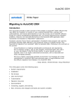 AutoCAD 2004 White Paper Migrating to AutoCAD 2004 Introduction This document provides a brief overview of the changes in AutoCAD ® 2004 software that may affect the migration or transfer of your existing AutoCAD files, routines, and customizations, and license administration of your day-to-day use of AutoCAD software. Except for routine considerations addressed here, you should experience few migration problems. However, the new DWG file format in the AutoCAD 2004 application does necessitate recompilation of ObjectARX® applications. Autodesk customer Rusty Gesner participated in Autodesk’s beta program and used the prerelease AutoCAD 2004 software in full production mode on multiple licenses. This required full migration from AutoCAD® 2002 to AutoCAD 2004. Following is his comment on the process: Group Mackenzie is a leading multidiscipline architectural and engineering firm in Portland, Oregon, and an early adopter of AutoCAD 2004. We used it on over 36 projects in the first three months. It was a smooth and easy upgrade, even in our highly customized environment, with no downside and many immediate benefits. We have a highly customized AutoCAD environment, but migrating all of that customization to AutoCAD 2004 was extremely easy—a huge difference from the difficult migration from Release 14 to AutoCAD 2000. Rusty Gesner, IT/CAD Director, Group Mackenzie This white paper covers the following topics: System requirements Installation File formats User environment Customization Migration resources Documentation Consulting, support, and training New, removed, and changed commands and system variables www.autodesk.com/autocad 1 Migrating to AutoCAD 2004 System Requirements The minimum system requirements for AutoCAD 2004 are as follows: Hardware/ Software Operating system Requirement Microsoft® Windows® XP Professional, Home, or Tablet PC Edition; Windows 2000; or Windows NT® 4.0 (SP6a or later) Notes It is recommended that you install and run AutoCAD 2004 on an operating system of the same language as your version of the AutoCAD product, or on an English version of the operating system. You must have administrator permissions to install AutoCAD 2004 software. Microsoft® Windows® 95, 98 and ME are not supported. Web browser Microsoft® Internet Explorer 6.0 Processor Intel® Pentium® III or later, with 500 MHz or faster processor, or compatible PC 800 MHz processor recommended. RAM 256 MB RAM recommended 512 MB recommended for Windows 2000 and Windows XP operating systems. Video 1024x768 VGA with true color (minimum) 1280x1024 VGA and true color support recommended. Product requires a Windows-supported display adapter. Hard disk 300 MB free disk space for installation Pointing device Mouse, trackball, or other device CD-ROM drive Any speed (for installation only) Optional hardware OpenGL-compatible 3D video card Printer or plotter Digitizer Modem or access to an Internet connection Network interface card The OpenGL driver that comes with the 3D graphics card must have the following: Full support for OpenGL An OpenGL installable client driver (ICD) The graphics card must have an ICD in its OpenGL driver software. The “miniGL” driver provided with some cards is not sufficient for use with AutoCAD software. Installation To help ease your transition to the AutoCAD 2004 application, you can now install AutoCAD 2004 side by side with earlier releases of AutoCAD software. For example, if you have AutoCAD 2002 installed on your machine, you can install AutoCAD 2004 without uninstalling or affecting your AutoCAD 2002 software, provided you do not install both versions in the same directory. If you have purchased an upgrade version of AutoCAD 2004, you must uninstall the previous version of AutoCAD software within 60 days of installing AutoCAD 2004. Refer to your license agreement for more information. www.autodesk.com/autocad 2 Migrating to AutoCAD 2004 File Formats Implementation of new features and performance enhancements in the AutoCAD 2004 release required changes to the application file formats. This section provides an overview of those changes DWG AutoCAD 2004 can still read DWG files back to the AutoCAD 2.6 release and can save DWG files back to AutoCAD 2000. As a result of the DWG file format change, other DWGdependent files, such as the drawing standards file (DWS) and the DXF™ formats, have also changed. The new AutoCAD 2004 DWG file format has been optimized and now provides files that are more than 50 percent smaller.1 This improves file open performance over a network because of a reduction in network file traffic. The DWG file format change allowed for new features in AutoCAD 2004, including true colors, gradients, and drawing password protection. To take advantage of these features, drawings must be saved in the AutoCAD 2004 format. DWF The new DWF™ 6 (Design Web Format™) file format, introduced in the AutoCAD 2002 Design Publishing Extension, supports multisheet DWF files, so you can include all drawings from a drawing set in one DWF file. Multipage files can be easily viewed and printed in order, even by team members who don’t have AutoCAD software, using Autodesk’s free DWF viewer, Autodesk® Express Viewer. Autodesk Express Viewer supports viewing for all DWF file formats, including DWF 6. If you need to create older DWF format files in AutoCAD 2004, you can do so by adding the older DWF format in the Add a Plotter wizard. Plotter Configuration Files (PC3) All your existing files are converted automatically when saved in the AutoCAD 2004 application. AutoCAD 2004 can open and use your existing plotter configuration (PC3) files; however, if the files are not converted, you may not be able to use some of the new and enhanced features. The following table indicates, by product version, the compatibility of plot support files. AutoCAD 2000 files Plot style tables (CTB and STB) AutoCAD 2000i files Compatible with all versions Plotter configuration files (