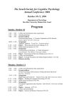 The Israeli Society for Cognitive Psychology Annual Conference 2004 October 10-11, 2004 Department of Psychology Bar-Ilan University, Ramat-Gan, Israel Program Sunday, October 10 8:30 - 8:45 - Coffee and refreshments (late registration) 8:45 - 9:00 - Opening greetings 9:00 - 9:45 - Keynote address Deconstructing Stroop: A Tectonic Explanation of His Results – Danny Algom, Tel-Aviv University 10:00 - 11:20 - Symposium Applied Cognition – Vered Erev, Technion (chair) 11:30 - 12:45 - Papers - Reasoning and Decision Making (#1-5) 12:45 - 13:25 - Buffet lunch and posters (#1-24) 13:25 - 14:45 - Symposium Consciousness in the Brain - A Viable Enterprise? Leon Deouell, The Hebrew University (chair) 14:55 - 16:25 - Papers - Reasoning and Decision Making (cont.) (#6-11) 16:25 - 16:40 - Coffee and refreshments 16:40 - 18:55 - Papers - Concept Perception and Mental Representation (#12-20) 18:55 - 19:30 - Business meeting Monday, October 11 8:30 - 8:50 - Coffee and refreshments (late registration) 8:50 - 9:35 - Keynote address On the Psychology and Economics of Big and Small Decisions – Ido Erev, Technion 9:45 - 11:05 - Symposium Right Brain and Creativity – Miriam Faust, Bar-Ilan University (chair) 11:15 - 12:45 - Papers - Reading & Language Processing (#21-26) 12:45 - 13:25 - Buffet lunch and posters (#25-46) 13:25 - 14:45 - Symposium Perceptual Organization and Attention - Ruth Kimchi, University of Haifa (chair) 14:50 - 16:35 - Papers – Attention (#27-33) 16:35 - 16:50 - Coffee and refreshments 16:50 - 19:05 - Papers – Sensory & Memory Processes (#34-42) Sunday, October 10 Symposium: Applied Cognition Vered Erev, Technion (chair) 10:00 – 11:20 The adventure of CogniFit - Shlomo Breznitz, University of Haifa Personalized attentional training program: Effective direct intervention for children with ADHD – Lilach Shalev, The Open University, Yehoshua Tsal, Tel-Aviv University, & Carmel Mevorach, University of Birmingham, UK Utilizing the results of studies on visual attention search to improve the perceptibility of cluttered tactical displays - Joel Norman, University of Haifa Cognitive principles in the analysis of performance difficulties in the hospital work environment – Danny Gopher, Technion Reasoning & Decision Making (#1-5) 11:30 - 12:45 11:30 - 11:45 The effect of attractive but unavailable alternatives on the value of near and distant future menus – Leah Borovoi & Nira Liberman, Tel-Aviv University (1) 11:45 - 12:00 Imagery and affect in risk assessment - Tammy Rubel & Maya Bar-Hillel, The Hebrew University (2) 12:00 - 12:15 Perceived diversity heuristic: The effect of pseudo-diversity on pool judgments under uncertainty - Shahar Ayal & Dan Zakay, Tel-Aviv University (3) 12:15 - 12:30 Do people think about absolute or relative differences? Some experimental evidence - Ofer Azar, Ben-Gurion University (4) 12:30 - 12:45 Do we perchance see the difference? Perceptual biases in randomness judgments - Dror Lev & David Leiser, Ben-Gurion University (5) Symposium: Consciousness in the Brain - A Viable Enterprise? Leon Deouell, The Hebrew University (chair) 13:25 – 14:45 Consciousness - psychological view - Benny Shannon, The Hebrew University Spatial de-coherence: A new correlate of human visual awareness – Rafael Malach, The Weizmann Institute Ongoing activity and state of mind - Amos Arieli, The Weizmann Institute Prerequisites for conscious awareness - Merav Ahissar, The Hebrew University Reasoning & Decision Making (#6-11) 14:55 – 16:25 14:55 – 15:10 Do rational people care more about the future? The moderating effects of rationality on temporal discounting - Vered Rafaely & Joachim Meyer, Ben-Gurion University (6) 15:10 – 15:25 Does trying lead to buying?: The effects of sampling on choice behavior – Eyal Ert, Ornit Raz, & Ido Erev, Technion (7) 15:25 – 15:40 Temporal changes in decisions involving conflicts between values - Tal Eyal & Nira Liberman, Tel-Aviv University (8) 15:40 – 15:55 Workload distribution in the modern ‘Glass Cockpit’ - Allon Kahana, Danny Gopher, Arthur Grunwald, Peretz Lavie, & Cristina Iani, Technion (9) 15:55 – 16:10 Analysis of a drug administration process from a cognitive point of view – Yael Einav,Technion, Efrat Kedmi, Technion, Zvi Shtraucher, Technion, & Yael Appelbaum, Israel Ministry of Health (10). 16:10 – 16:25 Conditionals, semantic illusions, and hypothetical thinking - Shira Elqayam, Simon Handley, Jonathan Evans, University of Plymouth (11) Concept Perception & Mental Representation (#12-20) 16:40 – 18:55 16:40 – 16:55 Colors affect numerical processing in synesthesia - Avishai Henik & Roi Cohen-Kadosh, BenGurion University (12) 16:55 – 17:10 A comparative analysis of time reproduction: Retrospective vs. prospective, and remote vs. immediate - Joseph Glicksohn, Rotem Leshem, & Rotem Aharoni, Bar-Ilan University (13) 17:10 – 17:25 How do we understand fractions? - Joseph Tzelgov & Arava Kallai, Ben-Gurion University (14) 17:25 – 17:40 Parity and magnitude in numerical perception: An alternative account of the SNARC effect - Daniel Fitousi & Daniel Algom, Tel-Aviv University (15) 17:40 – 17:55 Modularity of Theory of Mind deficit in schizophrenia - Udi Bonshtein & David leiser, BenGurion University (16) 17:55 – 18:10 Human foraging behavior in the lab - Yaakov Kareev & Ro'i Zultan, The Hebrew Universtiy (17) 18:10 – 18:25 Extending extremity theory to integrative complexity as a predictor of decision extremity in a personnel selection context - Talya Miron-Shatz, The Hebrew University (18) 18:25 – 18:40 On the mental representation of negative numbers: Do they have psychological reality? Samuel Shaki & William M. Petrusic, Carleton University (19) 18:40 – 18:55 On the neural basis of subjective significance – Einat Ofek & Hillel Pratt, Technion (20) Posters Reading & Language Processes Modularity within the language domain: A view from developmental impairments - Rama Novogrodsky & Na