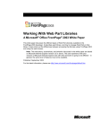 Working With Web Part Libraries A Microsoft® Office FrontPage® 2003 White Paper This white paper discusses the different types of Web Part Libraries available to the FrontPage 2003 developer. It describes each library, and how to manage Web Parts in that library. It also points out the differences between accessing the libraries using FrontPage 2003 and using the web browser. Note: The instructions, screenshots, and behavior discussed in this white paper are based on Microsoft Internet Explorer version 5.5 or above. The user experience with prior versions of Microsoft Internet Explorer and with other browsers is going to be different – in general, the same level of features may not be available. Published: September 2003 For the latest information, please see http://www.microsoft.com/frontpage/default.htm Contents Introduction .................................................................................................................................1 Virtual Server Library ..................................................................................................................2 Deploying a Virtual Server Library .........................................................................................2 Site Library ..................................................................................................................................3 Navigating the Site Library .....................................................................................................3 Adding a Web Part to the Site Library Using FrontPage 2003 ..............................................4 Managing Site Library with SharePoint Central Admin ..........................................................5 Adding a Deployed Web Part in the Site Library ..............................................................5 Adding a New Web Part to the Site Library ......................................................................5 Removing a Web Part from the Site Library .....................................................................5 Online Library ..............................................................................................................................7 Creating a Library of Parts for a Page ........................................................................................8 Importing a Web Part ................................................................................................................11 Conclusion ................................................................................................................................12 References ................................................................................................................................13 Other Microsoft Resources ..................................................................................................13 Introduction A Web Part library is a central warehouse of Web Parts that you can use to locate a specific Web Part when you are creating a Web Part Page. You can access Web Part libraries at your site by clicking either Browse or Search from the Add Web Parts menu of the Web Parts task pane in FrontPage 2003: Web Parts Task Pane Once you locate the Web Part you want, you typically drag it to your Web Part Page. Depending on how your site administrator has configured your site, there can be up to three different Web Part libraries available: 1. Site Library: Web Parts available to a top level Windows SharePoint Services Web site. 2. Virtual Server Library: This library contains Web Parts available to all sites and subsites within a virtual server. 3. Online Library: By default, the Online Library contains an additional set of Web Parts available from Microsoft. However, a site administrator can redirect the online library to a different site. We will discuss each of these libraries in detail in the following sections. Note: Windows SharePoint Services has the notion of another library called the Page Library; however, FrontPage 2003 does not directly expose this library to users. We will discuss this in more detail at the end of this document. Working With Web Part Libraries 1 Virtual Server Library Large enterprises with many sites may decide to conveniently install the same set of Web Parts on many sites. In this case, consider storing these Web Parts in a Virtual Server Web Part Library. You can deploy Web Parts in a Virtual Server Web Part Library by developing a Web Part Package file (.cab). For more information on developing Web Part Package files, see the Windows SharePoint Services Software Development Kit. Deploying a Virtual Server Library Once you have a Web Part Package file, to deploy it, follow these steps: 1. Logon at the Windows SharePoint Services server with an account that has administrative rights. 2. Open a command prompt and change directory to local_drive:\Program Files\Common Files\Microsoft Shared\Web Server Extensions\60\bin. 3. Run the following command: stsadm.exe –o addwppack –filename path_to_web_part_package_file This installs the Web Parts contained in the .CAB file into the virtual server library. Note: If there are multiple virtual servers on the same machine, then install the Web Part Package on all of them using the –globalinstall switch in the given command. For more information, see the article “Packaging and Deploying Web Parts for Microsoft Windows SharePoint Services” which is available online at http://msdn.microsoft.com/library/enus/dnspts/html/sharepoint_deployingwebparts.asp . Working With Web Part Libraries 2 Site Library These are Web Parts available to a given top level site and subsites within it. The name of this library is usually the same as the name of the top level site (such as “Team Web site Library” where “Team Web” is the name of the top level Web site). The Site Web Part Library is often the most central Web Part library for your work group. The Web Parts in this library come fr