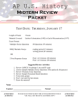 AP U.S. History Midterm Review Packet TEST DATE: THURSDAY, JANUARY 17 Length of Exam: 2 hours Material Covered: Earliest Colonization (1492) to End of Reconstruction (1877) Exam Format: Multiple Choice Questions 80 Questions (55 minutes) DBQ Thematic Essays reading period (15 minutes) writing period (45 minutes) OR 2 Free Response Essays Pick 1 of 2 choices (30 minutes) Pick 1 of 2 choices (30 minutes) Suggested Review Activities: 1. 2. 3. 4. 5. 6. 7. Review AMSCO Vocabulary Lists and ID cards Answer Sample Multiple Choice Questions (This packet & old quizzes) Review Thematic Essay Questions Review Sample Document Based Questions Form study groups Don’t wait until the last minute Know the material! Name: __________________________________________________________________ Teacher: _______________________________ ATTENTION! ACHTUNG! Period: ______________________ PLEASE SAVE THIS PACKET FOR AP EXAM REVIEW IN MAY. YOU WILL NOT RECEIVE ANOTHER COPY! ATTENTION! ACHTUNG! AP US Midterm Review 1. Early exploration of the Americas during the fifteenth century was originally dominated by which nation? A. Spain D. Italy B. England E. France C. The Netherlands 2. At the time of Spanish exploration in the Americas, the most significant cause of destruction of the native peoples in the New World was the A. assimilation of European cultures that lead to a loss of indigenous identity B. lack of man power to adequately combat the massive Spanish armies C. introduction of contagious diseases like measles and small pox D. fluctuating weather conditions which led to famines and crop shortages E. changing pattern in childbirth 3. 4. 5. Colonialism - Reconstruction All of the following are effects of the Spanish empire’s arrival in the Americas EXCEPT A. the introduction of Christianity to the native cultures B. the devastation of indigenous population caused by diseases brought over from Europe C. European importation of the white potato, tobacco, numerous vegetables, vanilla, and chocolate D. the sharing of European technology which would help the natives to prosper E. formation of a rigid social hierarchy that enslaved natives and those people of mixed blood One way that the earliest French settlements in North America differed from the colonies that England had founded was that A. early French colonies were only temporary, established by cod fishermen around Newfoundland B. the French settlers in North America created plantations and farms C. the first French settlers were primarily interested in trading with Indians D. the French often had skirmishes with the Native Americans over land ownership E. many of the French colonies were created as religious havens Following the initial failures during the early 1600s, prosperity finally came to the English settlers at the Jamestown colony as a result of A. the introduction of tobacco farming B. the establishment of the House of Burgesses to govern the Virginia colony C. assistance received from the Native Americans living in the region D. movement of the colony to a different area in the Virginia region E. the creation of the indentured system 7. In the 1600s, which religious group came to America in pursuit of creating a colony where they could freely practice their form of religion? A. Quakers D. Anglicans B. Separatists E. Huguenots C. Shakers 8. The purpose of the Mayflower Compact was A. the creation a of central religion B. the establishment of a self-government that would abide by the will of the majority C. to determine what the form of the economy would be for the new colony D. to settle any issues of land ownership E. to elect the first leader of the new colony 9. Which two colonies became known for practicing religious toleration? A. Maryland and Rhode Island B. New York and New Jersey C. Virginia and Maryland D. Massachusetts and Connecticut E. Connecticut and Pennsylvania 10. Until it came under English control, the New Netherlands colony practiced the patroon system which was a A. mixed social structure consisting of peoples from all over Europe B. method of farming that employed indentured servants C. form of government that gave all people living in the colony equal rights D. a system of granting large landed estates to those wealthy men who brought at least 50 families to the colony E. a form of religion intruded by Dutch settlers Following the discovery and exploration of North America, England’s initial attempts to colonize were motivated by which of the following? I. The promise of money to be made from trade II. The need to accommodate a growing population III. The desire to spread Christianity around the world A. B. C. D. E. 6. 11. Around 1650 this economic philosophy boasted of a limit to the world’s wealth and inspired England’s policy of trade regulation in the colonies A. Capitalism D. Socialism B. Mercantilism E. Feudalism C. Colonialism I only II only II and III only I and II only I, II and III 2 AP US Midterm Review Colonialism - Reconstruction 12. Although the colony of Georgia eventually became another haven for persecuted Protestants, it was of great importance to the British Empire because A. the arable farmland and warm climate made it an ideal area for agriculture B. the settlers who James Oglethorpe recruited from English debtor prisons were eager to start a new life C. it served as a buffer between the prosperous colony of South Carolina and Spanish Florida D. it was rich in raw materials and natural resources E. of the elaborate laws devised to govern the colony 17. As news of the improved way of life in America spread throughout Europe, which ethnic group formed a significant settlement in the colony of Pennsylvania in the early 1700s? A. Dutch D. Russians B. Scots-Irish E. French C. Germans 18. During the eighteenth century, the Scots-Irish settlers in the colonies played an important role in colonial expansion because A. their rugged lifestyle and dislike for city life led many of them to settle on the frontier