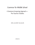 Grammar for Middle School A Sentence-Composing Approach— The Teacher’s Booklet DON and JENNY KILLGALLON HEINEMANN Portsmouth, NH Contents Background Information The purpose and method of the worktext 3 Grammar of the Greats A list of the sources of the model sentences in the worktext 7 Imitation: The Foundation of Sentence Composing The rationale for frequent imitation of professional sentences 13 Creation: The Goal of Sentence Imitation The connection between sentence imitation and sentence creation 14 Suggestions for Sequencing and Assessing the Worktext The scope for one, two, or three grades levels, with tips for grading 15 Tips for Teaching the Sentence-Composing Tools General strategies for success in motivating, instructing, and assessing when teaching any of the fourteen sentence-composing tools 18 References: The Original Sentences Model sentences that are the basis for unscrambling, combining, and expanding practices in the worktext 24 2 Background Information Whenever we read a sentence and like it, we unconsciously store it away in our model-chamber; and it goes with the myriad of its fellows, to the building, brick by brick, of the eventual edifice which we call our style. —Mark Twain Like a building rising brick by brick, writing unfolds one sentence at a time. The quality of sentences largely determines the quality of writing. The goal of this worktext is to provide sentence-composing activities to help students build better sentences. Through imitating model sentences by professional writers and subsequently replicating in their own writing the grammatical structures those sentences contain, students can achieve that goal. Sentence composing, an approach developed over thirty years by co-author Don Killgallon, is a unique, eminently teachable rhetoric of the sentence. Its distinguishing feature is the linking of the three strands of the English curriculum—grammar, writing, and literature—through exclusive use of literary model sentences for students to manipulate and imitate. A research study was conducted (2005 by the co-authors) at the University of Maryland about students’ perceptions of the structural differences between literary sentences and nonliterary sentences. The conclusion of the study is that, although students can easily identify literary sentences, they cannot duplicate the structure of those sentences in their own writing. When students were asked to tell how sentences written by students could become more like those by professional writers, a typical response was this: “Sentences of students could become more like the professional ones if the students looked at the various types of grammatical structures used and tried to duplicate them.” Through the activities in Grammar for Middle School: A Sentence-Composing Approach, teachers will be able to teach students how to build better sentences by learning those “various types of grammatical structures” and how to “duplicate them.” Grammar for Middle School Although based on grammatical structures commonly taught in middle school, the sentence-composing approach differs greatly from traditional teaching of grammar. 3 Background Information The activities in grammar books—naming of sentence parts and parsing of sentences—dissect dead sentences. For all your rhetorician’s rules Teach nothing but to name his tools. —Samuel Butler, Hudibras Grammar for Middle School: A Sentence-Composing Approach does much more than name the tools. It teaches students to use those tools to build better sentences through the application of grammar to writing improvement, using rich sentences from literature as models, often from books taught or read independently during the middle school years. Vast are the differences between sentences from many middle school grammar books and sentences from literature books, a chasm between artificial sentences concocted to illustrate subjects, verb, phrases, clauses (grammar books), and real sentences composed by effective writers to impact readers (literature books)—sentences like the hundreds of varied model sentences in this worktext. (Please see Grammar of the Greats, pages 7–12, for a complete list.) Children learn grammar, including varied sentence structure, by reading good books, picking up literary sentence patterns subconsciously through imitation—the same way they learned to speak. . . . one purpose of writing is the making of texts, very much the way one might make a chair or a cake. One way to learn how to make anything is to have a model, either for duplication or for triggering one’s own ideas. —Miles Myers, former director, National Council of Teachers of English Theory and Practice in the Teaching of Composition A Sentence-Composing Approach The hallmark of the approach is the integration of grammar, writing, and literature through repeated, varied, and systematic practices using only professional sentences as models for imitation. Sentence-composing practices include four sentence manipulation activities: unscrambling, combining, imitating, expanding. 4 Background Information The Four Sentence-Composing Activities: 1. UNSCRAMBLING TO IMITATE—Given a list of scrambled sentence parts of an imitation of a model sentence, students unscramble the list to match the structure of the model. Purpose: to break down the imitation task into manageable steps by isolating the sentence parts of the model. (An example from the worktext is on page 14.) 2. COMBINING TO IMITATE—Given a list of short sentences, students combine those sentences to match the structure of the model. Purpose: to convert sentences into sentence parts equivalent to those in the model and thereby imitate the structure of the model. (An example from the worktext is on page 14.) 3. IMITATING ALONE—After learning how to imitate a sentence, given just a model sentence, students imitate it by using their own content but the structure of the model. Purpose: to practice using stru