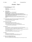 R.L. Hanna EXAM 1 Oceanography Page 1 EXAM 1 Part 1 A. Print the following on your scantron å å å å Your first and last name Today’s date Which section you are in (MW or TTh) CODENAME å å å å å First section: slide show – 30 seconds per slide Second section: the rest of the exam questions B. Exam Format: Closed book exam. No calculators, cell phones, lap tops, palm pilots, etc. You are responsible for preventing other students from cheating off of your exam There is another class in the room after the exam Students who need more time may continue working on the exam in the center area; however å Students who arrive late may not work past the standard ending time for the class. å Warning: go to the restroom before the exam. You may not leave the room once you start the exam. C. For all questions, choose the best answer from the selection provided. å Answers can (and will) repeat – do not worry about that å choose the best answer for each question D. For the on-screen slides å å å å each slide will stay on the screen for 30 seconds the slides will loop and repeat for the rest of the exam period you have thumbnail versions of each of the slides on the attached pages you may use the computers in the adjacent room to view the slides at your own pace - use the arrow keys to control the slideshow E. Your score å there are 100 questions – of these the first three that you miss will not hurt your score å you may apply these 3 “freebies” to questions that you do not “like”, to questions where you smear the answers on your scantron, or to questions that you simply do not know å you do not need to indicate which questions you want thrown out – the first three that you miss will be the ones thrown out for you å your score will be calculated by dividing the number you get correct by 97 å if you get all 100 questions correct, you will earn extra credit F. Grades å will be posted over the next few days å will be posted on the outside bulletin board first and then on my website å will be posted by the codenames that you chose on the first exam G. When you are finished with the exam å turn in your 2 text booklets and your scantron å leave, very very quietly so that you do not disturb students who are still working on the exam R.L. Hanna EXAM 1 Oceanography Page 2 PART 1 Questions 1-12 refer to slides on the front screen. Each slide will be displayed for 30 seconds and the slide show will continuously loop and repeat. Choose from the entire list below for each of the answers. Answers may repeat and not all answers will be used. For answers with multiple letters, bubble-in all letters indicated for that question. For example, if your answer is the Midway Island, then bubble in “a, b, and d” for that question. 1. ______________________ 7. ______________________ 2. ______________________ 8. ______________________ 3. ______________________ 9. ______________________ 4. ______________________ 10. ______________________ 5. ______________________ 11. ______________________ 6. ______________________ 12. ______________________ Aleutian Islands - a Andes - b Antarctica - c Appalachian Mountains - d Arabian Sea - e Azores - ab Bahamas - ac Bay of Fundy - ad Bering Sea - ae Bermuda - bc Borneo - bd British Isles - be Canary Islands - cd Cape Horn - ce Cape of Good Hope - de Caribbean Sea - abc Cascade Range - abd Channel Islands - abe Christmas Island - acd Coral Sea - ace Crete - ade Cyprus - bcd Easter Island - bce Emperor Seamount Chain - bde Falkland Islands - cde Farallon Islands - abcd Fiji - abce Florida Keys - acde Galapagos Islands - abcde Greenland - b Gulf of California - c Gulf of Mexico - d Hawaiian Island Chain - e Himalayas - ab Iceland - ac Jamaica - ad Japan - ae Java and Sumatra - bc Kuril Islands - bd Line Islands - be Madagascar - cd Maldives - ce Marianas Islands - de Mediterranean Sea - abc Midway Island - abd Monterey Bay - abe Montserrat - acd New Zealand - ace North Sea - bcd Outer Banks, US - bce Padre Island - cde Palau - abcd Papua New Guinea - abce Philippine Islands - bcde Red Sea - abcde San Andreas Fault - a San Francisco Bay - b Sandwich Islands - c Sargasso Sea - d Sea of Cortez - c Shark's Bay - e Sicily - ab Solomon Islands - ac Sri Lanka - ad Tahiti - ae Taiwan - bc Tasmania - bd Tonga - be Ural Mountains - cd R.L. Hanna EXAM 1 Oceanography Page 3 For questions 13-19, refer to the pictures displayed on the front screen. Each picture will stay on the screen for 30 seconds. Choose the best answer from the ENTIRE list of answers below. Answers will REPEAT. Don't worry about it. If there is more that one VERY GOOD answer for a question, then all VERY GOOD answers will have the same letter. For example, if Question 16 were the San Andreas Fault, the answer would be "e" -- also appropriate would be "transform margin" whose answer is also "e". a. e. b. d. c. a. a. e. b. a. b. b. a. Divergent Transform margin ocean-to-ocean and/or ocean-to-continent continent-to-continent collision Hot spot islands Iceland Mid-oceanic ridge San Andreas Fault A sea that is getting smaller A sea that is getting wider Subduction Trenches an active volcanic mountain ridge 13. ________________________ 14. ________________________ 15. ________________________ 16. ________________________ 17. ________________________ 18. ________________________ 19. ________________________ R.L. Hanna EXAM 1 Oceanography Page 4 MARINE LIFE ID For EACH photo, pick the best answer from ENTIRE list of choices provided - be as specific as possible. Answers and/or letters may repeat. Example: if Photo #27 was an oyster, then you would bubble in ‘a, b and c’ on your scantron for #27. 20. ____________________ 21. ____________________ 22. ____________________ 23. ____________________ 24. ____________________ 25. ____________________ 26. ____________________ 27. ____________________ 28. ____________________ 29. ____________________ 30. ____________________ abalone - a barnacle- b bryzoan
