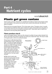Part 4 Nutrient cycles worksheet 4.1 Plants get green suntans Food contains nutrients. Nutrients are needed by the bodies of plants and animals to keep alive and healthy. In this section you will see how nutrients flow between the different parts of a system. Plants have one very special feature. This is their green colour. The green colour is usually in the leaves but sometimes other parts of plants are green. Some plants are only green at certain times of the year, but all plants have green parts. These green parts of plants are important for the way that plants make food. Plants produce starch Look at the diagram below. Plants use the energy of sunlight, the gas carbon dioxide from the air and water and mineral nutrients from the soil to make their food. The food is made in the green parts, which are usually the leaves. This process is called photosynthesis. Photosynthesis means “making with light”. So plants use light energy from the sun to change water and carbon dioxide into food. The type of food produced by photosynthesis is starch. Plants use the starch that they make to grow and stay alive. Plants also store food to be able to grow after the dry or cold seasons or for their seeds to grow. Besides starch, plants also produce the gas oxygen during photosynthesis. Oxygen is one of the gases in air. All living things need oxygen to live. If there were no photosynthesis, there would be no oxygen and therefore no life on Earth. sunlight energy Photosynthesis carbon dioxide in air food is made in the leaves water and mineral nutrients in the soil P L A N T S G E T G R E E N S U N TA N S 23 Plants need mineral nutrients Soil contains mineral nutrients. Mineral nutrients dissolve in soil water which plants take up through their roots. Most plants need 14 different mineral nutrients. Plants use the minerals, together with the starch produced in photosynthesis, to live, grow, flower and produce fruit and seeds. If any one of these minerals is short then the plants do not grow properly. Each mineral has a name and a symbol. The symbol is always written with a capital letter. If there are two letters in the symbol, the second is always a small letter. For example, nitrogen and calcium are two minerals. N is the symbol for nitrogen, Ca is the symbol for calcium. Plants need different amounts of the different minerals: = Nitrogen (N), phosphorous (P) and potassium (K) are needed in large amounts. = Calcium (Ca), magnesium (Mg) and sulphur (S) are needed in smaller amounts than N, P and K. = Other minerals, called trace elements, are needed in very small amounts. The trace elements are zinc (Zn), copper (Cu), manganese (Mn), boron (B), molybdenum (Mo), iron (Fe), cobalt (Co) and chlorine (Cl). Sources of nutrients Nitrogen: good sources of nitrogen are compost, manure, guano, hoof and horn, legumes, urine, liquid manures, green leaves. Phosphorous: good sources of phosphorous are compost, manure, bone-meal, rock phosphate, hoof and horn. Potassium: good sources of potassium are compost, manure, seaweed (kelp) wood ash. Dynamic accumulators Dynamic accumulators are good sources of mineral nutrients. A dynamic accumulator is a plant that takes up one or more specific mineral nutrients from the soil. Dynamic accumulators sometimes ‘mine’ the soil of that mineral nutrient by sending roots down to soil layers rich in the specific mineral nutrient. When we use these plants as mulch or compost, the mineral elements that were accumulated are released into the topsoil and thus become available to other plants. Fennel 24 Comfrey P L A N T S G E T G R E E N S U N TA N S Nettle Parsley Red clover Dandelion The following table lists the main mineral nutrients and the plants that accumulate them. Table 4.1: Dynamic accumulators Nitrogen Legumes Comfrey Seaweed Stinging nettle Potassium Borage Carrot leaves Chamomile Clovers Fennel Stinging nettle Parsley Yarrow Magnesium Carrot leaves Comfrey Dandelion Seaweed Parsley Peppermint Willowbark Watercress Phosphate Barley Chamomile Clovers Lupins Garlic Marigolds Mustard Vetches Watercress Sulphur Fennel Garlic Mustard Stinging nettle Watercress Cabbage leaves Onions Plantain Boron Beetroot Cardboard boxes Activity 4.1 Group work Copper Plaintain Dandelion Stinging nettle Yarrow Think about plant food 1. Green plants produce their own food. How do animals get food? Discuss this question with your group and write down your conclusions. 2. Complete this sentence: Green plants use the energy of ...................., carbon dioxide from the .................... and .................... and .................... from the soil to produce their own.................... . This process is called .................... . The gas .................... is also produced during photosynthesis. Have you ever heard about the Gaia theory? It says that life gives rise to the special conditions needed by life. For example, all living things need oxygen yet it is living things that produce the oxygen. Our nearest planets, Mars and Venus, have no oxygen. It was the evolution of life on Earth, as microscopic plants in the early oceans, which began the production of oxygen that allowed other life forms to develop. P L A N T S G E T G R E E N S U N TA N S 25 worksheet 4.2 The nutrient cycle Animals eat When we feel hungry, our bodies are telling us that we need food. Unlike plants, animals cannot make their own food. Animals have to eat to get food. Some animals feed on plants. Plant eaters are called herbivores. Some animals feed on other animals. Animal eaters are called carnivores. Some animals feed on both plants and other animals. These animals are called omnivores. All animals depend on green plants for their food. Even carnivores depend on green plants for food because they eat animals that eat plants. For example, lions eat zebra which eat grass. Food passes from one living thing to another. This is called a food chain. An example of a food chain is shown below. plant snail 