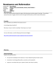 Renaissance and Reformation Content Area: Course(s): Time Period: Length: Status: Social Studies Generic Course, Social Studies, Science, Social Studies 1 7 weeks Weeks Published Unit Overview In this unit, students will learn about the origins of the Renaissance and the spread of new ideas. They will also examine the power struggles within the church through the Reformation and the Counter-Reformation. Transfer How is individual success different from group success? Is technology always beneficial? What does it mean to reform something? What impact can it have? For more information, read the following article by Grant Wiggins. http://www.authenticeducation.org/ae_bigideas/article.lasso?artid=60 Meaning Understandings Students will understand that... the quest for knowledge and the emphasis on reason helped bring about modern culture. innovations in technology affect politics, economics, and everyday life. exposure to new ideas often spurs a period of artistic and cultural creativity. Essential Questions Students will keep considering... What distinguishes one culture from another? How should we handle conflict? Application of Knowledge and Skill Students will know... Students will know... 24.1 how the changes that took place during the Renaissance broke down feudal order. why the Renaissance began in the city-states of Italy. 24.2 how classical thought inspired the new learning of the Renaissance. the changes in subject and style that made Renaissance art differ from medieval art. 24.3 the effect that Renaissance ideas had on Northern Europe. how the invention of the printing press helped spread Renaissance learning. 24.4 how Renaissance art and architecture shaped Western ideas of beauty. the names and works of major Renaissance artists and writers. 25. 1 how Martin Luther's effort to reform the Catholic Church led to the founding of Protestant churches. how Protestantism spread in Europe. 25.2 how the Jesuit order began and what role it played in the Counter-Reformation. how the Council of Trent responded to the Protestant Reformation. 25.3 how the Reformation and Counter-Reformation led to religious conflicts in Europe. the long-term impacts of the Reformation. Students will be skilled at... Students will be skilled at... 24.1 analyze the causes and effects of the changes that took place during the Renaissance. 24.2 compare and contrast the art and learning of the Renaissance and medieval periods. analyze political, economic, military, and cultural methods used to gain power. 24.3 identify the main ideas and details about the Northern Renaissance. take a stand on the practice of censorship. 24.4 summarize important artistic and literary achievements of the Renaissance. develop an understanding of how linear perspective changed art. 25.1 name causes and effects of the Reformation. ask questions about Luther's efforts at reform and the Catholic response. 25.2 summarize the accomplishments of the Counter-Reformation. identify main ideas and supporting details of the Council of Trent. 25.3 put the religious conflicts of the 1500s and 1600s in chronological order. analyze the possible consequences of political decisions. Academic Vocabulary 24.1 mercantile Renaissance patron 24.2 humanism secularism vernacular individualism 24.3 utopia satire engraving censor 24.4 proportion linear perspective sonnet picaresque 25.1 Reformation indulgence recant sect predestination theocracy 25.2 Counter-Reformation Jesuits Council of Trent ghetto 25.3 annulment Act of Supremacy Huguenots edict armada federalism Learning Goal 1 The emergence of empires in Europe resulted from the promotion of interregional trade, cultural exchanges, new technologies, urbanization, and centralized political organization. The rise and spread of new belief systems unified societies, but they also became a major source of tension and conflict. While commercial and agricultural improvements created new wealth and opportunities for the empires, most people’s daily lives remained unchanged. SOC.5-8.6.2.8.4 SOC.5-8.6.2.8.A.4.a SOC.5-8.6.2.8.A.4.b SOC.5-8.6.2.8.A.4.c SOC.5-8.6.2.8.B.4.a SOC.5-8.6.2.8.B.4.b SOC.5-8.6.2.8.B.4.e SOC.5-8.6.2.8.B.4.g SOC.5-8.6.2.8.C.4.a SOC.5-8.6.2.8.C.4.b SOC.5-8.6.2.8.C.4.c SOC.5-8.6.2.8.C.4.e SOC.5-8.6.2.8.D.4.b SOC.5-8.6.2.8.D.4.c SOC.5-8.6.2.8.D.4.d SOC.5-8.6.2.8.D.4.e SOC.5-8.6.2.8.D.4.f SOC.5-8.6.2.8.D.4.j MA.6.6 LA.6-8.CCSS.ELA-Literacy.CCRA.R.1 LA.6-8.CCSS.ELA-Literacy.CCRA.R.2 LA.6-8.CCSS.ELA-Literacy.CCRA.R.3 LA.6-8.CCSS.ELA-Literacy.CCRA.R.4 LA.6-8.CCSS.ELA-Literacy.CCRA.R.5 LA.6-8.CCSS.ELA-Literacy.CCRA.R.7 LA.6-8.CCSS.ELA-Literacy.CCRA.R.8 LA.6-8.CCSS.ELA-Literacy.CCRA.R.9 LA.6-8.CCSS.ELA-Literacy.CCRA.R.10 LA.6-8.CCSS.ELA-Literacy.RH.6-8.1 LA.6-8.CCSS.ELA-Literacy.RH.6-8.2 The emergence of empires (i.e., Asia, Africa, Europe and the Americas) resulted from the promotion of interregional trade, cultural exchanges, new technologies, urbanization, and centralized political organization. The rise and spread of new belief systems unified societies, but they also became a major source of tension and conflict. While commercial and agricultural improvements created new wealth and opportunities for the empires, most people's daily lives remained unchanged. Analyze the role of religion and other means rulers used to unify and centrally govern expanding territories with diverse populations. Compare and contrast the Japanese and European systems of feudalism and the effectiveness of each in promoting social, economic, and political order. Determine the influence of medieval English legal and constitutional practices (i.e., the Magna Carta, parliament, and the development of habeas corpus and an independent judiciary) on modern democratic thought and institutions. Explain how geography influenced the development of the political, economic, and cultural centers of each empire and well as the empires' relationships with other parts of the world. Assess how maritime and overland trade routes (i.e., th