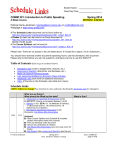 Student Name: Class Day/Time: COMM 301: Introduction to Public Speaking 8-Week Course Spring 2014 REVISED: 4/28/2014 Patricia Harris-Jenkinson, harrispa@scc.losrios.edu or profphj@gmail.com Webpage is http://www.profpj.com This Schedule Links document can be found online at: http://scc.losrios.edu/~harrispa/sched/ps/scc/c301_sched_8wk.rtf Grades (to date) can be found in an Excel document at: http://scc.losrios.edu/~harrispa/grades/ps/scc/grades_301_8wk.xls KNOW YOUR ALIAS! The Course Syllabus can be found at: http://scc.losrios.edu/~harrispa/syllabi/ps/scc/c301_syllabus_8wk.rtf Please note: There are no spaces in the urls listed above. If it looks like a space, it’s an underscore _ You should have received another document explaining how to use this Schedule Links document. Please refer to that before you ask me questions. And figure out how to use this EARLY!!! Table of Contents (click to go to sections below) • • • • • • Schedule Links (Links to assignments, lectures, etc.) Assignment Specifics (time limits, oral footnotes, etc.) Make-Up Speech Policies/Caveats Late Assignments/Make-Up Exams/In-Class Activities Additional Links (look here for additional resources) URLs (if the links in the Schedule Links table don’t open) Schedule Links (NOTE: Subject to change! Pay attention in class and keep checking the electronic copy for changes!) What are we Doing? What should be Read by this date? What is Due? L: Introduction to Class/Web Enhancement (0.50) ACTIVITY: What is a Competent Speaker? (0.50) L: Delivery (1.00)– R: Ch. 16 (Methods of Delivery), 17 (Nonverbal Comm), 18 (Verbal Comm), 19 (Delivering Your Speech) L: Bag Speech Assignment Discussion (0.25) Discussion: Life Stories Mini-Impromptus Wed 3/19 Assigned: Read Course Syllabus and Schedule & complete student information sheet (link is above) Print out Schedule Links document Get pre-req verification (if needed) Life Stories Mini-Impromptus (you can’t prep much for these) Bag Speech (See Assignment Specifics near the end P. Harris-Jenkinson Spring 2014 Note: Schedule is Subject to Change SCC: COMM 301 page 1 of 12 of this document, and grading rubric) Speech Worksheet Assignment Explained (this applies to ALL speech worksheets) assignments Bag Speech Worksheet View the Speech Anxiety video lectures before next class Speech Anxiety: What/Causes: Video: 14:19 Speech Anxiety: Symptoms, Beliefs, Treatments: Video: 14:24 Speech Anxiety: When, More Suggestions: Video: 13:26 View the Comm Models video lectures before next class Comm Models: Basics: Video: 4:59 Comm Models: Tweaking: Video: 8:47 Comm Models: Differences, Principles & Myths: Video: 9:48 Please read Minor Tasks for speeches Discussion/Activity: Speech Anxiety (0.50) - R: Ch. 1 (Speaking in Public), 4 (Improving Your Confidence) Discussion/Activity: Communication Models video lectures (0.50) L: Listening/Evaluating (0.75) – R: Ch. 5 (Listening) DO: Life Stories Mini-Impromptus (0.75) L: Informative Speech (0.25—topic discussion) Discussion: Minor Tasks for speeches Final questions/hints on Bag Speech & Bag Speech Worksheet (YOU COME TO CLASS WITH QUESTIONS!) Mon Wed 3/24 3/26 Assigned: Info Prep Worksheet #1 (5 Topics/Aud Relevance) R: Ch. 2 (Audience-Centered Process), 8 (Developing Speeches), 3 (Ethics/Free Speech) View the What Makes A Good Speech? Video before next class Criteria for a Good Speech: Video: 13:54 View the Speech Prep video lectures before next class Speech Prep: Types, Basic Organization, Keys to Success: Video: 10:21 Speech Prep: Info Speech Topic Selection: Video: 8:49 DO: Bag Speeches (ALL) Please read Make-Up Speech Caveat at end of this document! Assigned: View Source Citation, Speech Prep: Drill Down, and Demonstration Speech video lectures before next class Source Citations: What, When, How (Orally): Video: 13:31 Source Citations: What, When, How (Written): P. Harris-Jenkinson 8–week class Spring 2014 Note: Schedule is Subject to Change DUE: Schedule Links Printout (go online and find this document—url listed above—and print out a copy to bring to class) DUE: Pre-Req Verification DUE: Student Info Sheet (copy in the syllabus) DUE: Life Stories Mini-Impromptus Remember to download the Speech Worksheet template for your Bag Speech View the Speech Anxiety Video Lectures before class (links are on previous day) View the Comm Models Video Lectures before class (links are on previous day) Please read Minor Tasks for speeches Don’t forget those online quizzes! DUE: Bag Speeches & Bag Speech Worksheet (due on scheduled speech day)—See Assignment Specifics View the Speech Prep Basic Concepts: Types, Basic Organization, Keys to Success before class (links are on previous day) View the Speech Prep: Info Speech Topics before class (links SCC: COMM 301 page 2 of 12 Video: 9:54 Speech Prep: Drill Down: Video: 13:01 Speech Prep: Demonstration Speech: Video: 9:22 Mon 3/31 DISCUSSION: Informative Speech/Clarification of assignment (0.75) – R: Ch. 22 (Informative), 10 (Supporting) 11 (Organizing), 12 (Intro), 13 (Conclusion) DISCUSSION: Source Citations Video Lecture (0.25) - R: Ch. 9 (Gathering Support) Info Speech Topic Review (0.50) View Sample Informative Speeches (0.75) Test 1 Review (study before coming; please bring study guide!) Whiteboard Activity Assigned: Informative Speech (& Outlines) (See Assignment Specifics near the end of this document, and grading rubric); download the outline template and check out the sample outline Work-Up Speeches 1: Pet Peeve TEST 1: Chapters 1, 2, 3, 4, 5, 8, 9, 10, 11, 12, 13, 16, 17, 18, 19, 22 and accompanying lectures (including the video lectures) Test 1 Debrief (0.25) DO: Work-Up Speeches 1: Pet Peeve (1.0) Wed Mon 4/2 4/7 Assigned: Info Prep Worksheet #2 (Research/Org/Aids) Work-Up Speeches: Informative Speech Progress (What topic/why you chose it; challenges) View Outlining video lectures before next class Outlining: What, When to Use, Types: Video: 4:44 Outlining: Formal Outline Str