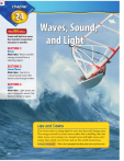Sound and light are waves that transfer energy from one place to another. Waves, Sound, and Light SECTION 1 Waves Main Idea Waves transfer energy outward from a vibrating object. SECTION 2 Sound Waves Main Idea Sound is a compressional wave that travels only through matter. SECTION 3 Light Main Idea Light waves are electromagnetic waves that travel in matter or space. Ups and Downs This wind surfer is riding high for now, but that will change soon. The energy carried by ocean waves makes this a thrilling ride, but other waves carry energy, too. Sound waves and light waves carry energy that enable you to hear and see the world around you. Science Journal 692 Mark A. Johnson/CORBIS Write a short paragraph describing water waves you have seen. Start-Up Activities Wave Properties If you drop a pebble into a pool of water, you notice how the water rises and falls as waves spread out in all directions. How could you describe the waves? In this lab you’ll make a model of one type of wave. By describing the model, you’ll learn about some properties of all waves. Waves Make the following Foldable to compare and contrast the characteristics of transverse and compressional waves. STEP 1 Fold one sheet of lengthwise paper in half. STEP 2 Fold into thirds. 1. Make a model of a wave by forming a piece of thick string about 50-cm long into a series of S shapes with an up and down pattern. 2. Compare the wave you made with those of other students. Notice how many peaks you have in your wave. 3. Reform your wave so that you have a different number of peaks. 4. Think Critically Write a description of your wave model. How did the distance between the peaks change as the number of peaks increased? Preview this chapter’s content and activities at blue.msscience.com STEP 3 Unfold and draw overlapping ovals. Cut the top sheet along the folds. STEP 4 Label the ovals as shown. Transverse Waves Both Compressional Waves Construct a Venn Diagram As you read the chapter, list the characteristics unique to transverse waves under the left tab, those unique to compressional waves under the right tab, and those characteristics common to both under the middle tab. 693 Mark A. Johnson/CORBIS Learn It! Make connections between what you read and what you already know. Connections can be based on personal experiences (text-to-self), what you have read before (text-to-text), or events in other places (text-to-world). As you read, ask connecting questions. Are you reminded of a personal experience? Have you read about the topic before? Did you think of a person, a place, or an event in another part of the world? Practice It! Read the excerpt below and make connections to your own knowledge and experience. What caused the loudest sound you ever heard? According to the preceding section, what must an object do to produce waves? How does the motion of a drummer’s drumsticks produce sound waves? The impact of the sticks on the head of a drum causes the drum head to vibrate. These vibrations transfer energy to nearby air particles, producing sound waves in air. You can hear the sound because energy from the drums travels as sound waves to your ears. Every sound you hear is caused by something vibrating. —from page 701 How does a guitar player make a guitar produce sound? Apply It! As you read this chapter, choose five words or phrases that make a connection to something you already know. 694 A CHAPTER 24 Waves, Sound, and Light Use this to focus on the main ideas as you read the chapter. Before you read the chapter, respond to the statements below on your worksheet or on a numbered sheet of paper. • Write an A if you agree with the statement. • Write a D if you disagree with the statement. with ctions laces, or e n n o c ts, p Make le even . The better b a r o m life me in your ore people ection, the m er. n b the con u will remem o likely y After you read the chapter, look back to this page to see if you’ve changed your mind about any of the statements. • If any of your answers changed, explain why. • Change any false statements into true statements. • Use your revised statements as a study guide. Before You Read A or D Statement After You Read A or D 1 As the wavelength of light waves increases, the frequency also increases. 2 Loud sounds can permanently damage your ears. 3 The energy carried by a wave depends on the speed of the wave. 4 Different colors of light have different wavelengths. Print out a worksheet of this page at blue.msscience.com 5 Sound waves with a low frequency have a low pitch. 6 Waves transfer matter from one place to another. 7 Light cannot travel through empty space. 8 The human eye can detect waves in most of the electromagnetic spectrum. 9 Sound waves travel faster in warmer air than in cooler air. 10 Refraction occurs when waves change speed going from one material to another. 694 B Waves What are waves? ■ ■ ■ ■ Explain how waves transport energy. Distinguish among transverse, compressional, and electromagnetic waves. Describe the properties of waves. Describe reflection, refraction, and diffraction of waves. When you float in the pool on a warm summer day, the upand-down movement of the water tells you waves are moving past. Sometimes the waves are so strong they almost push you over. Other times, the waves just gently rock you. You know about water waves because you can see and feel their movement, but there are other types of waves, also. Different types of waves carry signals to televisions and radios. Sound and light waves move all around you and enable you to hear and see. Waves are even responsible for the damage caused by earthquakes. Waves Carry Energy, not Matter A wave is a disturbance Devices such as televisions, radios, and cell phones receive and transmit information by waves. Review Vocabulary density: the mass per cubic meter of a substance New Vocabulary •• wave transverse wave wave •• compressional wavelength •• frequency law of reflection •