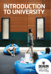 INTRODUCTION TO UNIVERSITY YOUR FUTURE Now is the time to start thinking about your options for further study. University offers a world of possibilities. Most courses require you to have studied certain subjects at VCE (or equivalent) level. This can include interstate qualifications, some TAFE qualifications or relevant work experience. It’s important to keep your options open. And that’s what this guide is about – helping you to make the right choices now, to ensure you reach your career goals. WHAT IN THE WORLD IS ‘WORLDLY’? Watch a YouTube video: deakin.yt/what-is-worldly. ‘Every day I experience Deakin’s technologysavvy facilities, from the computer labs to interactive lecture devices and even the amazing science equipment.’ ASHLEY CHAN ASHLEY CHAN Bachelor of Vision Science Bachelor of Vision Science Read Ashley’s story at deakin.is/ashley-chan. Read Ashley’s story at deakin.is/ashley-chan. GETTING STARTED What are your skills and interests? •• What subjects do you like? •• Do you excel in any particular subject or study area? •• What are you interested in? •• What inspires you? •• Do you volunteer, play sport or are you involved in a music group or other activity? Is university for you? •• Does the job or career you want require a degree or university qualification, such as nursing, law or teaching? •• Will having a degree help you succeed in your field of interest? Research, research, research •• Talk with your parents, teachers, careers practitioners, friends and colleagues about the subject options available at school and how they’re relevant to courses and jobs you’re interested in. •• Check the subject prerequisites and extra requirements for all of the courses you are interested in. There may be prerequisites and extra requirements for school-leavers as well as for non school-leavers. Find out about prerequisites at deakin.edu.au/study-at-deakin/ find-a-course. •• You can find out about extra requirements on the VTAC website www.vtac.edu.au and in Victorian Tertiary Entrance Requirements (VICTER) publications. •• Look at careers and employment opportunities available from your preferred courses at deakin.edu.au/yourcourse-yourcareer. •• Consider work experience in areas that appeal to you. SCHOOL TAFE UNI WORK FORCE Weekly contact hours 30 25–35 8–25 Up to 40 Course length HOW DOES UNI COMPARE? Six years (VCE or equivalent, two years) Four months– two-and-a-half years Two–six years Varies Class structure Classes, 25 people, one teacher per subject Classes and workshops, 12–20 people, one teacher per subject Style of learning Hands-on and theory Hands-on and theory Mostly theory but can be hands on On the job Qualifications VCE, VCAL or International Baccalaureate (IB) Certificate I, II III, IV, diploma, advanced diploma Associate degree, bachelor’s degree, combined course or concurrent course None Teachers Lectures, up to 700 people High school teachers Industry trained Academics, researchers, industry professionals Managers/ mentors *Check with individual institutions for specific details. Tutorials and practicals 15–30 people, one subject teacher (tutor) No classes ‘I was lucky enough to receive 8 credits from my TAFE diploma. This meant I had essentially taken a full year off my Deakin combined course.’ ANDREW CONTE Bachelor of Design (Architecture)/Bachelor of Construction Management Read Andrew’s story at deakin.is/andrew-conte. ‘All the lecturers know me by name and we chat whenever I see them around campus. You can always ask them for help.’ SHAUN CHUNG-BUCKLAND Bachelor of Commerce Read Shaun’s story at deakin.is/shaun-chung-buckland. WANT MORE INFORMATION? We’ve got lots of useful information on our website deakin.edu.au. You can also find out about coming events by visiting deakin.edu.au/study-at-deakin/ important-dates. YOU MIGHT ALSO FIND SOME OF THESE SITES HANDY: Victorian Tertiary Admissions Centre (VTAC) www.vtac.edu.au Career exploration and information service. www.myfuture.edu.au Australian Government site providing advice for young people thinking about their future and looking for work. www.youth.gov.au Information about jobs and careers. www.youthcentral.vic.gov.au Information on education and training options open to the community including apprentices, trainees, students, teachers, trainers, businesses and employers. www.skills.vic.gov.au Higher education options in Australia. www.studyassist.gov.au LEARNING THE LINGO Associate degree A two-year, full-time (or part-time equivalent) program designed for students who may benefit from a supported entry to tertiary study. It provides flexible pathways into university, and can be used as a guaranteed pathway into a range of approved degrees. Visit deakin.edu.au/doorstep. Class A general meeting for all enrolled students, for which students do not need to register, and where teaching staff engage students through presentations and learning activities. Formerly known as lecture. Bachelor’s degree Prerequisites The VCE subjects or other requirements that applicants must complete to be eligible for a course. More info: www.vtac.edu.au. Scholarships Deakin offers a range of scholarships, including academic scholarships for highachievers and access and equity scholarships. Visit deakin.edu.au/scholarships. Seminar A more interactive meeting than a class, for smaller groups of students. Formerly known as tutorial or workshop. Study score Normally the first university course undertaken, also known as an undergraduate award. A score of 0–50 that shows how a VCE student performed in a particular subject compared to other students in the same year throughout the state. Faculty Undergraduate degree An organisational division in a university; for example, the Faculty of Arts and Education is one of the four faculties at Deakin University. Within each faculty are several schools, e.g. the School of Law is in the Facu