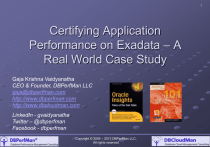1 Certifying Application Performance on Exadata – A Real World Case Study Gaja Krishna Vaidyanatha CEO & Founder, DBPerfMan LLC gaja@dbperfman.com http://www.dbperfman.com http://www.dbcloudman.com LinkedIn - gvaidyanatha Twitter – @dbperfman Facebook - dbperfman Copyright © 2004 – 2013 DBPerfMan LLC, All rights reserved 2 Due to certain unavoidable circumstances, the white paper will not be available for this presentation. The inconvenience is regretted! Copyright © 2004 – 2013 DBPerfMan LLC, All rights reserved Welcome! Visit us at http://www.dbperfman.com and http://www.dbcloudman.com 3 Do not believe anything simply because… 1. You have heard it 2. It is spoken and rumored by many 3. It is found written in books 4. Of the forced authority of your teachers and elders 5. They have been handed down for many generations Copyright © 2004 – 2013 DBPerfMan LLC, All rights reserved 4 Believe in something simply because… 1. The experiment/test you conducted is true 2. Your observation and analysis provided you mathematical data 3. Your data agrees with normal reasoning and rationale Copyright © 2004 – 2013 DBPerfMan LLC, All rights reserved 5 Who am I and what have I done in life? 1992 - First database - Oracle 6.0.31… 2000 - Compulsive Tuning Disorder (CTD) 2000 - Product Management at Quest Software 2002 – Product Management of OEM 10g at Oracle Corp. 2004 - DBPerfMan LLC Copyright © 2004 – 2013 DBPerfMan LLC, All rights reserved 6 Two Hour Execution Plan 7 Exadata – What & Why? Oracle Instance & Database Setup Web Logic Configuration Oracle Net Optimizations Partitioning Decisions Parallelism – Application vs. Database Analysis of low-level traces Hybrid Columnar Compression Findings Issues faced, battles fought and workarounds Performance Numbers Conclusion Note: All settings, findings and information presented in this talk are relevant to the application that was certified. No generalizations of any nature should be assumed or made. The reader is expected to perform the required testing in his/her environment and engage in data-driven decisions. Copyright © 2004 – 2013 DBPerfMan LLC, All rights reserved 8 Exadata – What & Why? Copyright © 2004 – 2013 DBPerfMan LLC, All rights reserved 9 What is Exadata? Exadata = Hardware + software from Oracle Primary focus = Solving the I/O problem regardless of size Copyright © 2004 – 2013 DBPerfMan LLC, All rights reserved Exadata – Picture Tour Copyright © 2004 – 2013 DBPerfMan LLC, All rights reserved 10 Exadata – Picture Tour Copyright © 2004 – 2013 DBPerfMan LLC, All rights reserved 11 Exadata – Picture Tour Copyright © 2004 – 2013 DBPerfMan LLC, All rights reserved 12 Exadata – Picture Tour Copyright © 2004 – 2013 DBPerfMan LLC, All rights reserved 13 Exadata – Facts Copyright © 2004 – 2013 DBPerfMan LLC, All rights reserved 14 15 Why Exadata? Smart Scans Storage Indexes ~ Sherlock Holmes’ quote to Dr. Watson Database footprint reduction Scalable Performance – H/W, Partitioning, Parallelism Platform for Data Consolidation Copyright © 2004 – 2013 DBPerfMan LLC, All rights reserved Performance Tuning Paradigm Shift Smart scans vs. Buffer Cache Getting more smart scans <> More full scans Bigger Caches vs. Smaller Caches Over-indexing vs. Under-Indexing Retrieve ONLY what you want Copyright © 2004 – 2013 DBPerfMan LLC, All rights reserved 16 Fundamental Issues that no Super Computer can fix! High DB Logins Excessive SQL Executions No Shared SQL Serialization Over-Parallelism CUI Copyright © 2004 – 2013 DBPerfMan LLC, All rights reserved 17 18 Order of Magnitude (OM) Testing! Measure and trend LIO and Elapsed Time Data Volume Testing (in rows) 1 10 100 1000 10000 100000 1000000 Copyright © 2004 – 2013 DBPerfMan LLC, All rights reserved 19 Certification Configuration Database - Oracle Exadata X2-2 (¼ rack) 2 compute nodes (2-node Oracle RAC, 12 cores-96GB/node) 3 storage nodes with high-performance drives 2 InfiniBand Switches Oracle Version – 11.2.0.3.14 with some one-off patches Java Application with 7.8 million lines in multiple WebLogic Clusters Copyright © 2004 – 2013 DBPerfMan LLC, All rights reserved Exadata X2-2 ¼-rack – Baseline Calibrated Storage Performance Disk random read throughput >= 5.4 GB/sec Flash random read throughput >= 12.6 GB/sec Disk IOPS = 14,804 67.55 μs per I/O call Flash IOPS = 432,540 2.31 μs per I/O call Controller throughput >= 5.5 GB/sec Copyright © 2004 – 2013 DBPerfMan LLC, All rights reserved 20 21 Oracle Instance & Database Setup Copyright © 2004 – 2013 DBPerfMan LLC, All rights reserved 22 Oracle Initialization Parameters - I _direct_read_decision_statistics_driven = TRUE Defaults to TRUE in 11.2.0.2 Runtime decision based on the HWM of the segment (from stats) not Seg. Hdr(actual count of blocks). _serial_direct_read = TRUE Pre-requisite for smart scans _small_table_threshold = 1000 Defaults to some % of db_buffer_cache for Auto SGA 11g – (value * 5) = start of direct reads 11gR2 – (value) = start of direct reads Acts as a stabilizer when Auto SGA Memory Mgt is in place Copyright © 2004 – 2013 DBPerfMan LLC, All rights reserved 23 Oracle Initialization Parameters - II _cell_storidx_mode = ALL Default = EVA EVA & KDST are Oracle Kernel Function names ALL = apply storage indexes for all comparison operations _fast_full_scan_enabled = TRUE _optimizer_skip_scan_enabled = TRUE optimizer_dynamic_sampling = 4 optimizer_index_cost_adj = 1000 _optim_peek_user_binds = FALSE Copyright © 2004 – 2013 DBPerfMan LLC, All rights reserved Oracle Initialization Parameters III _px_use_large_pool = TRUE paralllel_adaptive_multi_user = FALSE parallel_degree_policy = MANUAL _parallel_statement_queuing = TRUE Copyright © 2004 – 2013 DBPerfMan LLC, All rights reserved 24 Oracle Initialization Parameters IV lock_sga = TRUE sga_max_size = 36GB sga_target=0 _memory_imm_mode_without_autosga = FALSE Copyright © 2004 – 2013 DBPer
