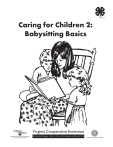 18 USC 707 Caring for Children 2: Babysitting Basics Project Advisors Barbara Briscoe, Extension 4-H agent, Baltimore City* Billie H. Frazier, Extension human development specialist, Department of 4-H and Home Economics, University of Maryland Jacqueline C. Gray, Extension 4-H agent, St. Mary’s County* Hope M. Jackson, Extension 4-H agent, Howard County* Edith C. Williams, Extension 4-H programs and activities specialist, Department of 4-H and Home Economics, University of Maryland Project Evaluators Kim Burton, Extension program assistant, Baltimore County* Charles County Day Camp* Faith Connors, Extension 4-H agent, Charles County* Jean Greene, Extension 4-H area agent, Dorchester County Howard County 4-H Club* Viola Mason, Extension 4-H agent, Prince George’s County* Donna Jones Mohler, Extension volunteer, Charles County* Kelly Quinn, 4-H junior leader, Howard County* Mary Lee Quinn, 4-H project leader, Howard County* Lois Smith, Extension 4-H program development specialist, Cooperative Extension Program, University of Maryland Eastern Shore Jane Stull, Extension volunteer, Howard County* *Maryland Cooperative Extension Service Table of Contents Introduction.............................................................................................................................................. 1 Lesson 1: Getting Started......................................................................................................................... 3 Lesson 2: Roles and Responsibilities....................................................................................................... 7 Lesson 3: Keeping Children Safe.......................................................................................................... 11 Lesson 4: Handling Accidents and Emergencies................................................................................... 17 Lesson 5: Follow the Routine................................................................................................................ 21 Lesson 6: Feeding Young Children........................................................................................................ 25 Lesson 7: Bedtime and Naps.................................................................................................................. 31 Lesson 8: Toys....................................................................................................................................... 35 Lesson 9: Games Children Play............................................................................................................. 39 Lesson 10: Infants are Special............................................................................................................... 45 Prepared by Claudia H. Payne, curriculum specialist, Department of 4-H and Home Economics, University of Maryland Reviewed for Virginia use by Melanie Sope, Extension Agent, 4-H Camping, Page County Revised layout by Agriculture and Extension Communications, Virginia Tech Acknowledgments: Kathleen Jamison, Ph.D., 4-H Curriculum and Learning Specialist ii Introduction What Will I Learn? If you want to progress faster, discuss your ideas with your leader or the 4-H agent. “Babysitting Basics” teaches you skills that will help throughout your life – 4-H calls these “life skills.” This project teaches many life skills: • • • • • • • Year One esponsibility R Understanding self Problem solving Decision making Communication Leadership Acquiring knowledge 1. A ttend all club project meetings. 2. Visit the public or school library and review books and leaflets about children and the care of children. Make a reference list for future use. 3. Visit a nursery, preschool, or day-care center. Interview one of the caregivers. 4. Make a notebook for recording details about children and families. 5. Make a babysitting kit or a first-aid kit. 6. Create a toy or game for a young child. 7. Give a talk or a demonstration about a babysitting responsibility. 8. Exhibit at least one of the following at a county or state event: • First-aid kit • Babysitting kit for a specific age group • Toy for a specific age group • Game for a specific age group • Babysitter’s scrapbook for a specific age group 9. Make a display: • “What children do at different ages” • “Kitchen safety” • “Child safety” • “Toy safety” • “Bath safety” 10. Turn in a completed project record sheet to the project leader. You can, with help from your club leader, 4-H agent, parents, and others, become a first-rate babysitter. You will learn • the roles and responsibilities of babysitters and parents of young children; • how to care for and keep infants and young children safe and happy; • how to solve problems related to minor accidents, emergencies, and behavior; • to understand the physical, social, mental, and emotional characteristics of young children; and • how to communicate with young children during playtime using toys and games. Project Requirements The “Babysitting Basics” project is for 4-H members or any youth 13 years of age and older. The project is for teens who • love children and like to take care of them, • have younger brothers or sisters, • want to learn more about children, or • want to earn money by babysitting. Year Two 1. A ttend all project meetings. If you can not attend all meetings, complete each lesson and all activities. 2. Read a book or review materials about babies and young children 3. Make a babysitting kit (minimum 10 items) for a 4- to 5-year-old. 4. Create a toy or game for a young child. 5. Babysit at least three children. “Babysitting Basics” can be used for up to three project years. At the end of each lesson, there is a suggested list of things to do. These activities should be done in the second and third years of the project. Your 4-H club leader will help you select the content and activities acceptable for