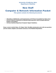 University of California, Davis Department of Nutrition New Staff Computer & Network Information Packet This packet contains the following documents: □ □ □ Attestation of Notification and Comprehension of UC Davis Acceptable Use Policy Form UC Davis Nutrition Department Frequently Asked Questions about Computer/Network Policies & Procedures UC Davis Nutrition Department Computer Support Guidelines Please contact Jennifer Ruhe, 3113 Meyer Hall, 752-4650, jruhe@ucdavis.edu with any questions you have about computer and network resources in the Nutrition Department. Packet updated 12/6/2011 page 1 of 15 This page intentionally left blank Packet updated 12/6/2011 page 2 of 15 University of California, Davis Department of Nutrition Attestation of Notification and Comprehension of UC Davis Acceptable Use Policy _____________________________ Employee Name ____________________________ Employee ID Number _____________________________ Employee Email Address ____________________________ Supervisor’s Name _____ I have read and understood the UC Davis Acceptable Use Policy (PPM Section 310-23 Exhibit A) _________________________________ Signature Packet updated 12/6/2011 __________________ Date page 3 of 15 This page intentionally left blank Packet updated 12/6/2011 page 4 of 15 FREQUENTLY ASKED QUESTIONS ABOUT UC DAVIS NUTRITION DEPARTMENT COMPUTER & NETWORK POLICIES & PROCEDURES QUESTION: I am new to the department and need a UC Davis computing account. How do I get one? All faculty, students, and staff are eligible for a UCD Computing account, which can be used for email, the MyUCDavis web portal, and access to campus computer labs. If you have access to a computer connected to the Internet, go to http://computingaccounts.ucdavis.edu/ and click on “Get your UC Davis computing account.” If you do not have access to a computer connected to the Internet, then you can go in person to IT Express in Shields Library room 182 – if you are a new staff member, be sure to check with department personnel staff to make sure that your information has been entered into the campus payroll system. You may want to call IT Express before walking over to check their hours and find out what you need to bring with you (such as photo ID card, a printout of your personnel IDOC form, and/or your campus student/staff ID number). They can be reached at 530-754-HELP. QUESTION: How do I get an account to log onto a Nutrition Department workstation in my lab or office? Step 1: Sign the attestation form in this packet and return it to your account manager in the main admin office in 3135 Meyer. Step 2: Have your supervisor submit a System Access Request Form (http://nutaccounts.ucdavis.edu/ ) to request that your account be set up. Once your attestation form is on file with your account manager and your supervisor has submitted a System Access Request form requesting your account, department I.T. staff will create your account and contact your supervisor when it is ready for you to pickup from the I.T. office in 3113 Meyer (be sure to bring photo I.D. with you when you come to the office). If you have any questions about the above procedure, please see Jennifer Ruhe in 3113 Meyer. QUESTION: I have a laptop that I want to connect to the Internet while in Meyer Hall. How do I do that? The department has Moobilenet (the campus wireless network) installed in most of Meyer Hall so if you have a wireless network card in your laptop, this is easy! To find out more about Moobilenet, please visit their web site at http://wireless.ucdavis.edu/ or see Jennifer or Alex in 3113 Meyer. QUESTION: Does the Nutrition Department have A/V equipment that can be checked out by department employees? The department has one portable data projector, two PC laptops, one digital camera, and one video camera that are available for checkout by Nutrition Department employees. Note that both the Pran Vohra Room and the Hurley Room have data projectors available in the room. Contact the front desk of the main office in 3135 Meyer, 752-4645 for information on how to reserve the equipment. QUESTION: How can I set up a Google Calendar account so that I can access departmental calendars and share my calendar with others in the department? Please make an appointment with Alex Zingorenko (azingorenko@ucdavis.edu, 752-4650) to set up your Google Calendar account. QUESTION: Does the department have a computer lab? Yes! We have a computer lab open to all department employees including faculty, staff, and those graduate students whose major professor is a Nutrition Department faculty member. The computer lab is located in 3249 Meyer Hall and keys can be checked out at the front desk in 3135 Meyer Hall. There are 10 computers in the lab and available software includes: MS Office Professional 2007, Adobe Acrobat Professional 9, EndNote, ImageJ, Chromas, Illustrator, Photoshop, ChemDraw, Food Processor SQL, Jmp, SAS, SPSS, Minitab, SigmaPlot, SigmaScan,and SigmaStat. The lab is also equipped with two scanners. The Microtek scanner has standard scanner features as well as a transparency tray that can be used to scan a tray of slides. The HP scanner has a document feeder that can be used to scan stacks of paper (up to 40 pages at a time). Instructions on how to use the scanners to do things like scan slides, scan documents to PDF, or scan images to .jpg are posted on the wall in front of them. QUESTION: I have a personally owned laptop that I want to use to print to a network printer in Meyer Hall. How do I do that? For security reasons the department does not allow personally owned laptops to access our private wired network where our network printers reside. Additionally, because of a number of security issues and campus policies, access to network printers is not allowed from systems connected to the campus wireless network (Moobilenet). QUESTION: I have a problem with a department owned system. How can I get help? Users should submit all non-mission critic
