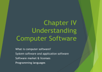 Chapter IV Understanding Computer Software What is computer software? System software and application software Software market & licenses Programming languages Chapter Objectives u Understand the role of software u Recognize and understand different categories of system software u Recognize and understand different categories of application software u Understand application software market u Understand programming languages and compilers What is Software? u Consists of programs designed to teach the hardware what, how, and when to perform u Provide programs and convert them into machine language (only language that a computer understand) u Can be compared to the nervous system in the human body u There are 2 functional or operational categories of software: u System software u Application software Two Types of Software System Software Application Software • Operating System • Utility programs • Drivers • Interface between hardware and users and peripherals • Teaches computer HOW to perform • Managerial and janitorial tasks • Provides services for people • Programs written to perform tasks • Word processor, spreadsheets, data base, presentation, etc… • Used by the users to tell the computer WHAT they need. Trends u There is a shift from a hardware view of computing to software & services "Ten years out, in terms of actual hardware costs you can almost think of hardware as being free -- I'm not saying it will be absolutely free -- but in terms of the power of the servers, the power of the network will not be a limiting factor," Gates said, referring to networked computers and advances in the speed of the Internet. Software/Hardware u u Relationship between types of software and hardware System software works as Interface between the hardware and the users and their applications. Application Software Users System Software Hardware 6 Operating System (OS) u Most important part of system software u Master controller of everything that happen in the computer system u Can be compared to the central nervous system in human body u OS was introduced early 1960s by IBM to power its computer IBM 360 and was behind its overwhelming success u Without OS, computers cannot run and manage several different applications OS Assignments u Allocates memory space for all components needed for the processing then manages and supervises the process. u Manage processor time and applications u Monitors input and output operations through interaction with their drivers and make sure all operations proceed in an orderly manner. u Monitors and enforces computer security with the help of firewall, anti-virus software OS Assignments u Provides needed help when users ask for help. u Provides user interfaces: u Menus and submenus u Command line interface u GUI (Graphical User Interface) User Interface Provided by the OS to enable users to communicate with computers. Excluding menus and submenus two types are available: u Command line interface u GUI (Graphical User Interface) u Only interface till the 80s u Can be a button, graphic or text u Only computer specialists can use it u Every body can use it Menus And Submenus 11 Operating System (OS) u u u OS and processor must be tuned to the same word size. The operating system comprises several components evolving around its core component known as “kernel”. Computer people, talk sometimes about kernel computing referring to the most important part of the operating system. When you start the computer the OS is loaded from HD into memory OS manages processor, memory & drivers, user interface & applications on storage OS remains in memory until computer is turned OFF 12 UNIX - LINUX UNIX u u u Linux Multi-user, multitasking Developed 1969 in assembly language , AT&T specialists at BELL labs Converted to C in 1973 so its Kernel can power OS of small mobile computers. u UNIX based u GNU kernel launched in 1983 by free software activists. u Thousands of programmers worldwide contributed to Linux development MAC/OSX u UNIX based operating system series marketed by Apple Inc. u A graphical interface OS u First version released in 1999 server edition. u iOS version runs on iPhone and iPod u Many versions are named after cat names: Leopard and Snow Leopard, Lion and Mountain lion. u The X relate to UNIX and to the roman 10 (OS/X = OS version 10) u OS/X includes its own development tools IDE (Integrated Development Environment) called XCODE provides interfaces to many compilers of several programming languages including C, C++ and JAVA. Android OS u Android was developed by Android Inc. designed for smartphones and tablet computers and other touch screen mobile devices and tablets. u Linux based operating system. u Google purchased the company in 2005 and it is developing Android presently. u Apps development teams of Google have come up with more than 700,000 apps by October 2012 (download via Google play) u 2010 (Android powered) smart phones become the world leading mobile platform. Its share of the market is 75%! (500 million devices) Symbian OS u Originally created by Symbian Ltd. u Most popular worldwide 37.6% of the global smartphone market until late 2010 when it was surpassed by Android. u Empowers most Nokia, Ericsson and European made smartphones. u Based on the graphical operating system EPOC (Electronic Piece Of Cheese). u Symbian share of the market is reduced presently to all time low of about 7%. u NOKIA shifted from Symbian to MS Windows phones 8 starting this year 2013 and Samsung did the same. Operating System u IBM Z/OS: Introduced October 2000 u 64 bits OS for mainframe server and powerful computers u Support old market computers u Accommodates u High all mainframe systems quality service u Support clustering. MS Windows u Most popular operating system ever because of its excellent graphical user interface that bridged the gap between the user and the computer making user friendly computers that can be used by everybody and business per