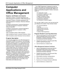 202 Computer Applications & Office Management Computer Applications and Office Management The COMP Department is designed to meet the needs of all students and working professionals with a desire to improve their computer skills. SBCC can design a personalized program of study to meet your needs for: Degrees, Certificates and Awards Associate in Science: Computer Applications and Office Management: Emphasis in Office Management Associate in Science: Computer Applications and Office Management: Emphasis in Business Software Specialist Certificate of Achievement: Computer Applications and Office Management: Emphasis in Business Software Specialist Certificate of Achievement: Computer Applications and Office Management: Emphasis in Office Management Skills Competency Award: Office Assistant Skills Competency Award: Computer Proficiency Online Skills Competency Award: Business Communications Program Description The Computer Applications and Office Management Department (COMP) is in business—the technology education business. We live in a culture governed by the demands of digital life. This digital life blurs and transforms old boundaries between work and home, public and private. It requires ever-increasing levels of technology literacy and competency. Computer software tools and devices constantly evolve and expand as well as the skills needed to use them COMP serves that need across the entire arc of digital life—whether your career is still in preparation (pre-career), in progress (workforce training), or in transition (changing careers or retirement). Our mission is to develop “technology-savvy adults” who possess literacy and competency in software productivity applications and tools that are part and parcel of our everyday lives—In the office, in the home office and in personal living. • An introductory course • A workshop to update your skills • An advanced skills class • A Skills Competency Award • A Certificate of Achievement • Professional certification • An Associate in Science Degree You can take COMP courses in the way that best fits your lifestyle and schedule. Class formats include: • On-campus/traditional • Evening • Online/distance learning • Self-paced lab instruction • Short courses • Credit for Work Experience Program Student Learning Outcomes 1. Use the intermediate and advanced features of Microsoft Office (Word, Excel, Access, PowerPoint, Outlook) proficiently, according to professional business standards 2. Integrate the programs in the Microsoft Office suite for maximum productivity 3. Use the Internet as a research tool Office Management Emphasis Certificate 1. Use the intermediate and advanced features of Microsoft Office (Word, Excel, Access, PowerPoint, Outlook) proficiently, according to professional business standards 2. Integrate the programs in the Microsoft Office suite for maximum productivity 3. Write effective business correspondence 4. Utilize correct accounting procedures 5. Supervise and manage employees effectively 6. Use the Internet as a research tool Santa Barbara City College Catalog 2011-2012 Computer Applications & Office Management 203 Department Offices Division: Business Education Department Chair: Mindy Mass (BC-306, ext. 2260) Dean: Diane Hollems Faculty and Offices Mindy Mass, Chair (BC-306, ext. 2260) Carol Diamond (BC-310, ext. 2416) College Requirements For complete information, see “Graduation Requirements” in the Catalog Index. Requirements for Certificate of Achievement: Computer Applications and Office Management — Emphasis in Office Management Requirements for Certificate of Achievement: Computer Applications and Office Management — Emphasis in Business Software Specialist The Associate Degree will be awarded upon completion of both department and college requirements. The Associate Degree will be awarded upon completion of both department and college requirements. ACCT 110 — Introduction to Accounting...............................4 Department Requirements (40.5-48 units) BUS 101 — Introduction to Business....................................3 COMP 103 — Internet Communications...............................1 Department Requirements (28.5-31.5 units) COMP 107 — Microsoft Word...............................................4 COMP 101 — Intro to Computer Applications.......................4 COMP 109 — Microsoft Excel...............................................4 COMP 103 — Internet Communications...............................1 COMP 111 — Microsoft Access.............................................4 COMP 107 — Microsoft Word...............................................4 COMP 112 — Microsoft PowerPoint.....................................4 COMP 109 — Microsoft Excel...............................................4 COMP 151AB — Beg Computer Keyboarding or.................3 COMP 111 — Microsoft Access.............................................4 COMP 153 — Review Computer Keyboarding.................2 COMP 112 — Microsoft PowerPoint.....................................4 COMP 161C — Business Career Success...........................3 COMP 139 — Social Networking for Business...................0.5 COMP 171 — Business English or.......................................3 COMP 144B — Google World...............................................3 COMP 271 — Business Communications.........................3 Choose two courses from the following: Select two courses from the following: ACCT 110 — Introduction to Accounting...............................4 COMM 161 — Bus and Professional Communication or COMM 162 — Mediated Bus and Professional Communication.................................................................3 ACCT 160 — Accounting with QuickBooks...........................3 BUS 101 — Introduction to Business....................................3 COMP 150 — Voice Recognition..........................................1 MAT 103 — Introductio