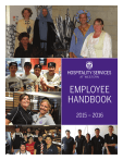 EMPLOYEE HANDBOOK 2015 – 2016 Welcome to Western! Congratulations and welcome! We are pleased to have you join our award-winning Hospitality Services team. You are part of our team because we feel you have the ability to live up to the high standards that we set for our division. The Hospitality industry is a competitive one and at Western, we continuously strive to offer the best in quality and service while going beyond the expectations of our guests. With sales of over $30 million annually, we feed over 25,000 people daily, challenging us to always improve and grow while ensuring that we achieve our goals and objectives. We consist of five distinct divisions–Campus Eateries, Residence Dining, Great Hall Catering, Western Vending Services and Conference Services as well as providing contract management to Ivey School of Business. While each area has its individual market sector, we are part of the same team, working toward common goals. Whether you are looking for a career, or simply a supplementary income, we will endeavour to make your experience with us a rewarding one. It is our objective to offer our staff competitive wages, training, flexible hours, 50% meal plan, free uniform, benefits and rewards for a job well done, and the ability to advance within the organization. Our leadership team maintains an open door policy and all staff are encouraged to bring forward any concerns and/or issues that might arise. Please feel free to approach your Supervisor or Manager at any time. I can, of course, also be contacted at: fmiller@housing.uwo.ca, or 519 661-4030. Please take the time to read this Employee Handbook carefully and return the signed acknowledgment form (page 45) to your Supervisor within two weeks of receiving this publication. Again, I am extremely pleased to welcome you to Hospitality Services at Western University and look forward to working with you. Sincerely, Frank Miller Director, Hospitality Services Room 130 • Lambton Hall • 1421 Western Road London, Ontario • Canada • N6G 4W4 www.hospitalityservices.uwo.ca SOME OF THE POLICIES AND PROCEDURES INCLUDED IN THIS PUBLICATION ARE SUBJECT TO CHANGE DURING THE 2015-2016 SCHOOL YEAR TABLE OF CONTENTS H O S P I T A L I T Y S E R V I C E S TABLE OF CONTENTS WELCOME TO WESTERN • How to handle concerns & complaints • Basics of proper service Letter from our Director......................................... 1 Telephone Numbers.................................................3 Divisional Goals........................................................4 Mission Statment.....................................................4 A bit about Hospitality Services............................6 • Meal Plans for Students and Staff • Gift Cards • Hours of Operation Nutrition Services....................................................8 • Nutrition Counselling • Workplace Wellness • Let’s Stretch Sustainability............................................................9 Administrative Requirements..............................10 • Time & Attendance •Payday • My Human Resources • Hospitality Services Staff Website •Parking • Staff Cards • Attendance Requirements • Late for Shift • Employee Development Plans • Job Postings • Call-In Procedures • Sick Time • Doctor’s Notes •Vacation • Statutory Holidays • Notification of Lay-off • Duty to Accommodate • Security Concerns Break Time at Western.......................................... 13 • Break Entitlement • Employee Meal Policy • Smoking Policy • Telephone & other office equipment Map of Western...................................................... 14 STANDARDS OF PROFESSIONAL ETHICS Personal Conduct & Attitude............................... 17 Dress Code.............................................................. 18 Non-Slip Shoes....................................................... 18 Non-Discrimination & Harassment...................... 19 Customer Service................................................... 21 • Give ‘em the PICKLE • Vital Verbals • Customer Service Tips • Team Power Serving for Hospitality Services..........................23 • Staff Empowerment TABLE OF CONTENTS (2) HEALTH & SAFETY AT WESTERN Working with Food................................................27 • Main causes of Food-Borne Illness • HACCP • Personal Hygiene • Hand Washing • Why Clean & Sanitize? • Food Contact Surfaces & Equipment •Temperatures • Storing Food •Cooling •Cross-Contamination • Do’s & Don’ts of Food Safety Washing Utensils & Equipment............................32 • Machine Washing • 2 Sink Method • 3 Sink Method Health & Safety in the Workplace.......................33 • Occupational Health & Safety • Policy on Emergencies •WHMIS • Food Allergies & Intolerances Managing Job Stress............................................ 38 SERVICES AT WESTERN Services.................................................................. 42 • Staff/Faculty Family Practice Clinic • Rehabilitation Services • The Chiropractic Clinic • Western On-Campus Pharmacy • Nutrition Services • Employee Assistance Programs • Department of Equity Services • Staff Development • Continuing Education • Educational Assistance • Western Film • The McIntosh Gallery • Western Foot Patrol • Library System •U.C.C. • Campus Recreation •Observatory • UCC Flexible Childcare Centre • University Child Care Hospitality Services Employee Handbook Acknowledgment................................................... 44 Hospitality Services New Hire Uniform Order Form............................................................. 46 EMPLOYEE HANDBOOK ADMINISTRATIVE & MANAGEMENT TEAM CAMPUS OPERATIONS NAME TITLE Susan Grindrod PHONE EMAIL BUILDING PHONE EMAIL Associate Vice President, Housing & Ancillary Services 519 661-3549 grindrod@housing.uwo.ca Arthur & Sonia Labatt Health Sciences Buil
